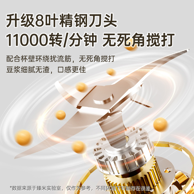 8叶精钢刀头,11000rpm转速搅打,干豆直打,轻松破豆,释放豆浆醇香