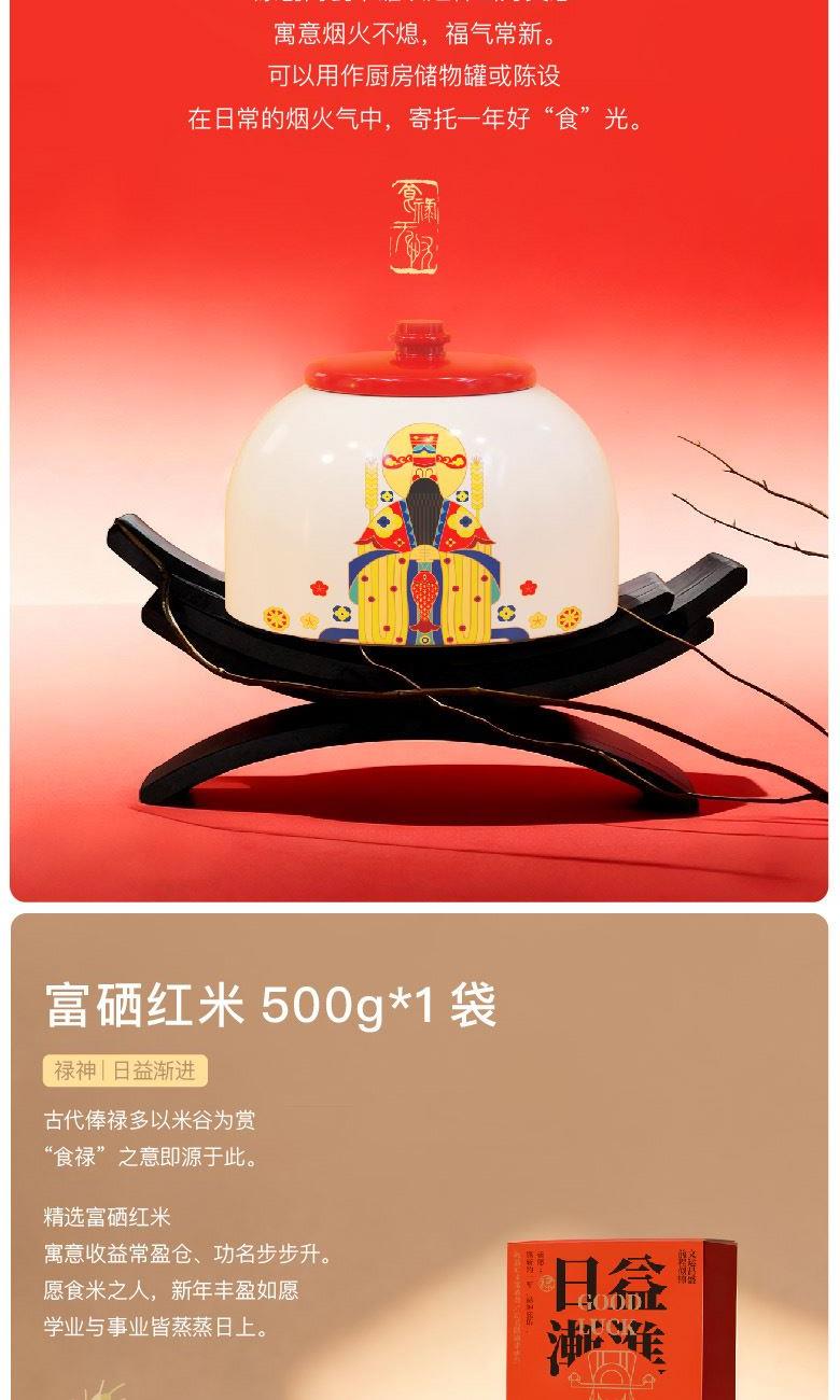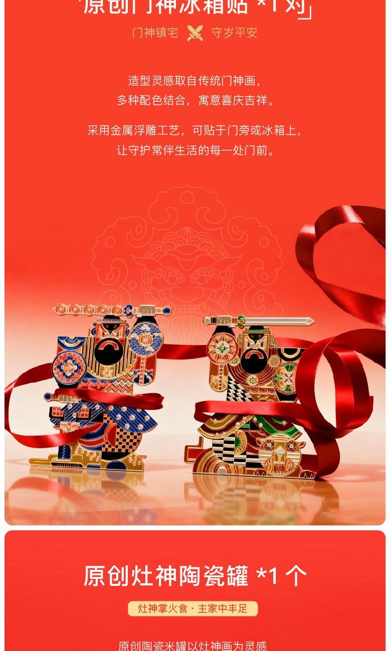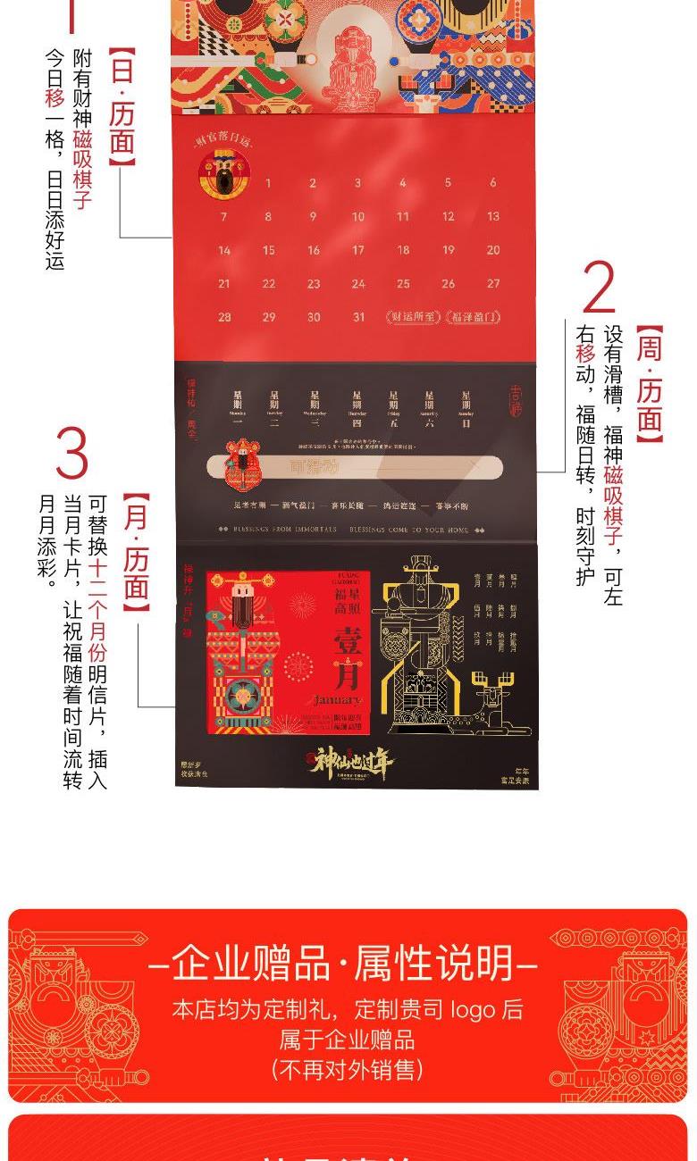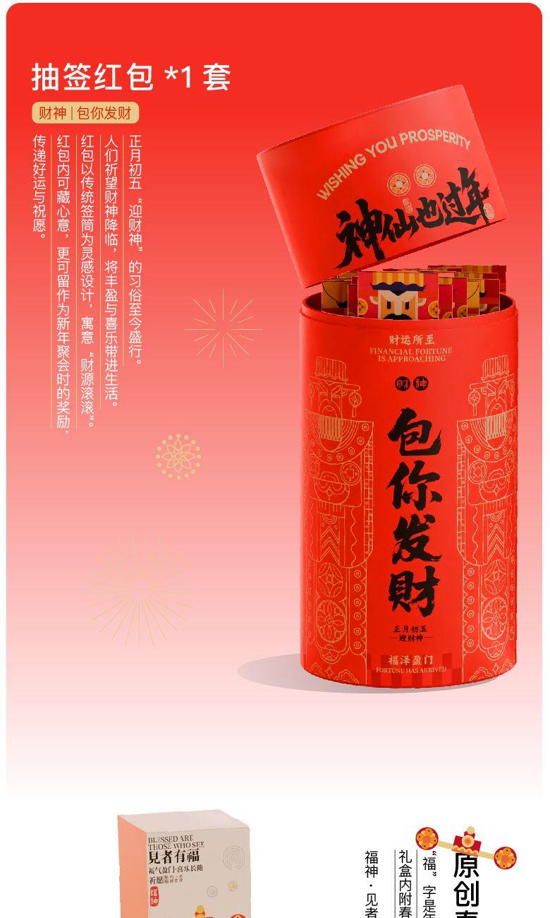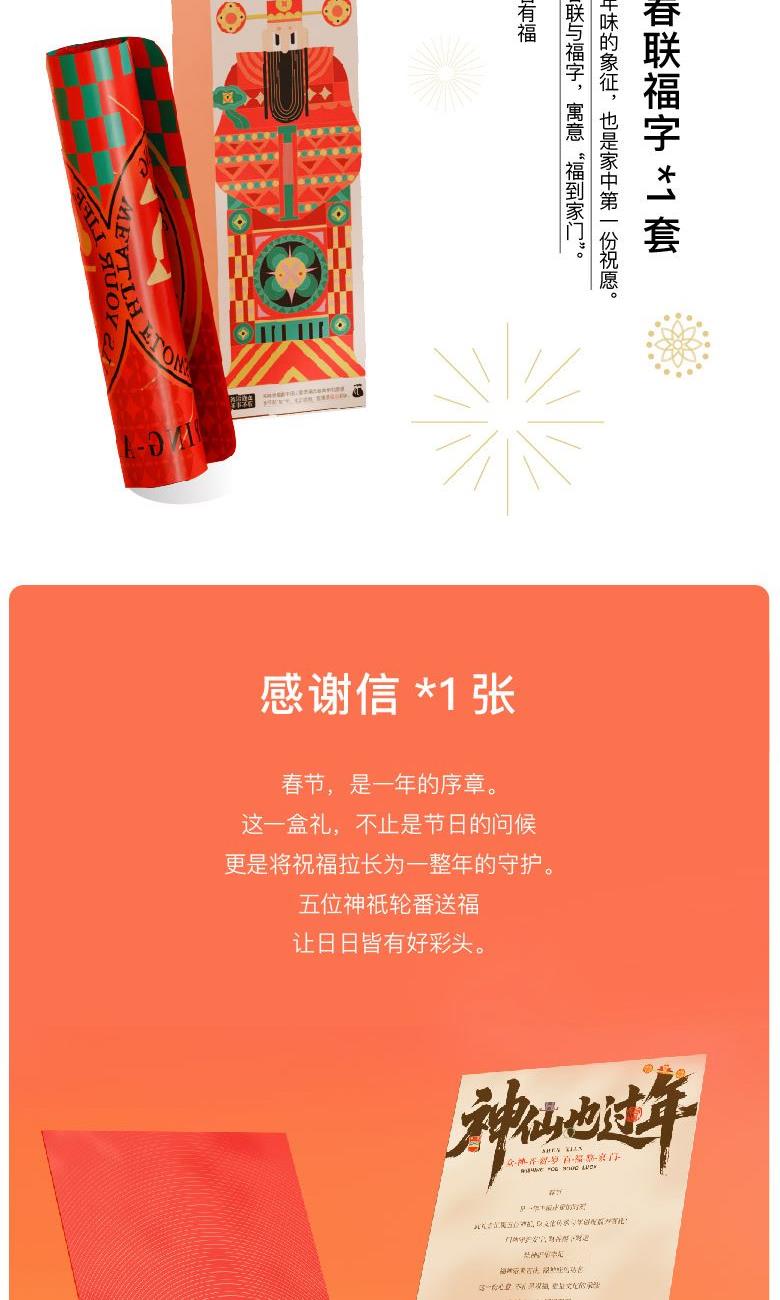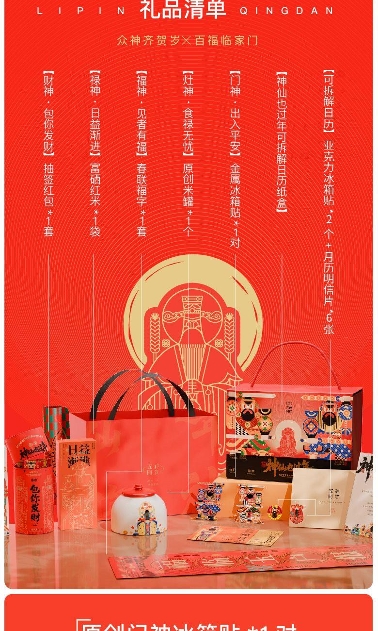 【神仙也过年可拆解日历纸盒】 1、[可拆解日历]亚克力冰箱贴*2个+月历明信片*6张 2、[门神·出入平安]金属冰箱贴*1对 3、[灶神·食禄无忧]原创米罐*1个 4、[禄神·日益渐进]富硒红米*1袋 5、[福神·岁岁平安]原创主题对联福字*1套 6、[财神·包你发财]原创主题抽签红包*1套