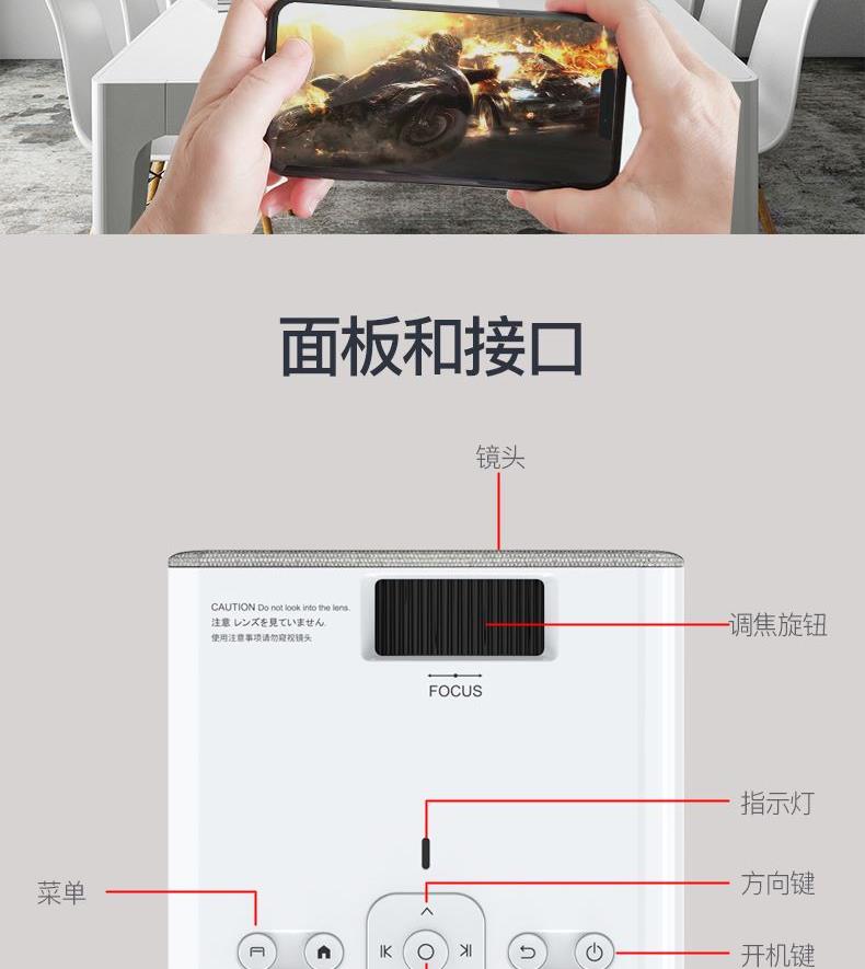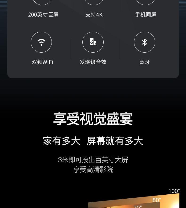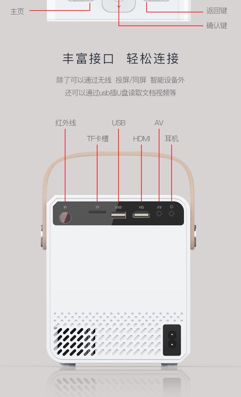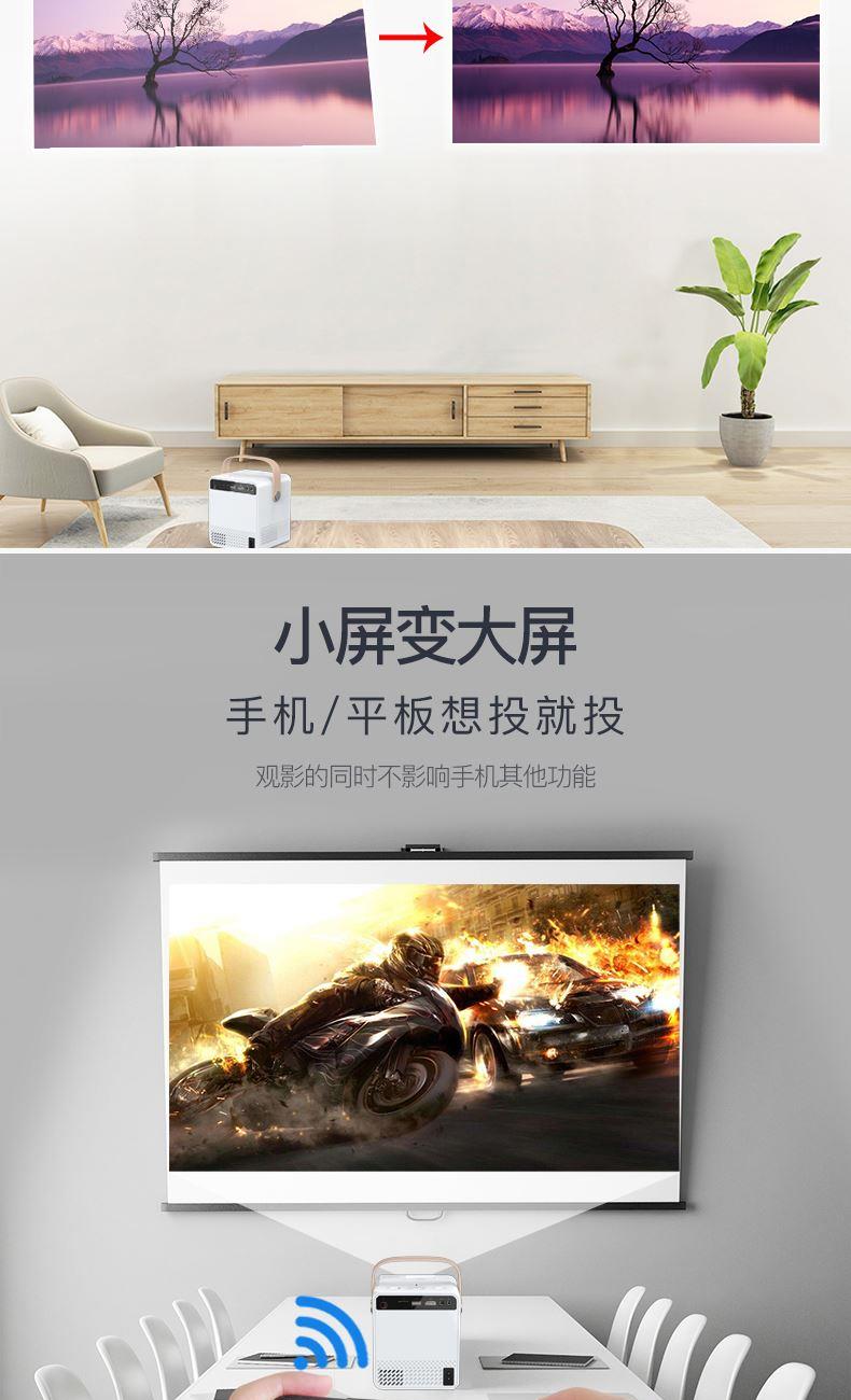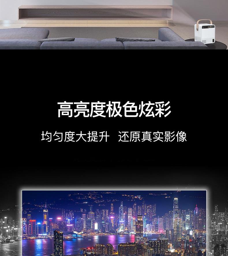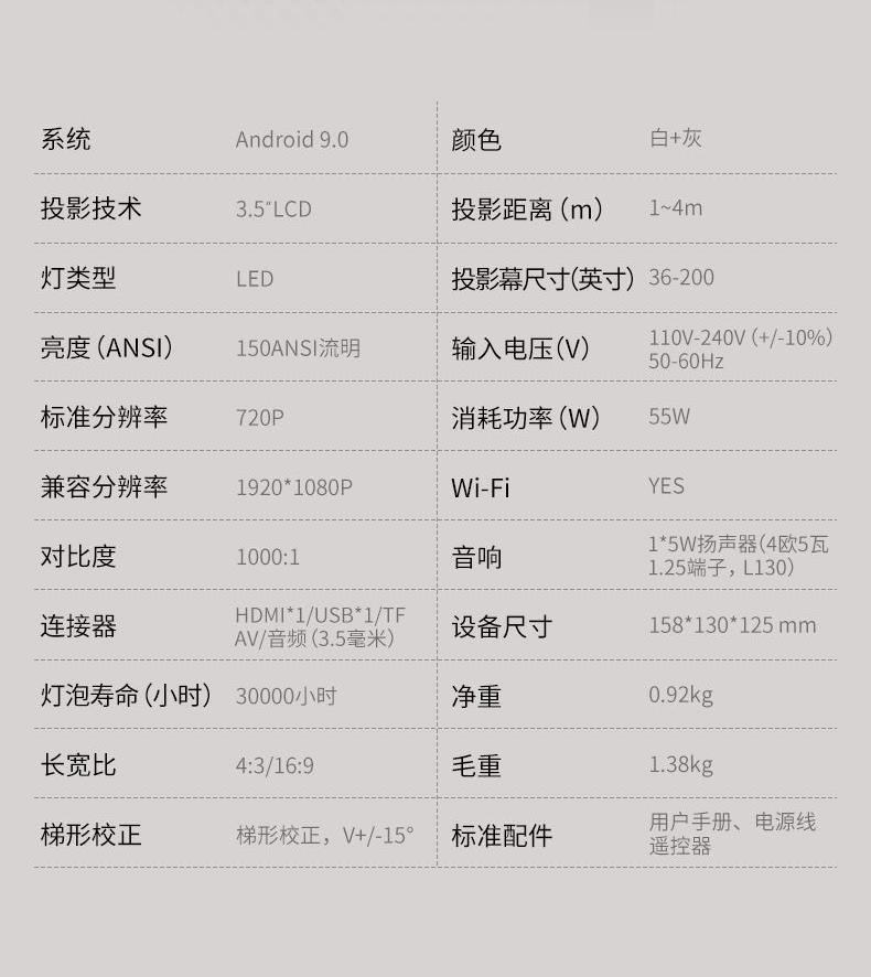 系统Android:9.0 投影技术:3.5LCD 灯类型:LED 亮度(ANSI):150ANSI流明 标准分辨率:720P 兼容分辨率:1920*1080P 投影幕尺寸(英寸):36-200 颜色:白+灰 投影距离(m):1-4m 输入电压(V):110V-240V(+/-10%)50-60Hz 消耗功率(W):55W