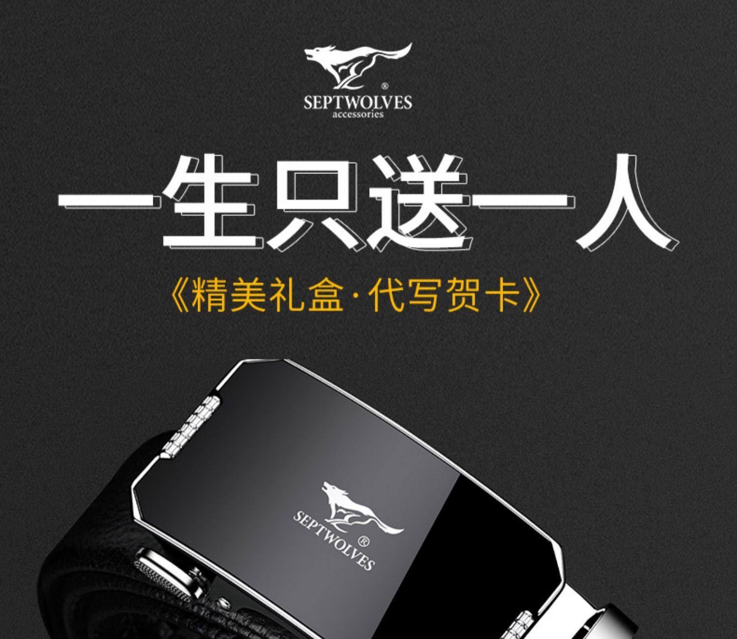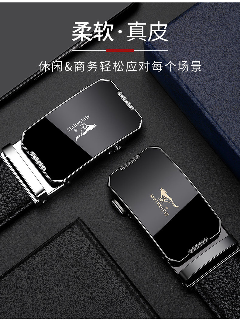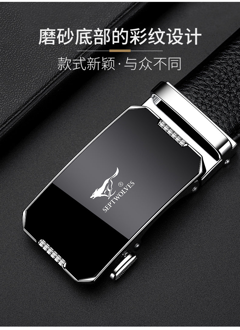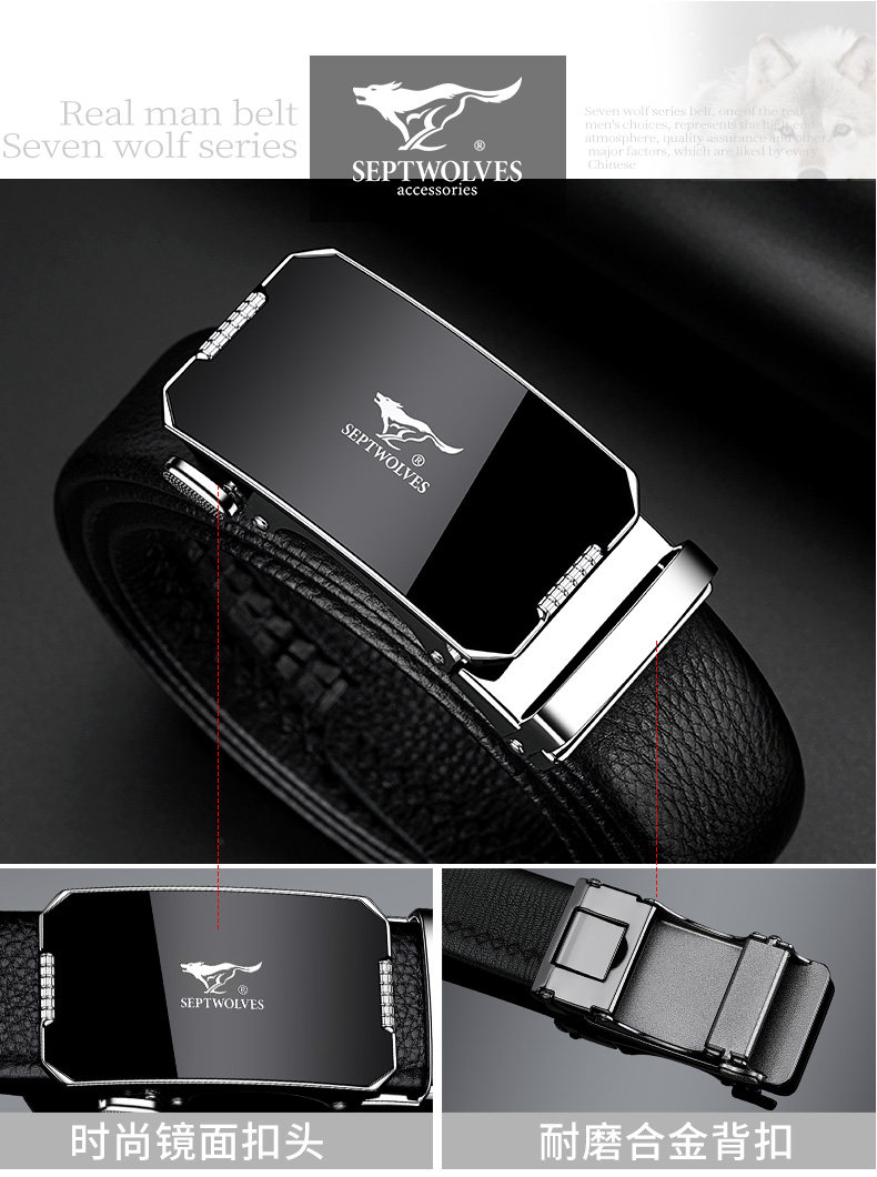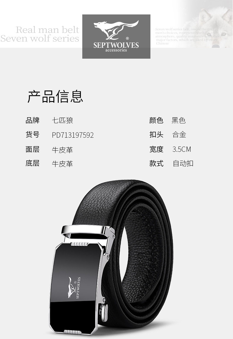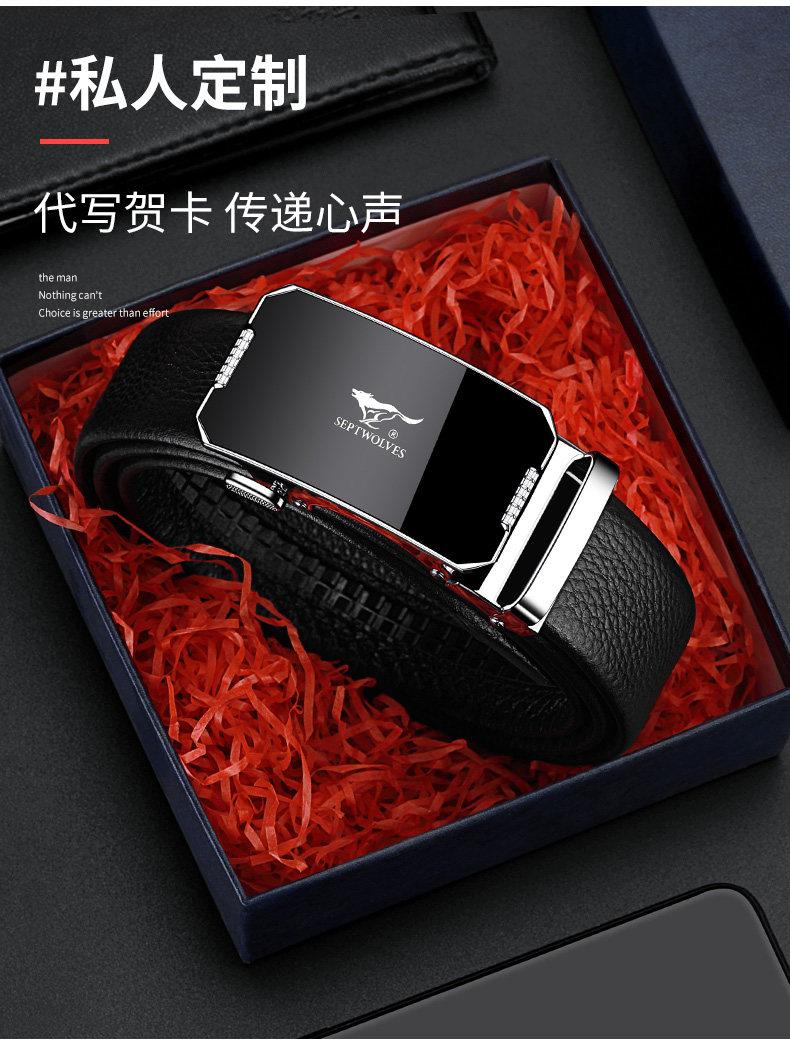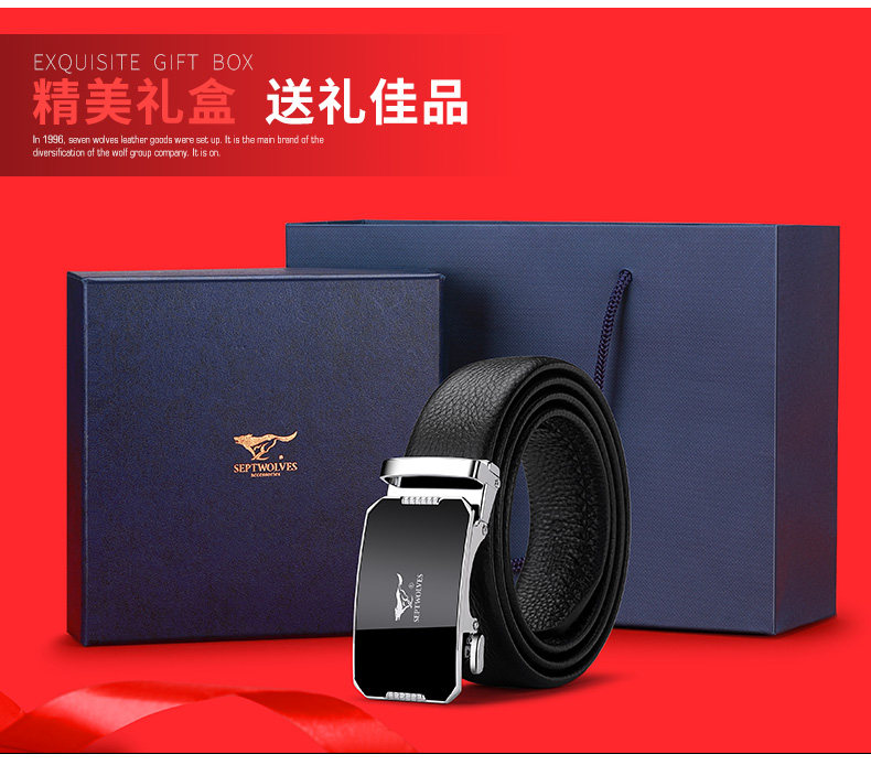 工艺:光面 带扣:自动扣 主体材质:头层牛皮 带扣材质:合金 风格:通勤风 商务风 宽度:3.5CM 送爱人,送长辈,送男士 时尚设计扣头,经典个性,简约百搭,磨砂背扣,材质柔软,手感舒适,经典狼标LOGO 代写贺卡,传递心声,精美礼盒,送礼佳品