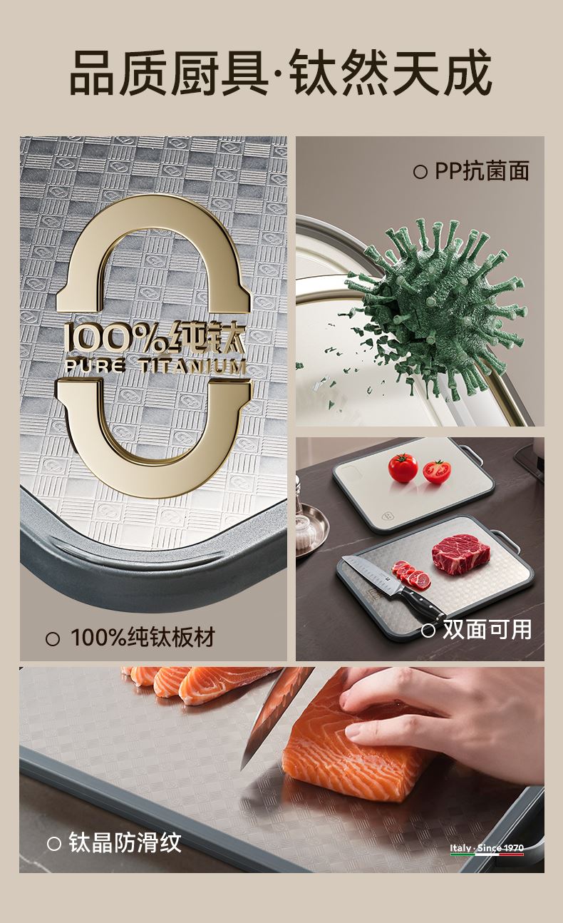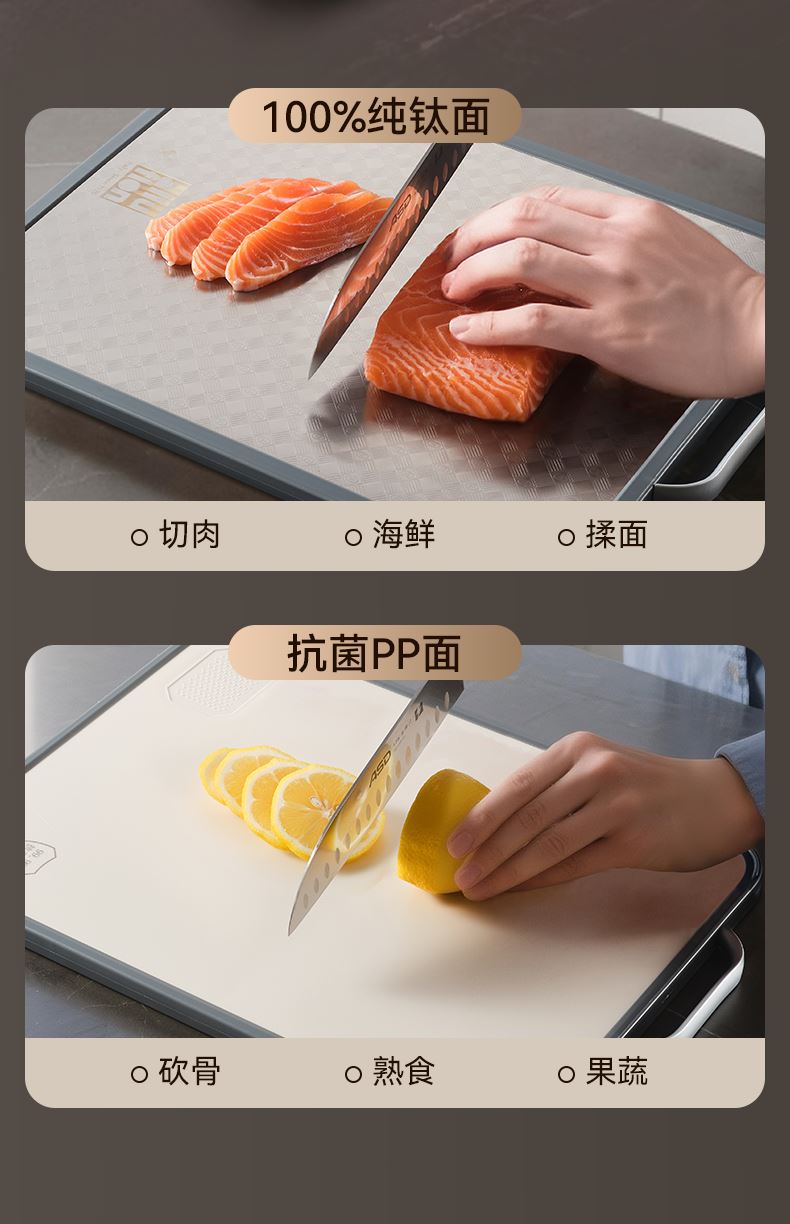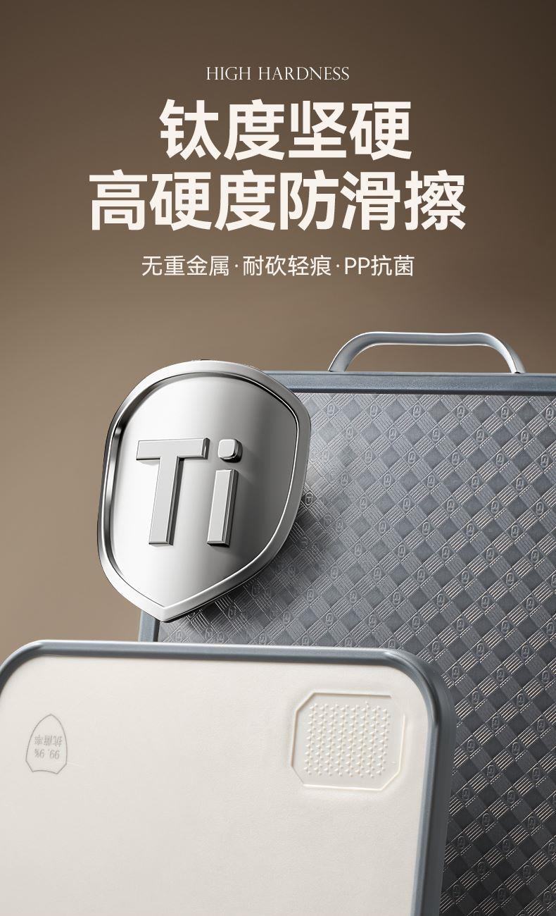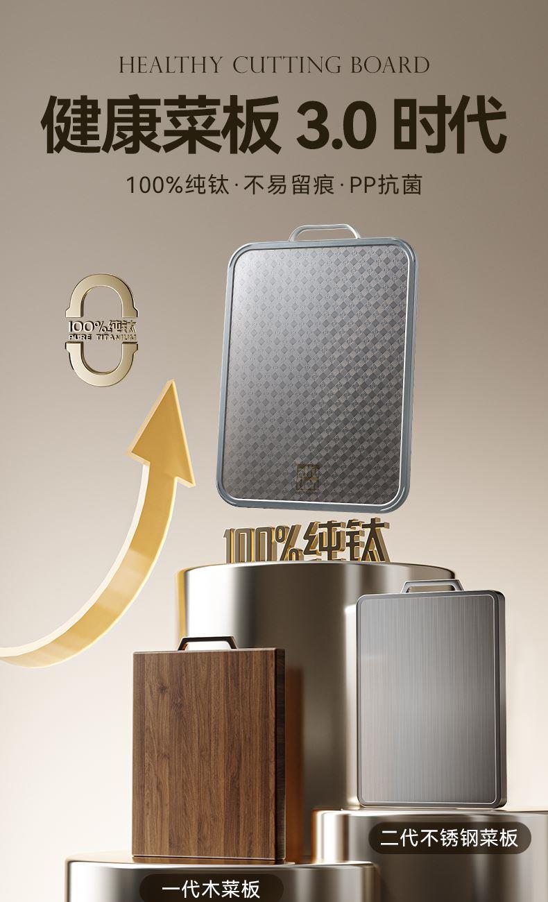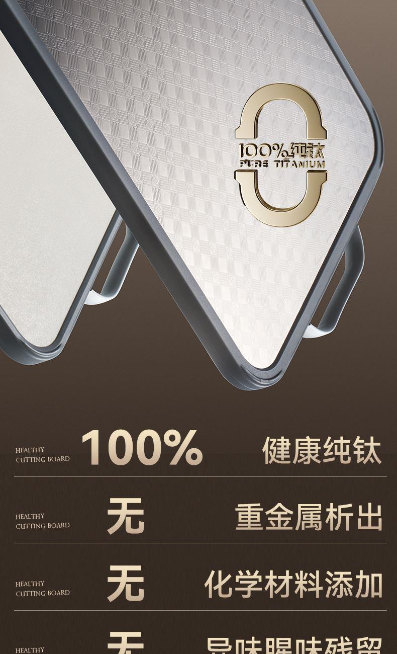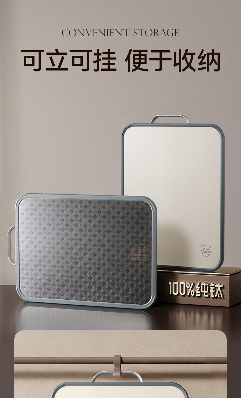 产品规格:37*28*1.5cm 产品货号:2205085128 外箱尺寸:425*295*210mm 彩盒尺寸:285*250*420mm 1、纯钛砧板,健康无污染 2、高硬度防滑擦,耐砍轻痕 3、双面鲜切,生熟分区 4、3.0PP面,有效防止细菌滋生 5、可立可挂,收纳便捷