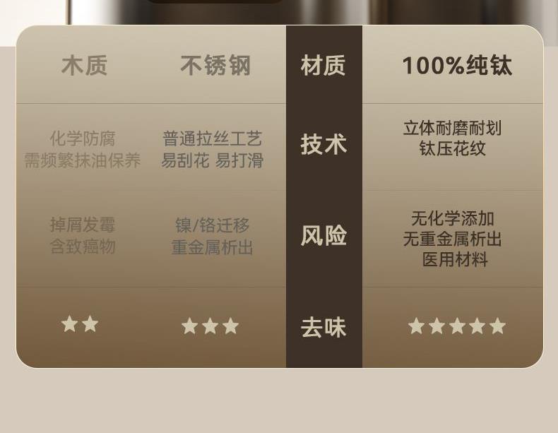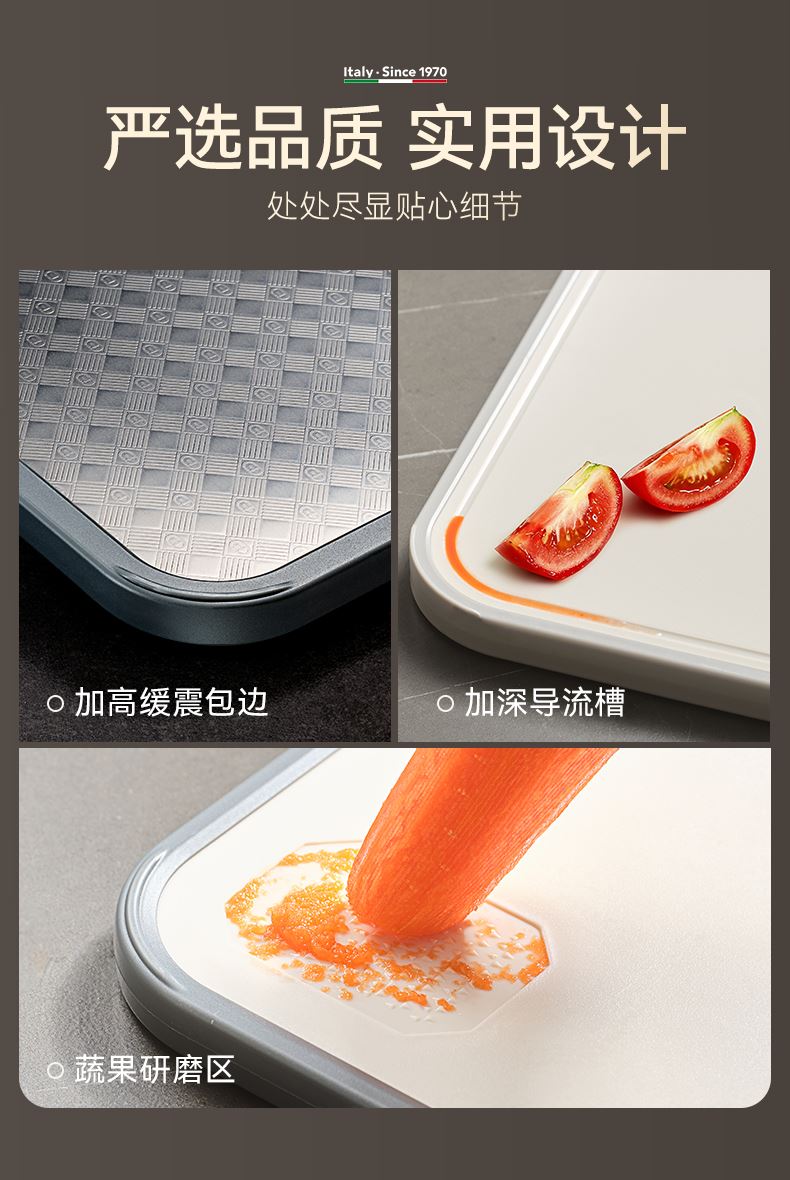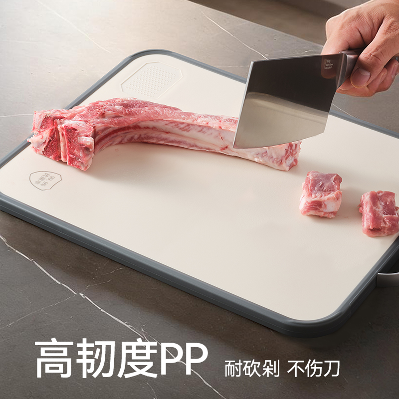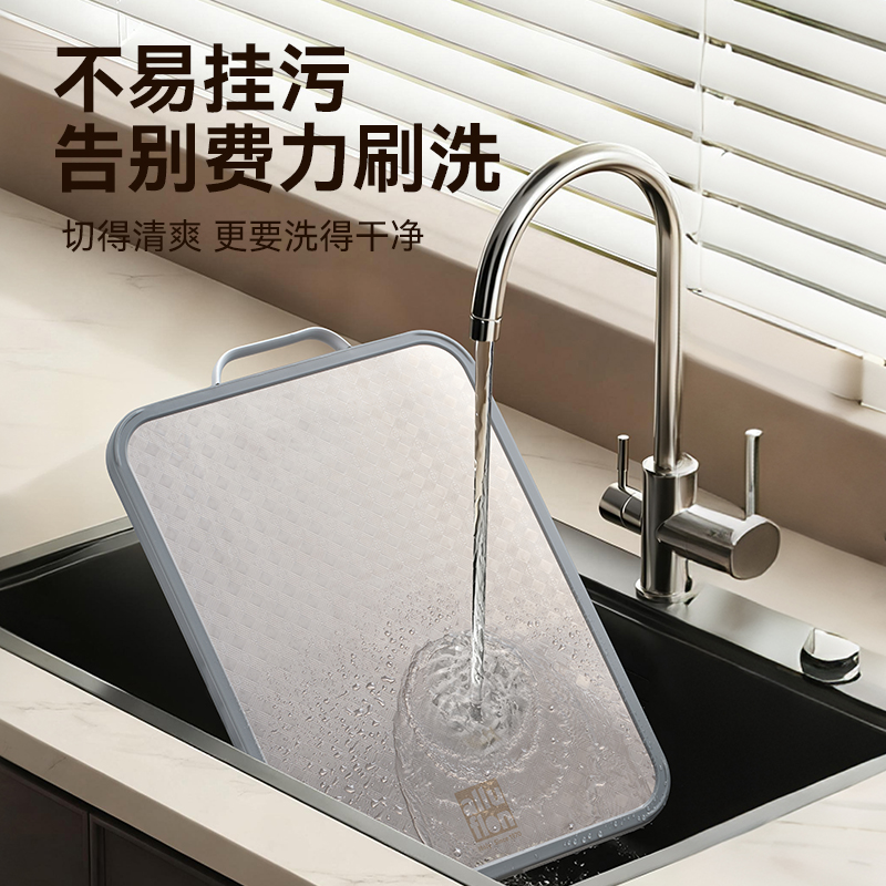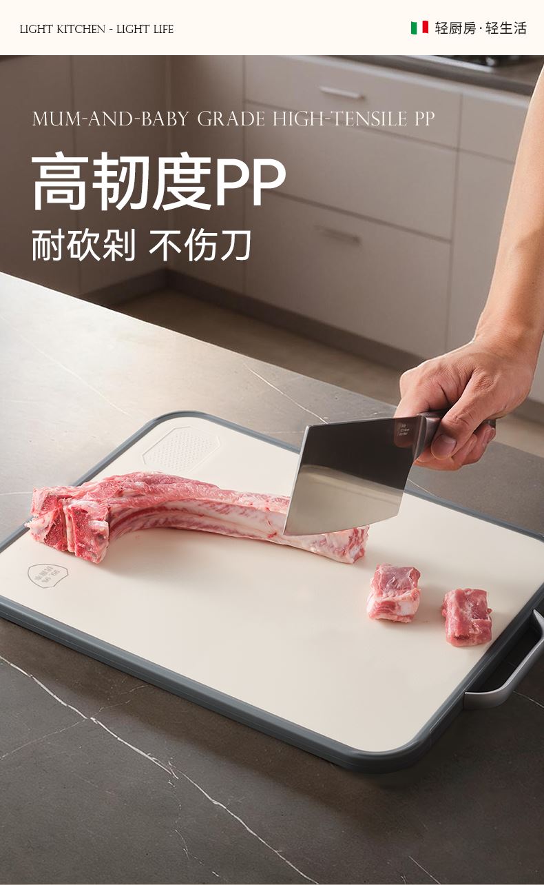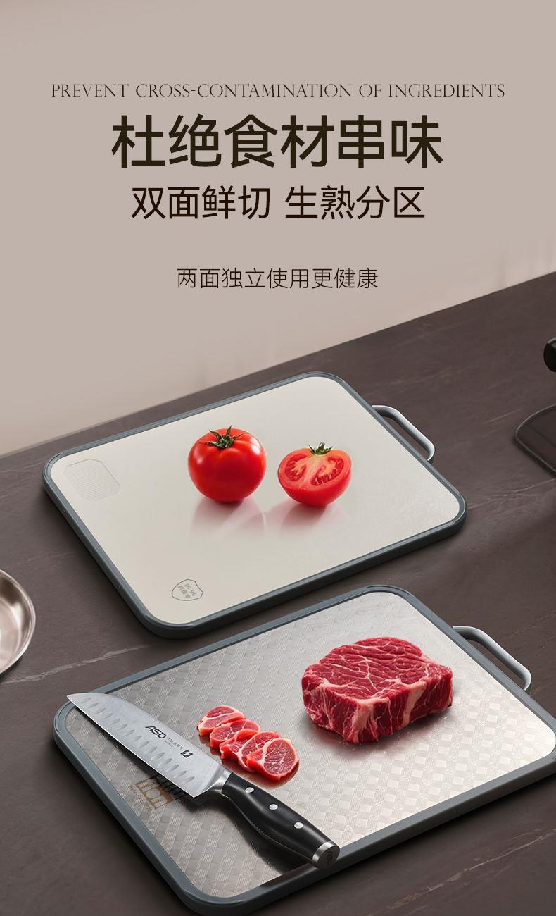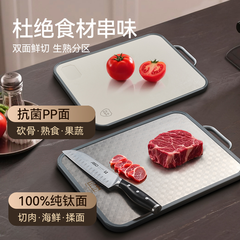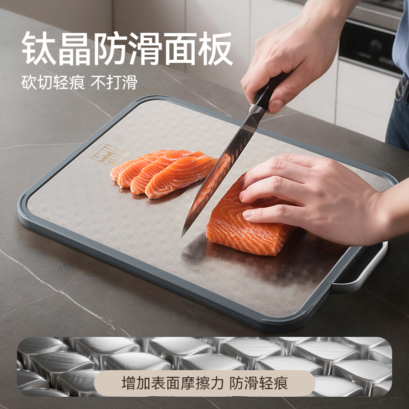 产品规格:37*28*1.5cm 产品货号:2205085128 外箱尺寸:425*295*210mm 彩盒尺寸:285*250*420mm 1、纯钛砧板,健康无污染 2、高硬度防滑擦,耐砍轻痕 3、双面鲜切,生熟分区 4、3.0PP面,有效防止细菌滋生 5、可立可挂,收纳便捷