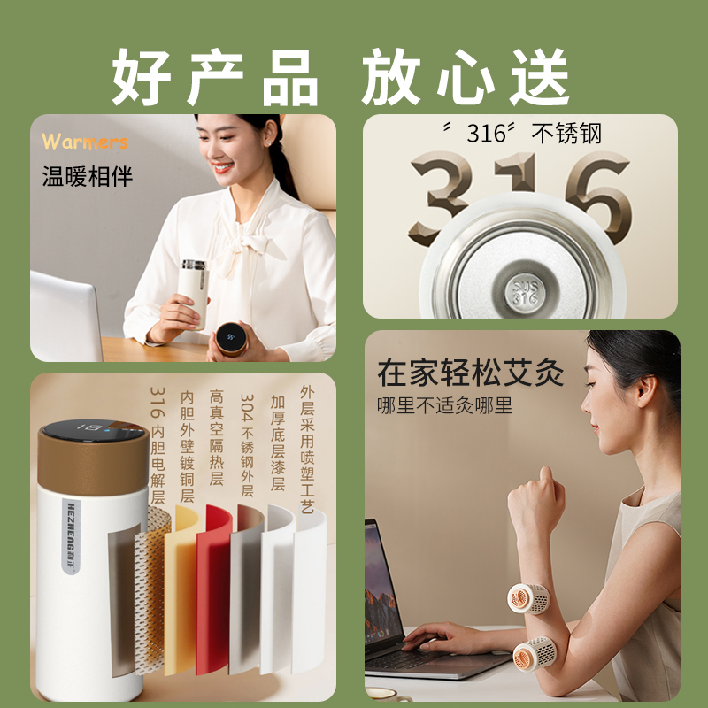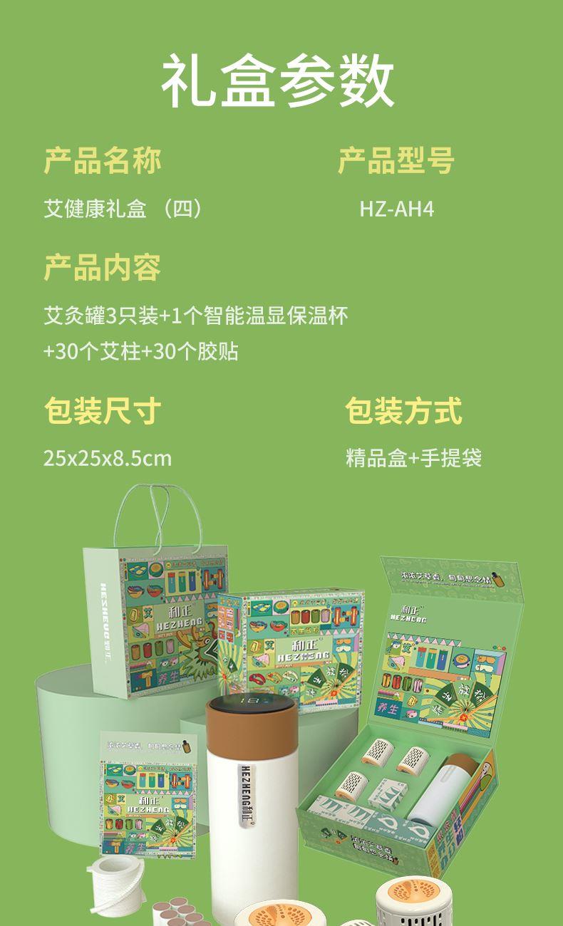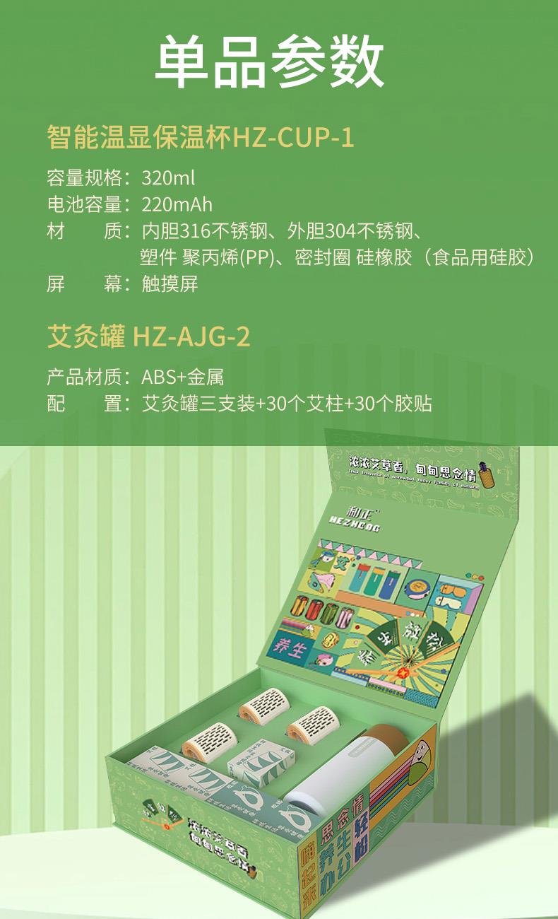 产品参数 产品内容:1个智能温显保温杯 +艾灸罐3只装+60个艾柱+60个胶贴 69码:6921311513628 包装方式:精品盒+手提袋 配置:艾灸罐三支装+60个艾柱+60个胶贴 产品卖点 这是一款组合式健康套装,由3个艾灸罐+1个水杯组成: 和正艾灸罐,根据艾灸理念设计而成,产品设计小巧,可循环使用;明火悬灸,升降调温,阻燃材质,多重保护,艾灸更安心;选用地道艾草精制而成的艾柱,艾香醇正,热力温润。 和正智能温显保温杯内胆选用高品质食品级316优质不锈钢材料,采用先进的无尾真空工艺精制而成,具有高效保温/保冷功能,且安全卫生、抗侵蚀,使用寿命长、实用性强。适用于家居、日用、休闲、旅游及运动等各类用途。