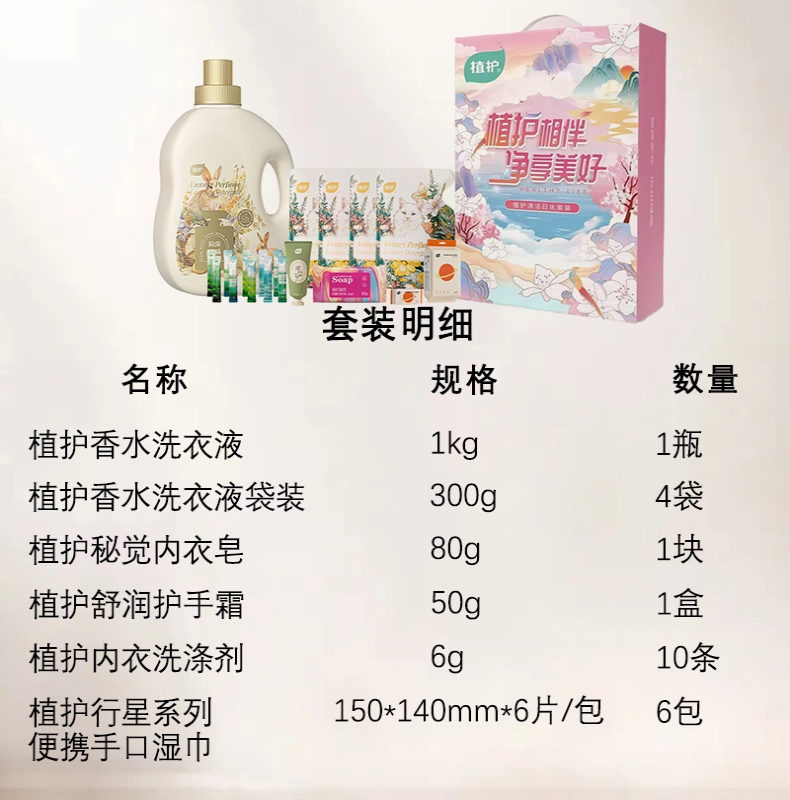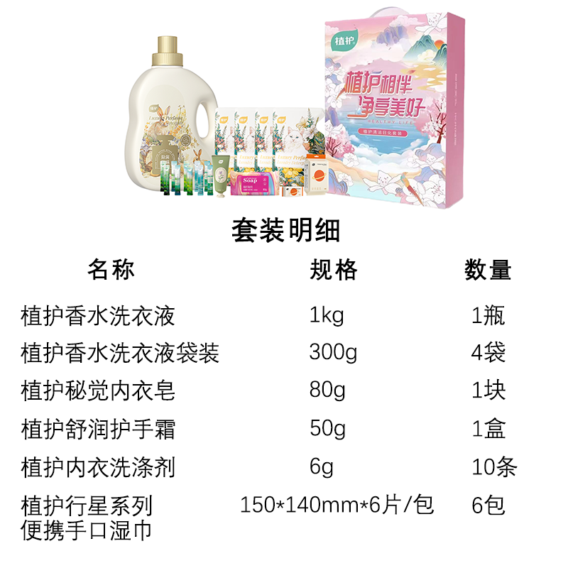 销售规格:植护香水洗衣皂液1kg*1瓶+植护洗衣液袋装300g*4袋+植护内衣洗涤剂6g*10袋+植护便携手口湿巾 150*140mm*6片/包*6包+植护护手霜50g*1盒+植护内衣皂80g*1块