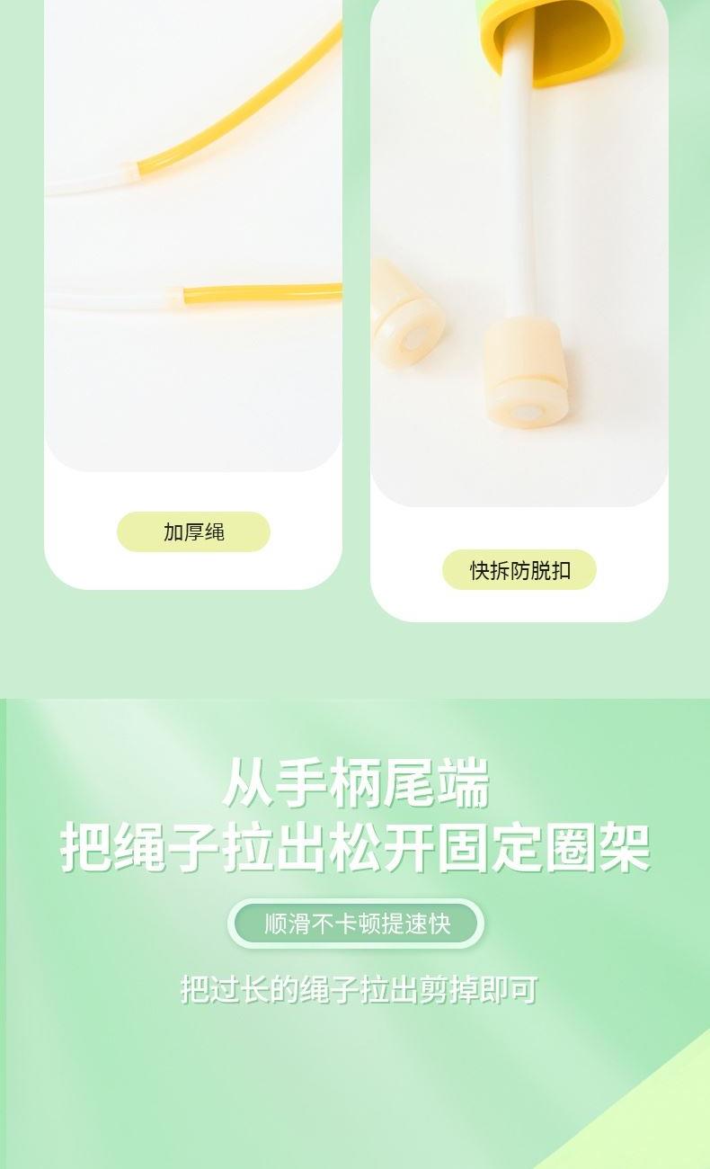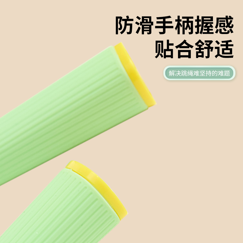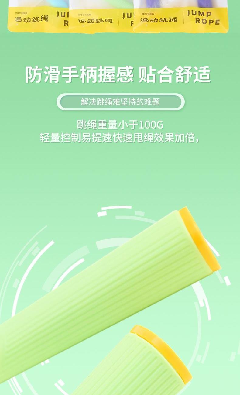 产品介绍: 专为儿童设计,跳绳不缠绕,不打结,特别适合小学生学习跳绳 硅胶手柄设计,有效防滑,整体轻变设计,可大幅提升每分钟的跳绳数量 双色撞色设计,深受小朋友喜爱 产品规格: 手柄125*18mm 绳长约2.6米 重量:0.12KG 材质:硅胶/ABS/PVC