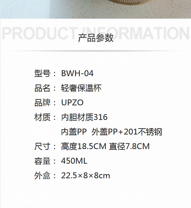 型号: BWH-04 材质: 内胆材质316 内盖PP 外盖PP+201不锈钢 尺寸: 高度18.5CM 直径7.8CM 容量: 450ML 外盒: 22.5×8×8cm 高颜值 优异品质