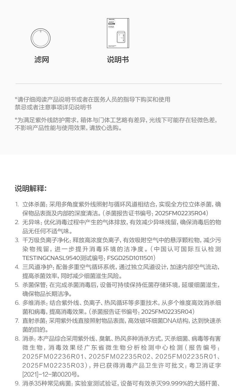 主要材质:PP+304不锈钢 颜色:北极白 额定电压:220V~/50Hz 额定功率:160W 37颗UVC灯珠,全面消毒无死角 千万级负离子净化,三风道对流循环 304镜面不锈钢内胆,360°无死角折射 22L大容量,两种不同层架灵活调节高度 72小时长效保管