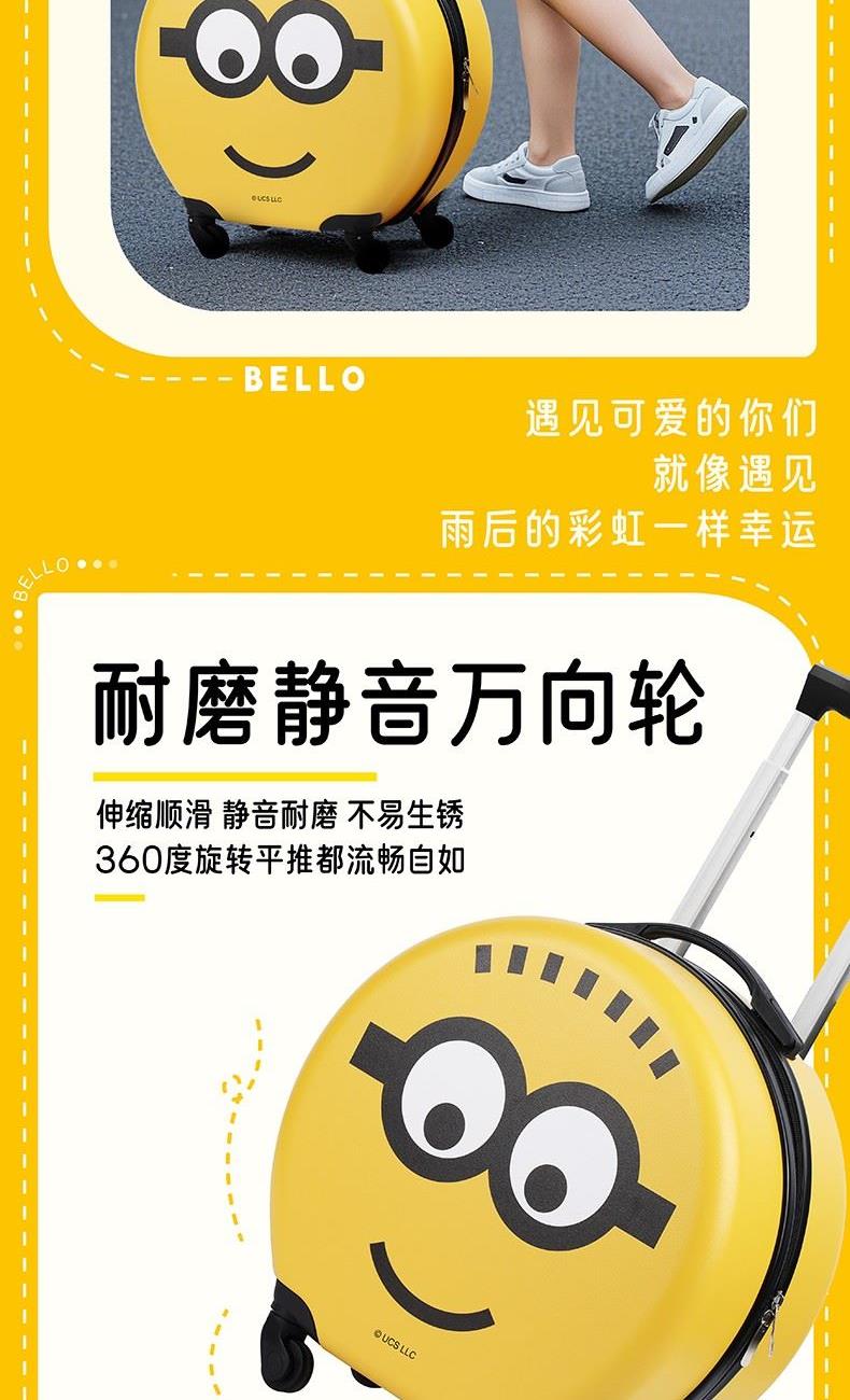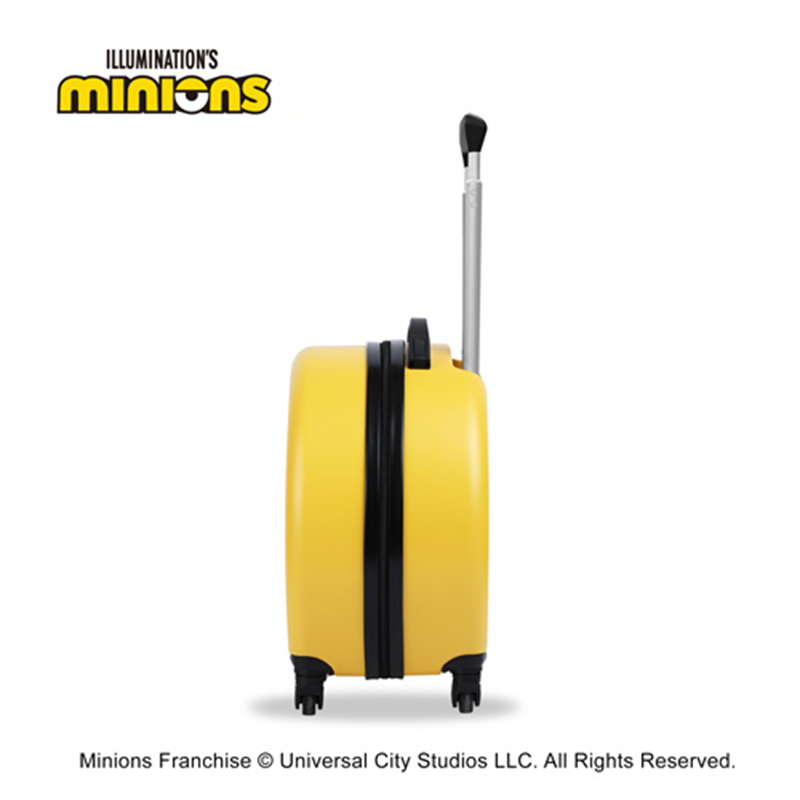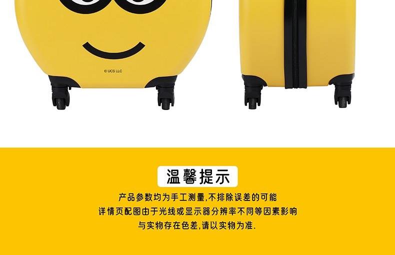 容 量:16寸 材 质:ABS磨砂纹 产品尺寸:45.5*39*22.5CM 包装尺寸:46.5*39.5*22.5CM 产品净重:2.26KG 整箱重量:2.91KG 随手可提、减少一切不必要的重量 360°静音万向轮,让一路旅行更静音,拖动更轻松 ABS+金属、轻盈环保耐摔材质 科学收纳,专注于宝宝的移动衣柜 萌趣小黄人形象设计