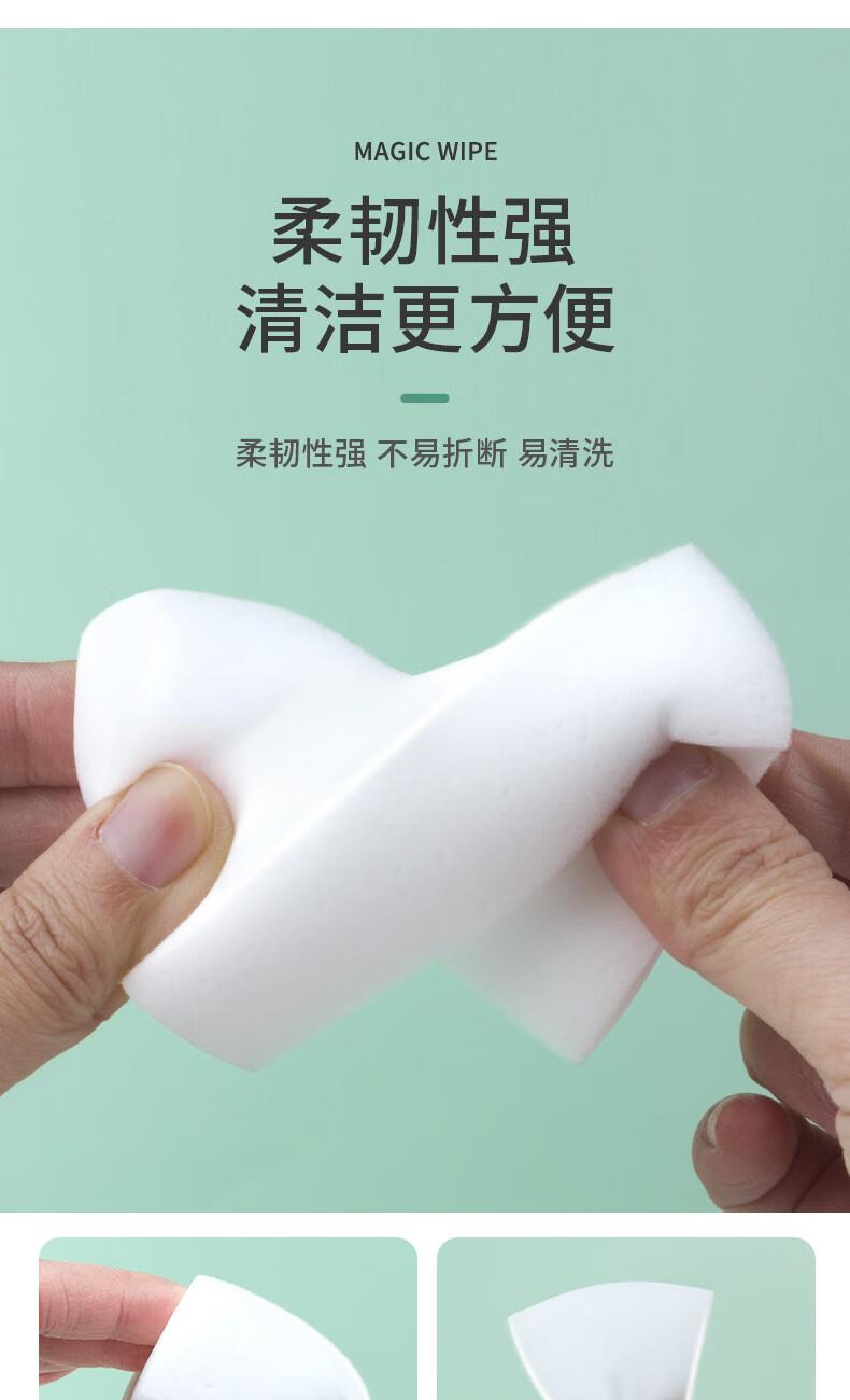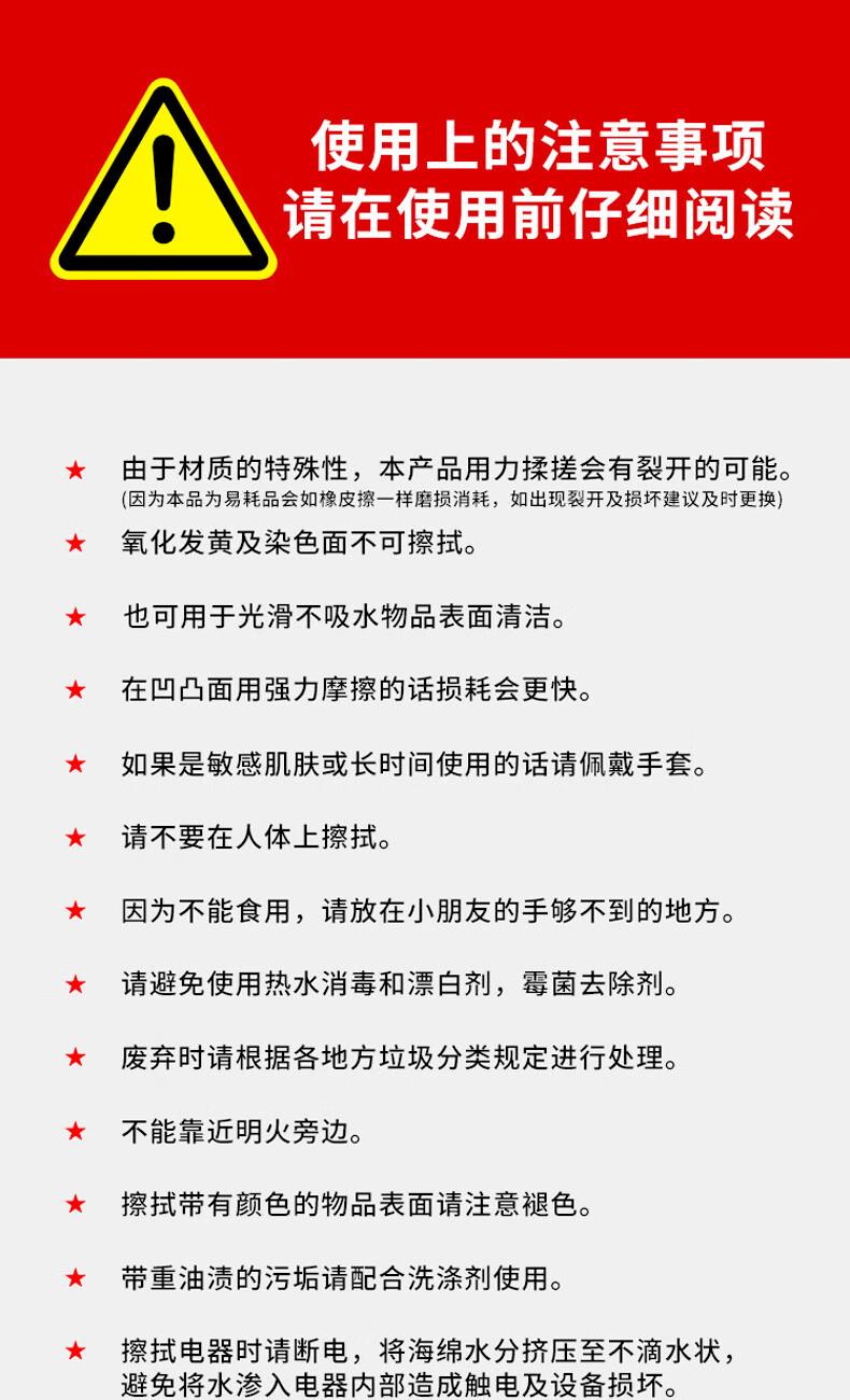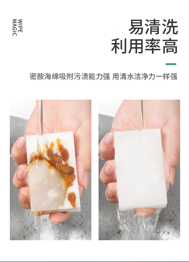 只需用水一擦即净 各种污渍 轻松搞定 三维网状结构深层次去污 柔韧性强 不易折断 易清洗 快速去污无需清洁剂 选对清洁用品很重要 推荐纳米海绵 只需沾水后轻轻一擦即刻干净 密胺海绵吸附污渍能力强 用清水洁净力一样强 随意切割物尽其用 大面积清洁用大块 死角清洁切小块