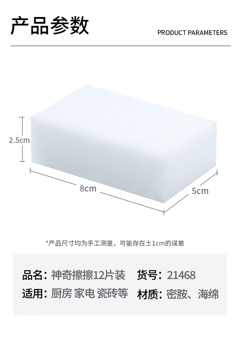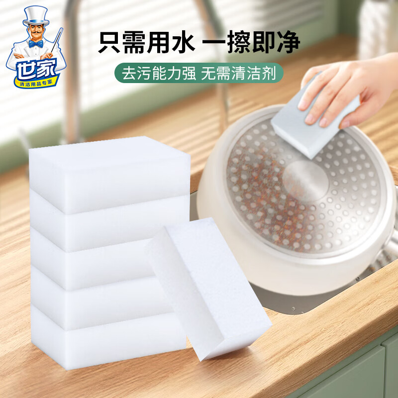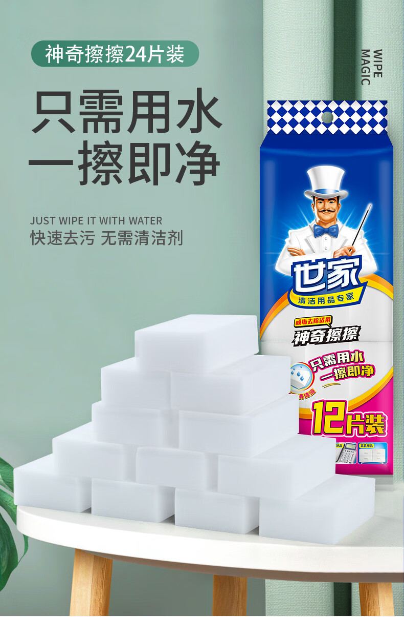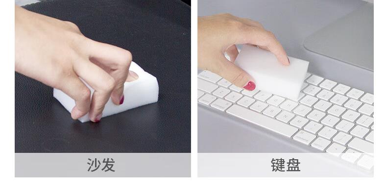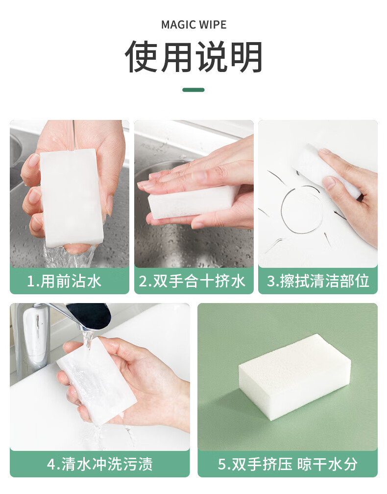 只需用水一擦即净 各种污渍 轻松搞定 三维网状结构深层次去污 柔韧性强 不易折断 易清洗 快速去污无需清洁剂 选对清洁用品很重要 推荐纳米海绵 只需沾水后轻轻一擦即刻干净 密胺海绵吸附污渍能力强 用清水洁净力一样强 随意切割物尽其用 大面积清洁用大块 死角清洁切小块
