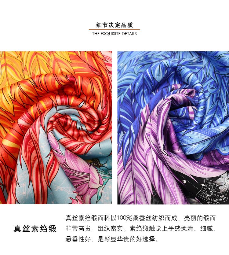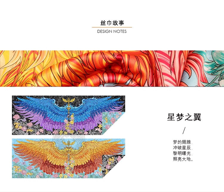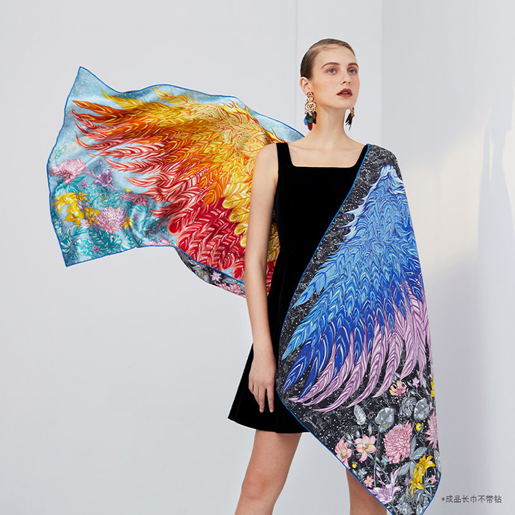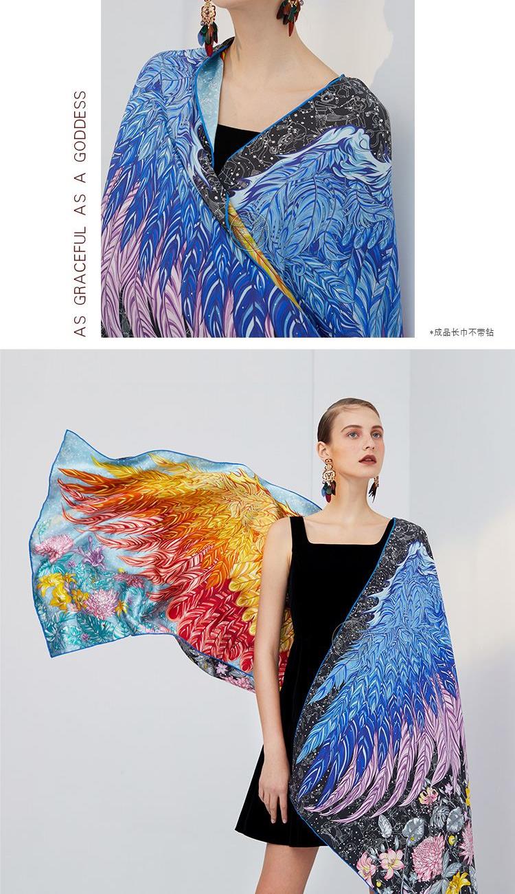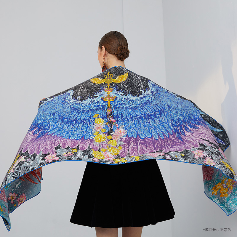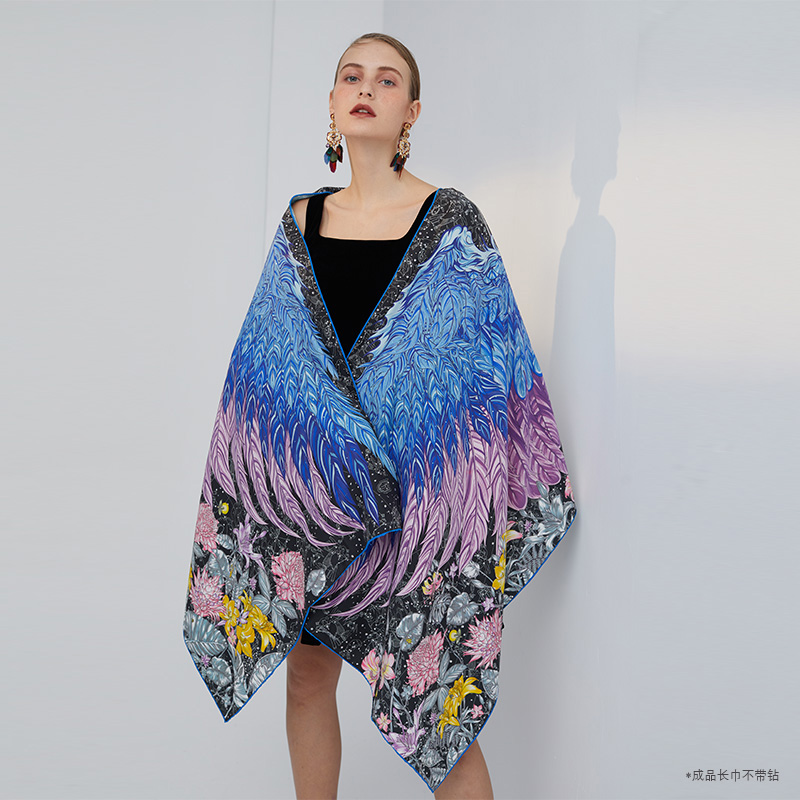 aurora系列 星梦之翼(镶钻)双面异色原创披肩 尺寸:66x200cm长方形 真丝桑蚕丝素绉缎 欧美风 英伦风 四季通用 卷边:手工密针卷边 工艺:同步双面喷绘 宴会,晚宴VIP活动 精美礼盒
