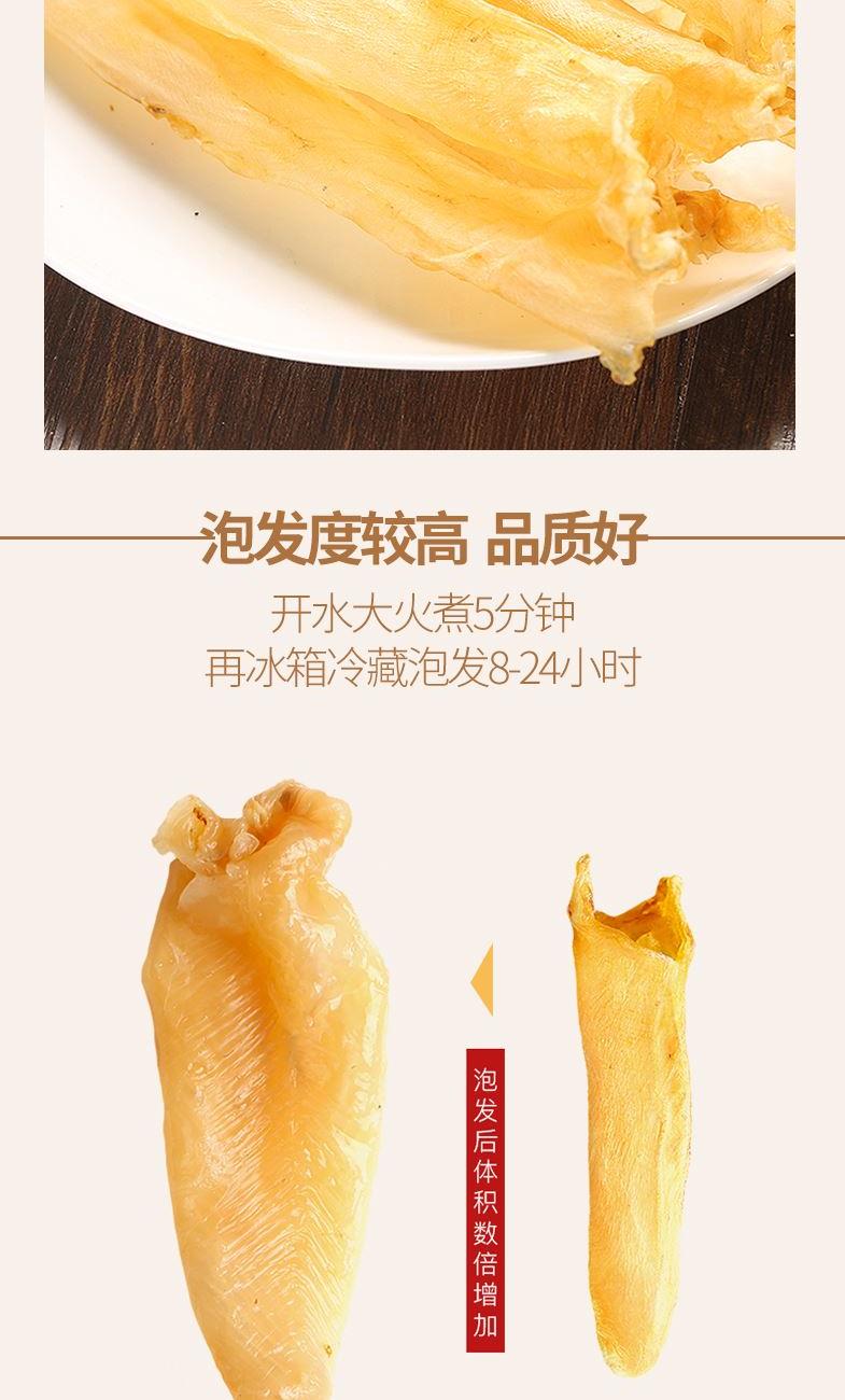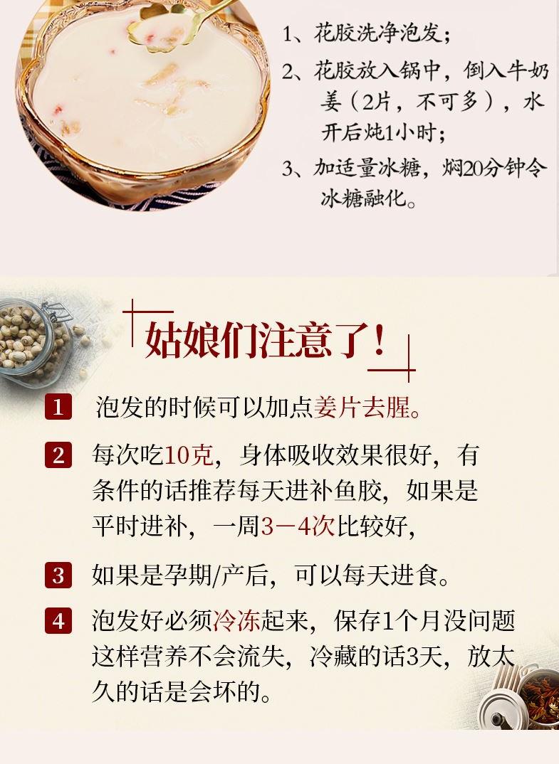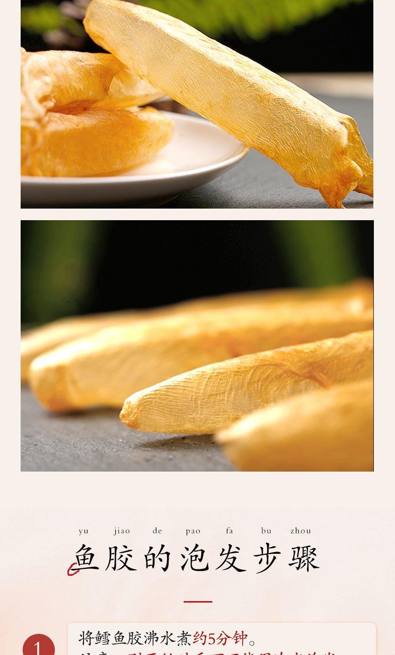 配料:鱼胶 原料产地:广东省湛江市 净含量:40克 保质期:12个月 生产日期:见包装物打印处 食用方法:用清水浸软洗净后,可炖、煮等,还可为多种菜肴调出美味。 贮存条件:请密封置于阴凉干燥处,开封后宜冷藏保存,以保住产品品质及风味。