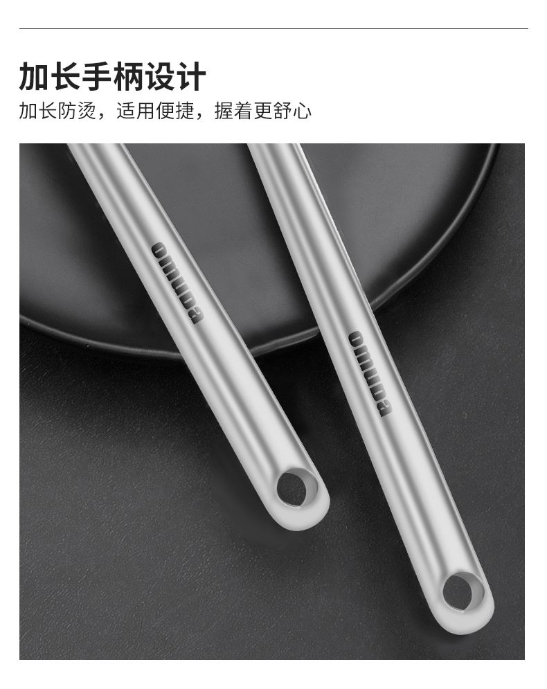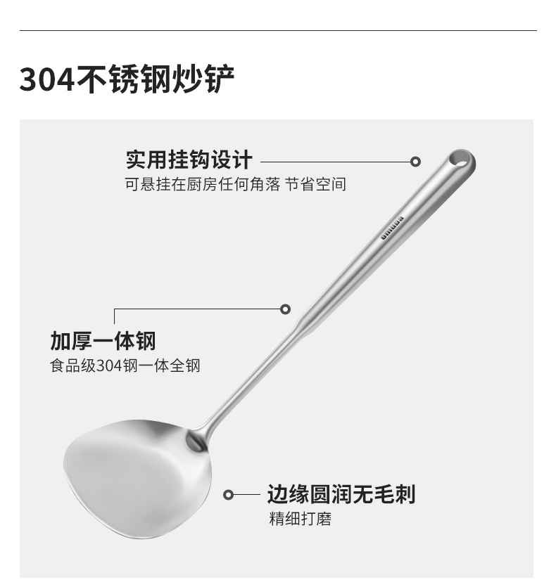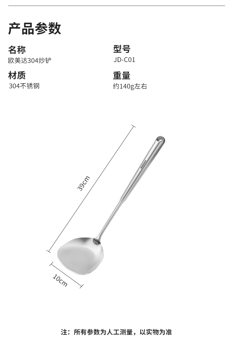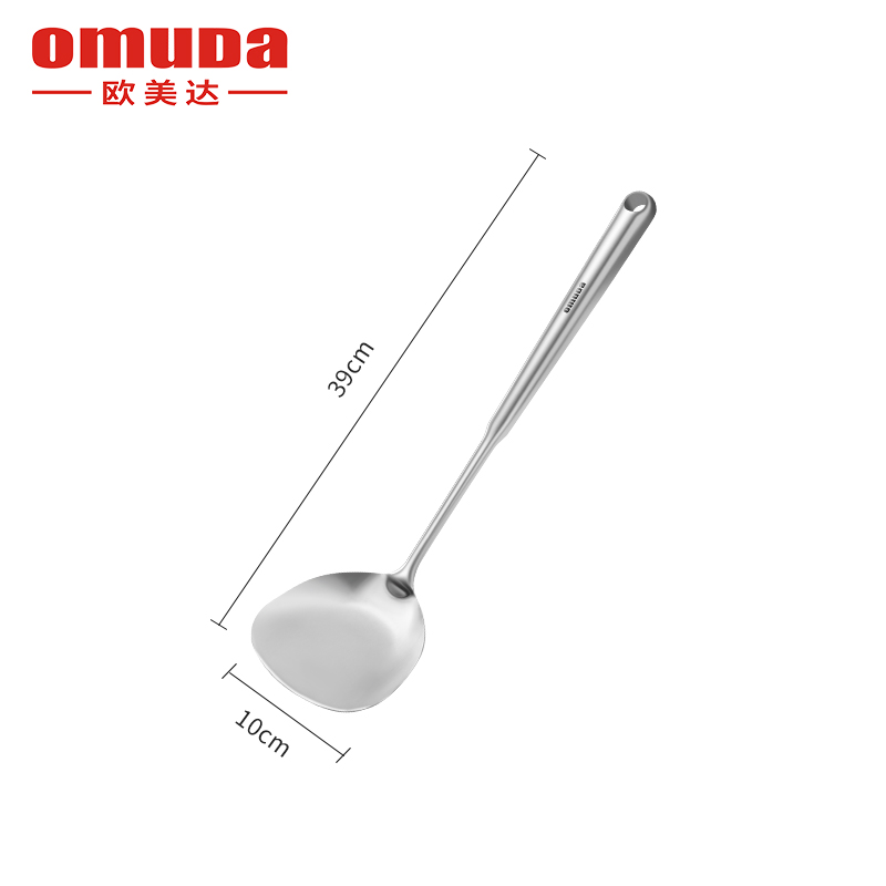 尺寸:39cm 材质:304不锈钢 净重:0.14kg ①采用优质304不锈钢材质,坚固耐用,人体工程学手柄设计,防热隔烫,手感更舒适 ②选砂光工艺处理,不易产生刮痕,圆筒状手柄便于抓握,带给您便捷的烹饪体验 ③整体不锈钢材质,易清洁,无卫生死角,耐腐蚀、安全卫生