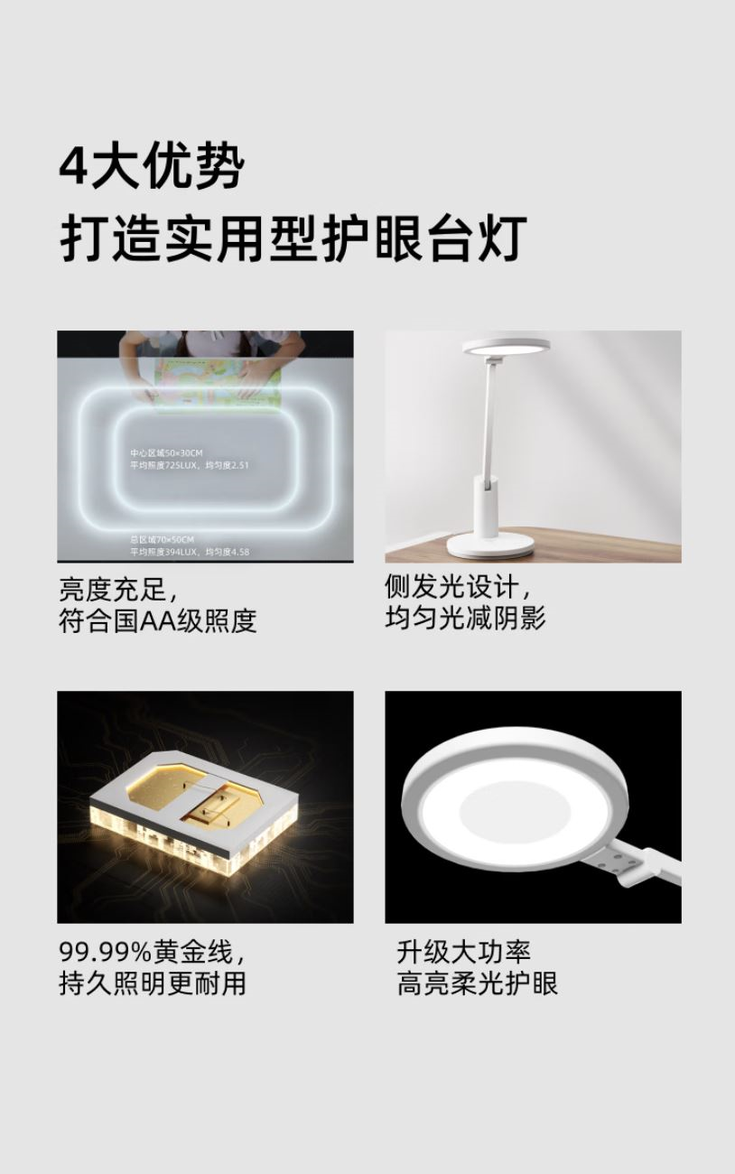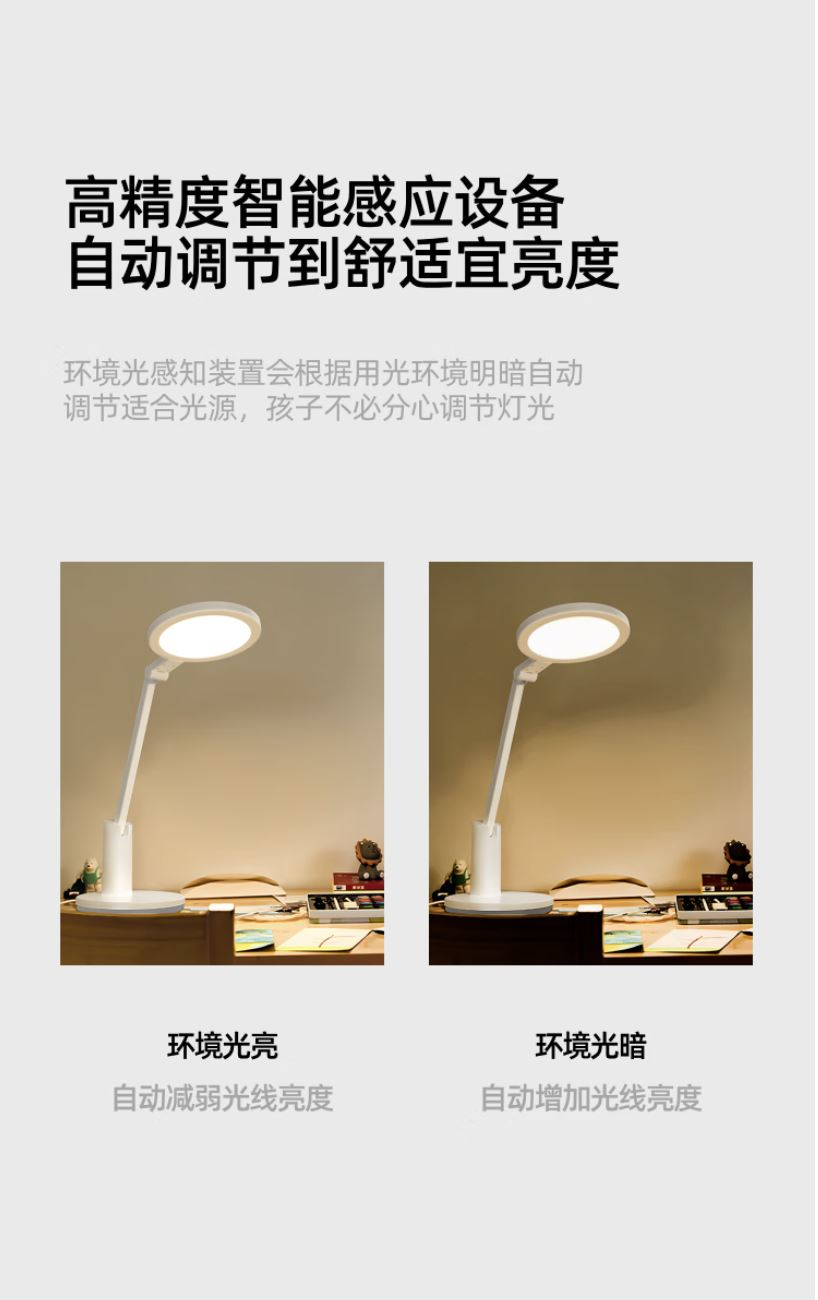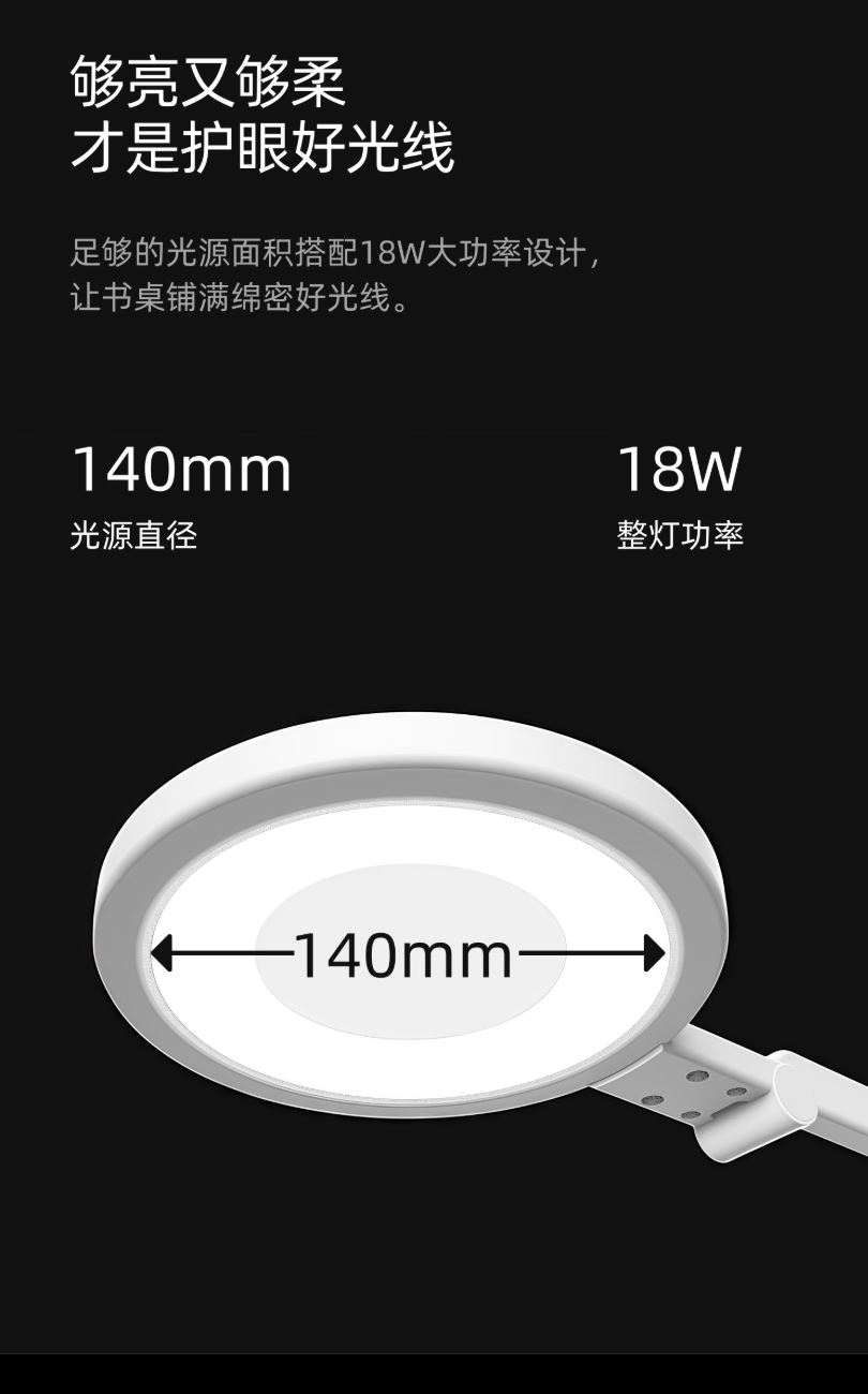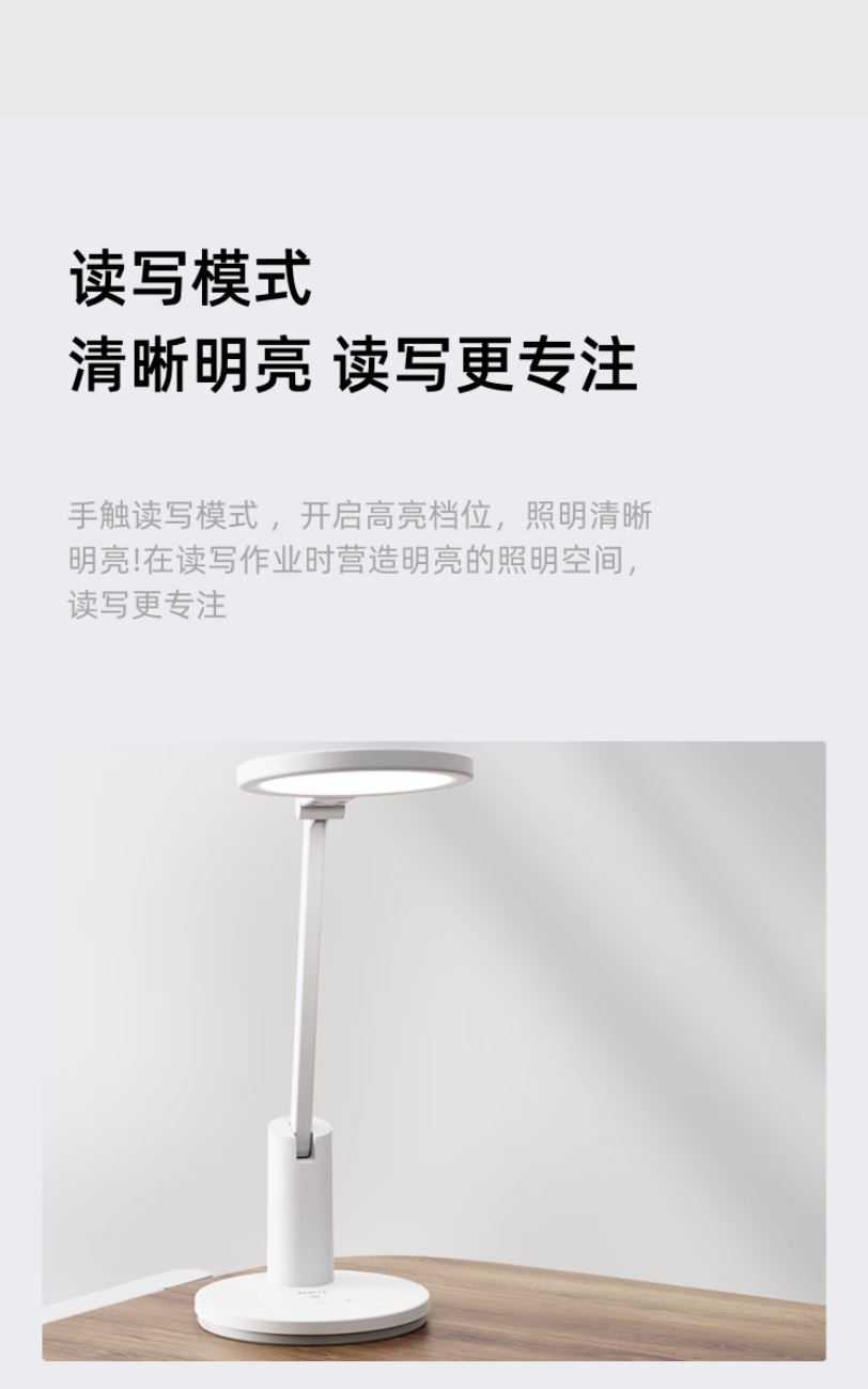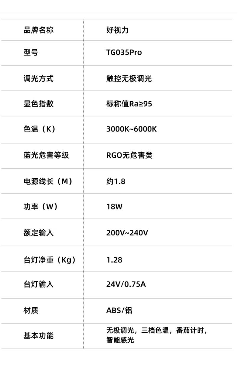 是否防蓝光:防蓝光 瓦数:15-20W(含) 固定方式:底座 是否可充电:不可充电 防蓝光指数:RG0(豁免伤害) 智能功能:智能调光 防眩指数UGR:极低眩光≤13 光源类型:LED 灯身材质:ABS 开关方式:触摸开关 护眼功能:全光谱 供电方式:插座 显色指数:Ra96-98(含) 包装清单:台灯*1,适配器*1,说明书保修卡*1