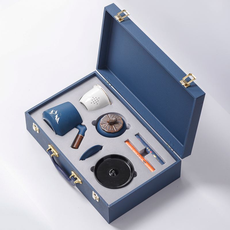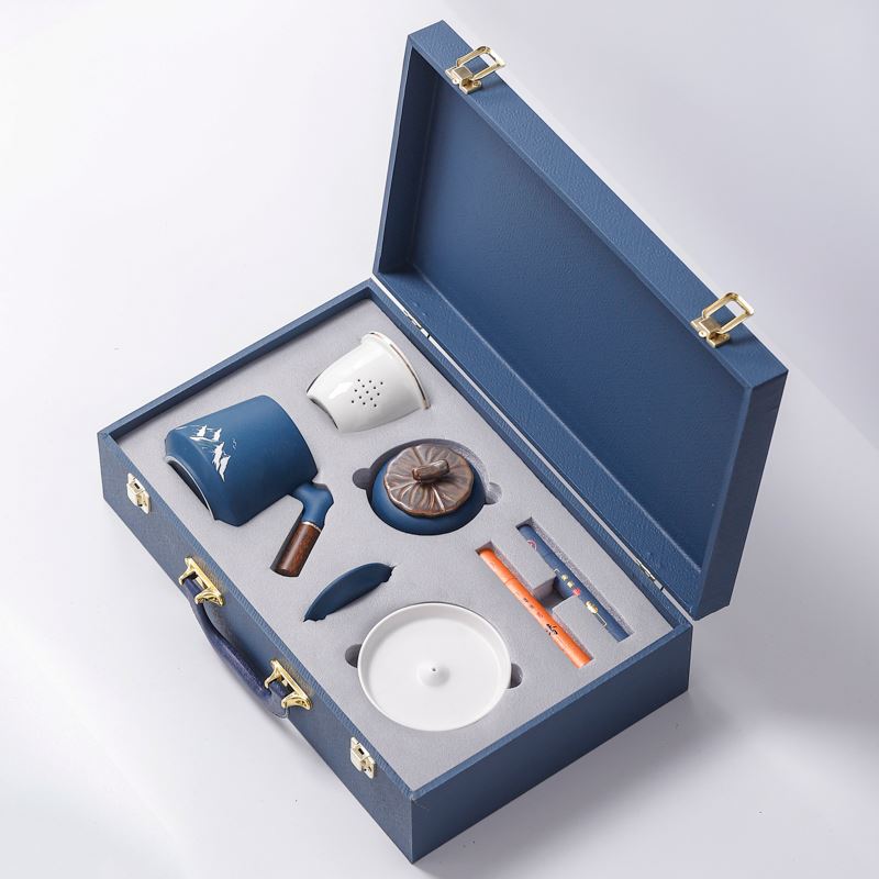配 制: 1办公杯 1香盘 2条香 1茶叶罐 锦盒 规格: 办公杯14.5*10.4cm 礼盒38.2*11cm 茶叶罐9.6*9cm 工艺:香道商务套装,商务实用性礼品,上班族刚需产品。