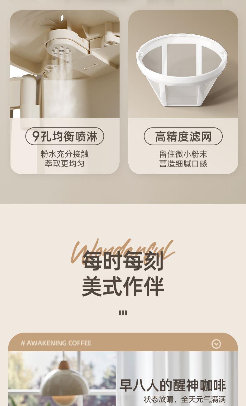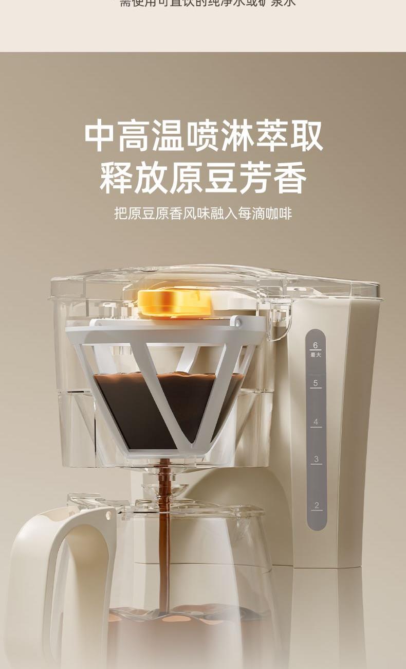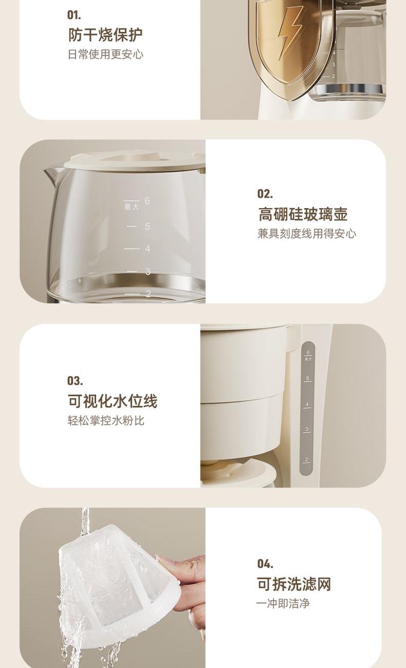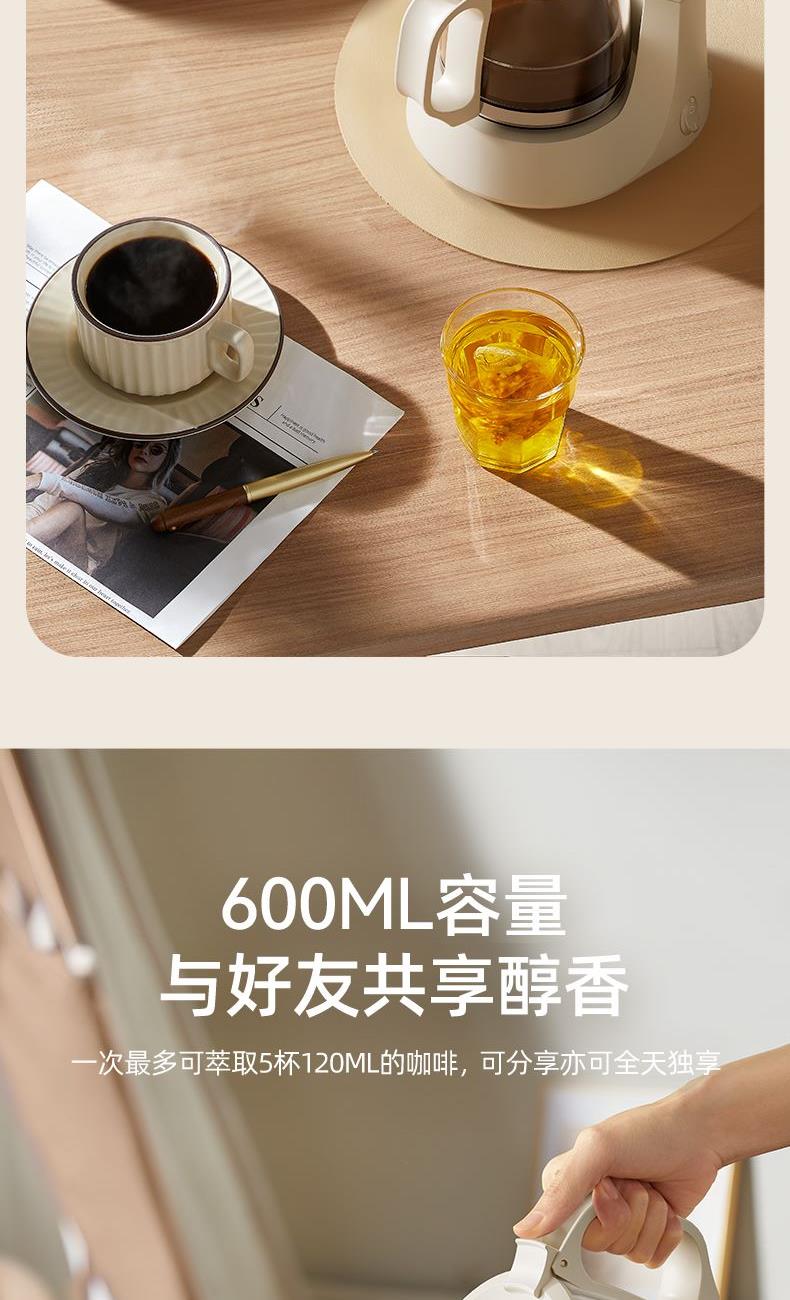 主要材质:PP+玻璃 电压:220V 功率:550W 容量:600ml 产品尺寸: 155*209*254.5mm 邮购箱:65*215*320mm 单台净重:0.9kg 单台毛重:1.57kg 规格:6台/箱 包装方式:3层彩盒+3层邮购箱+3层牛卡大箱 1.高密度滤网,留住微小粉末,口感更细腻 2.高温萃取,保留咖啡香气 3.底部设有保温盘,实时保温 4.600ml水箱容量,能出5杯120ml咖啡