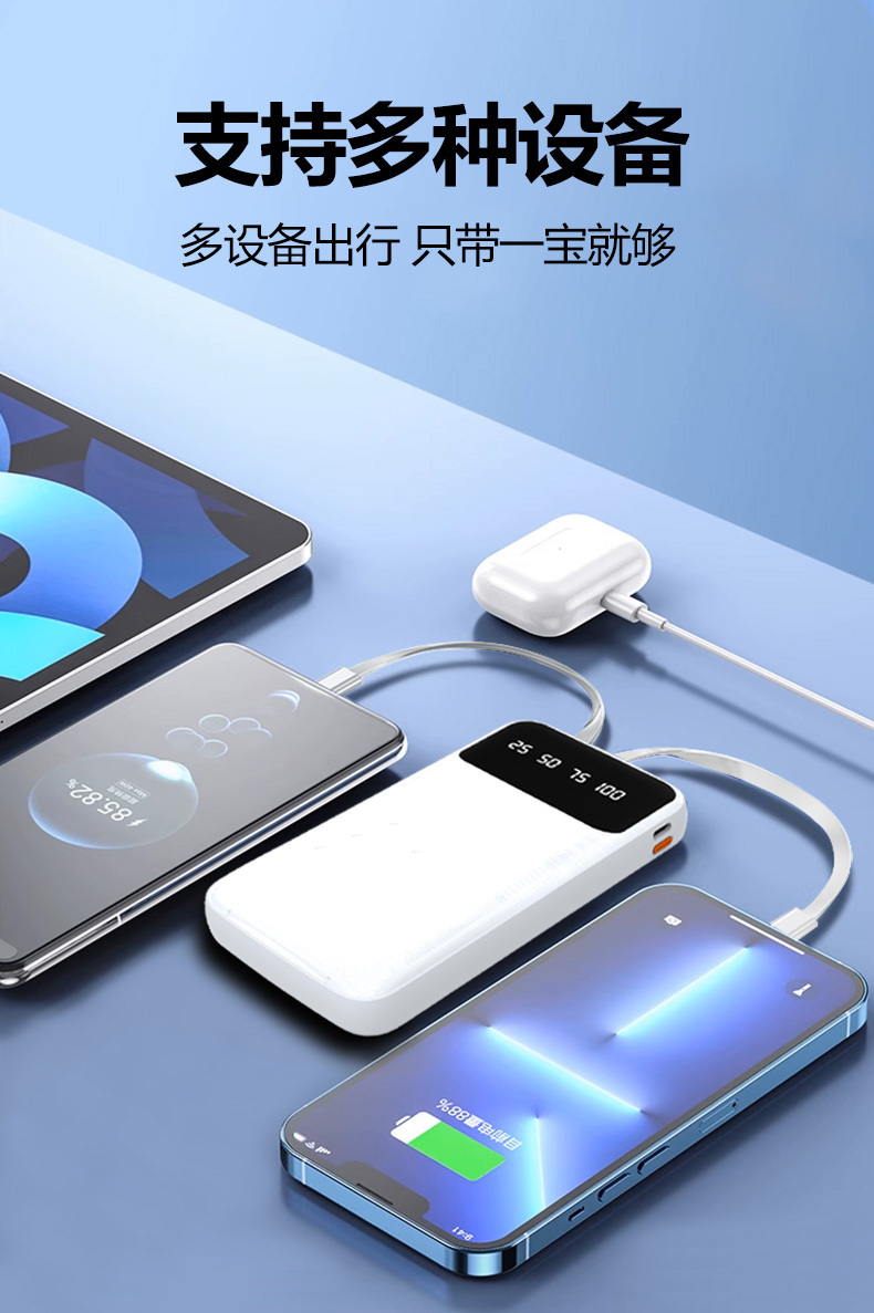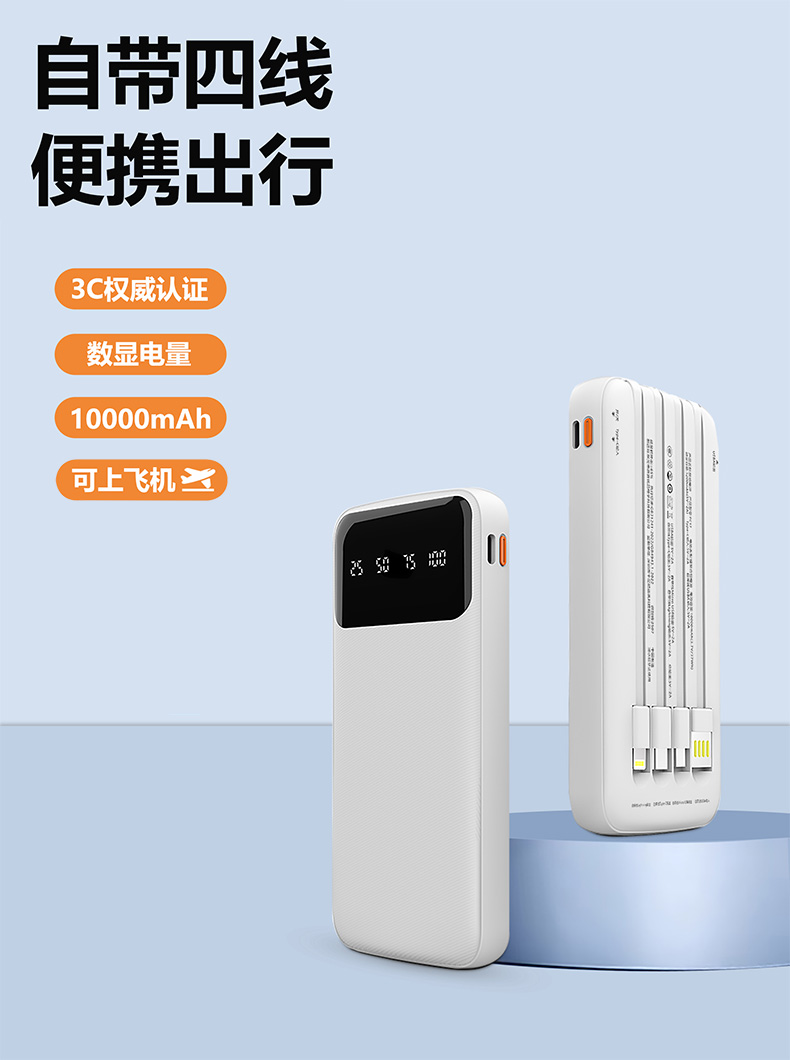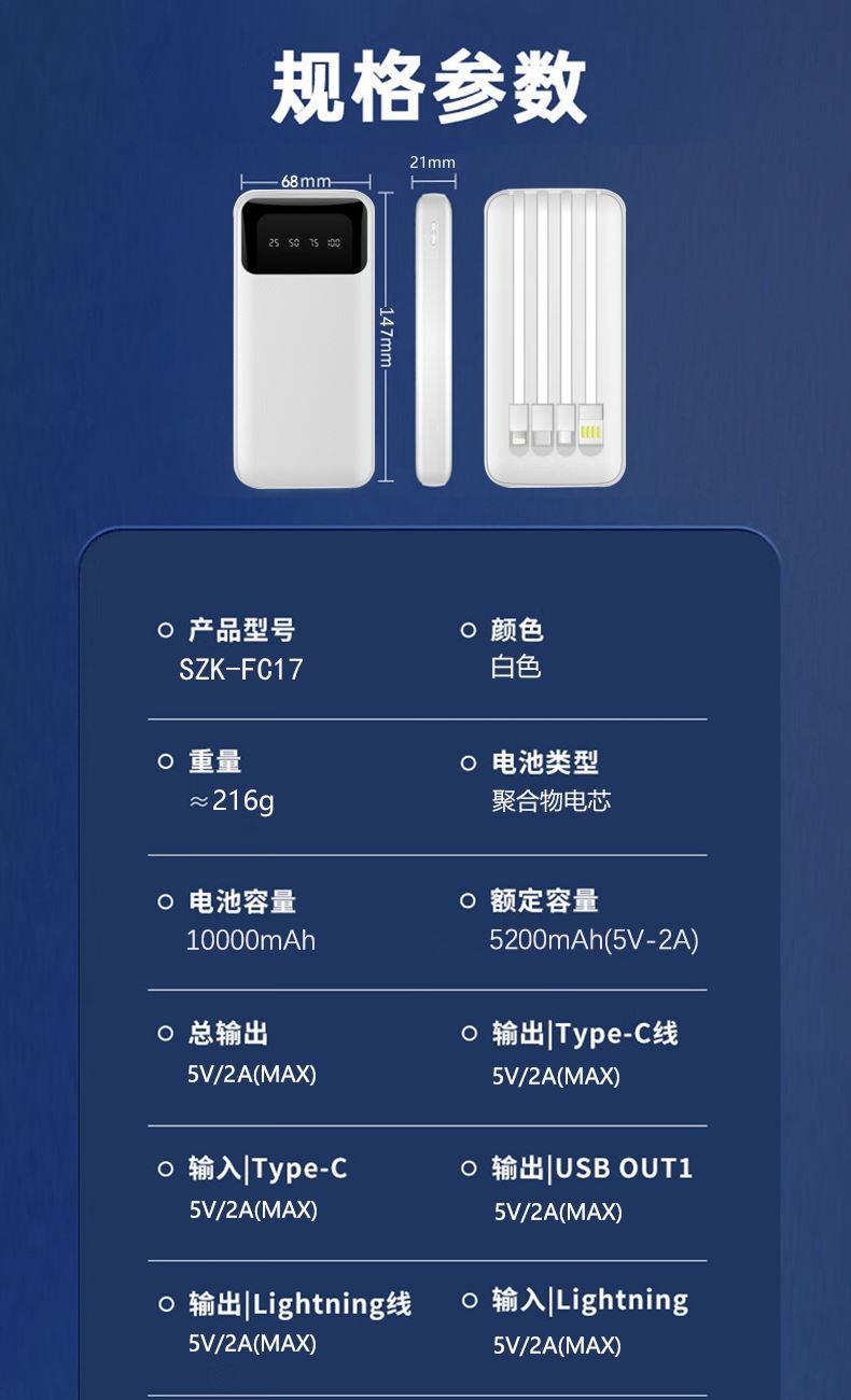 标称容量:10000mAh(3.7V/37Wh ) 输入Type-C口5V⎓2.1A 输出USB口:5V⎓2.1A 输入USB线:5V⎓2.1A 输出Type-C线:5V⎓2.1A 输出Micro线:5V⎓2.1A 产品颜色:白色 产品尺寸:147*68*21mm、 包装尺寸:178*108*35mm 单个净重/毛重: 216g/336g 材质:ABS