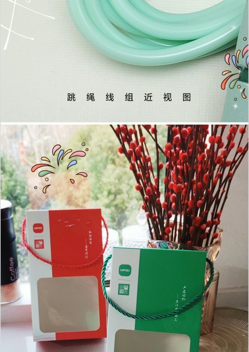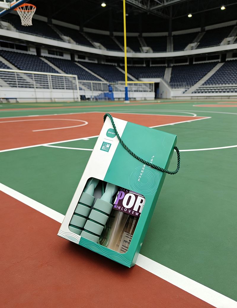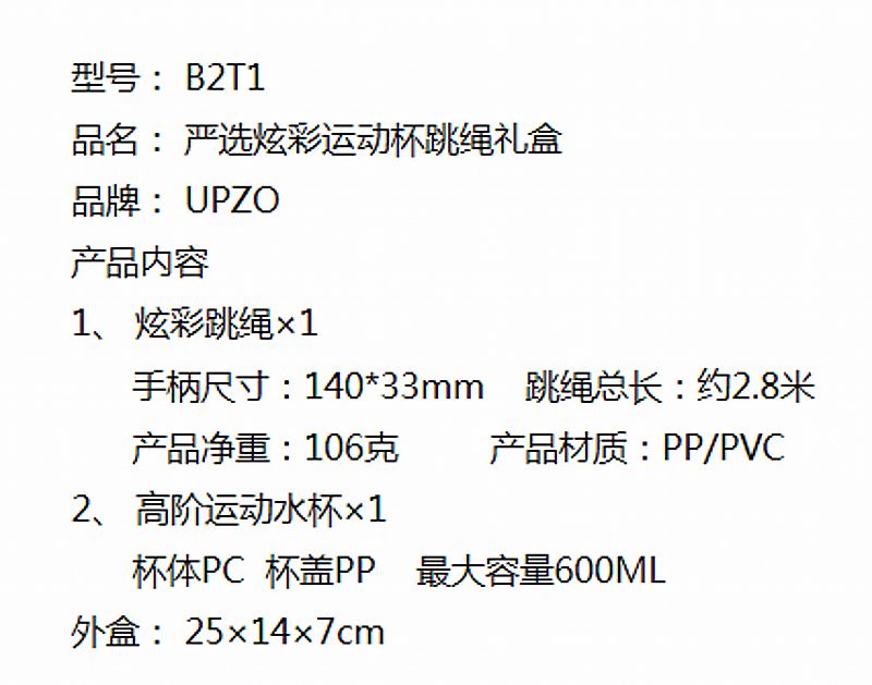 型号: B2T1 产品内容 1、 炫彩跳绳×1 手柄尺寸:140*33mm 跳绳总长:约2.8米 产品净重:115克 产品材质:PP/PVC 2、 高阶运动水杯×1 杯体PC 杯盖PP 容量600ML 外盒: 25×14×7cm 跳绳 双层手柄设计 体感更好 设计清爽 材质优异 运动水杯 双开口方式 长嘴设计 旋转开启畅饮 杯体中间搭配隔热硅胶围绕 外观时尚靓丽 材质稳定 PC优质材料杯身