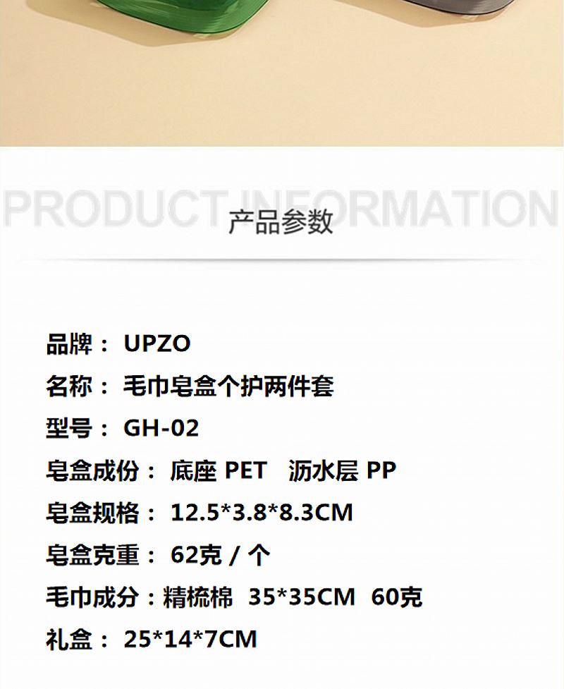 型号: GH-02 皂盒成份: 底座 PET 沥水层 PP 皂盒规格: 12.5*3.8*8.3CM 皂盒克重: 62克 / 个 毛巾成份:精梳棉 35*35CM 60克 礼盒: 25*14*7CM 卫浴小套装 产品实用性强 创意小礼品