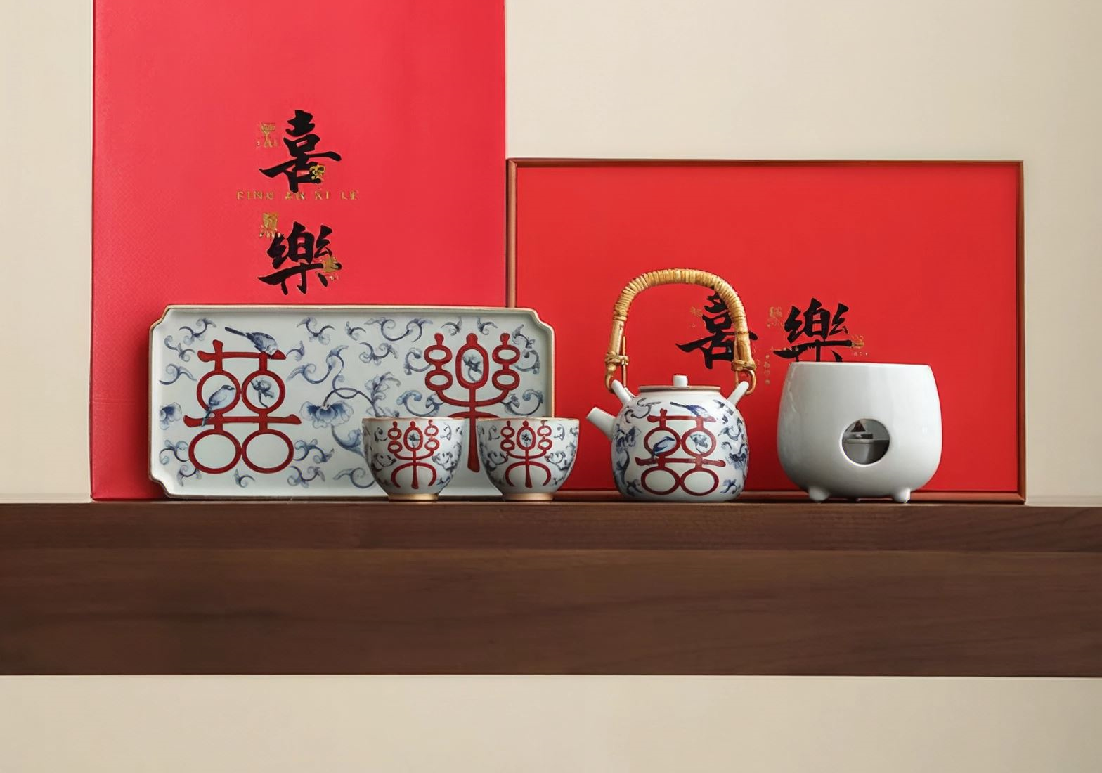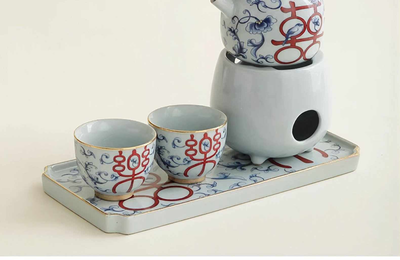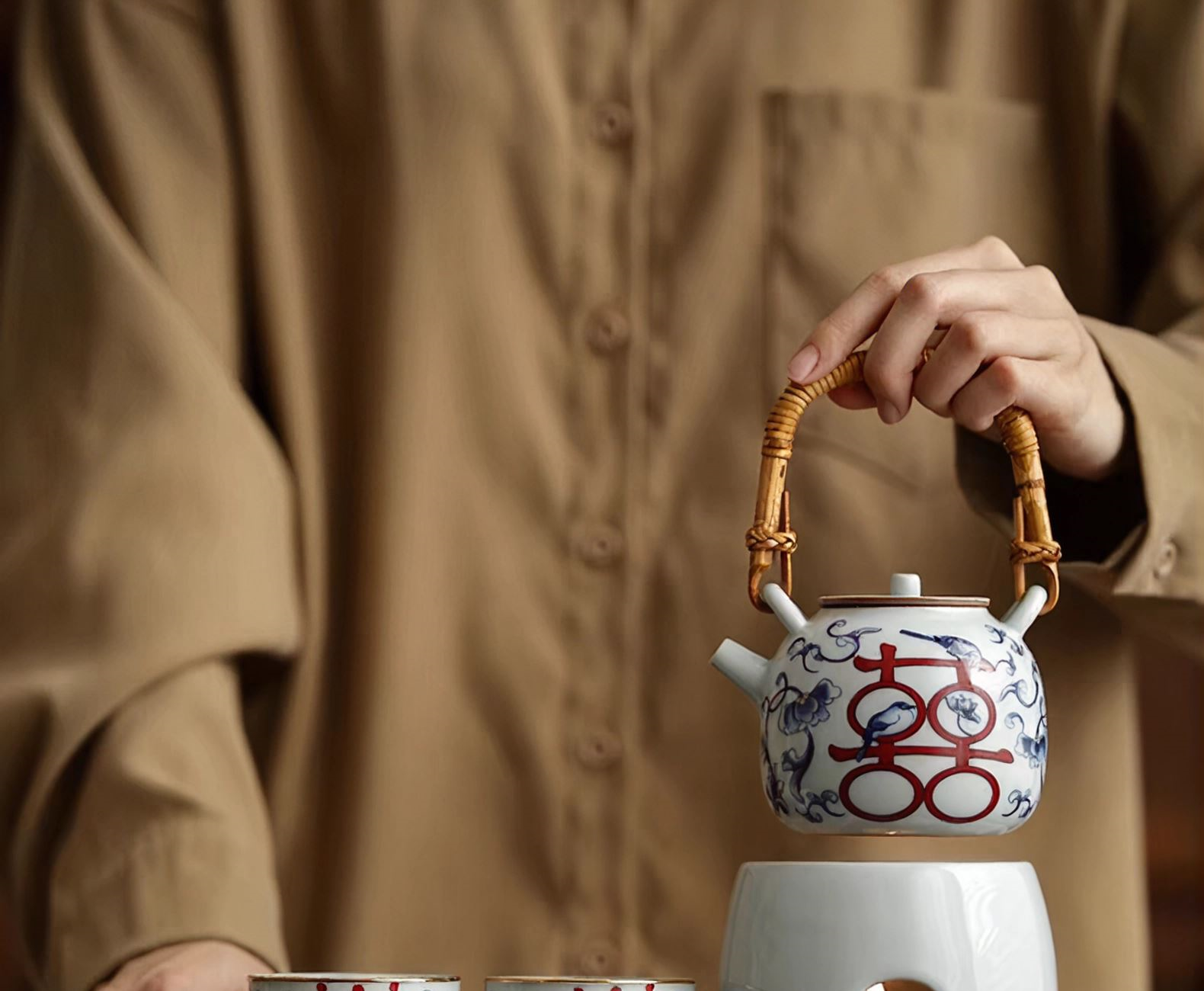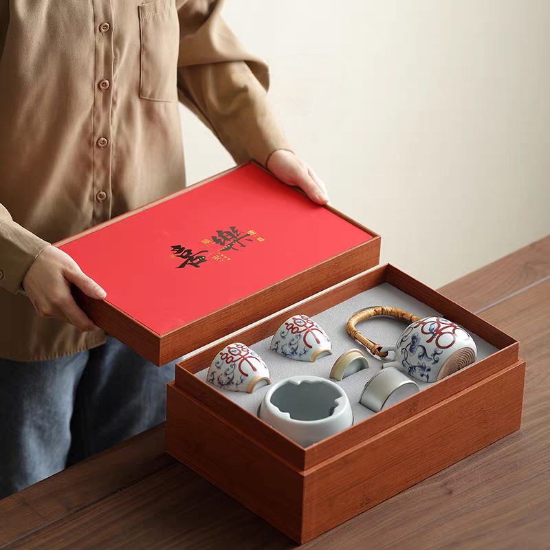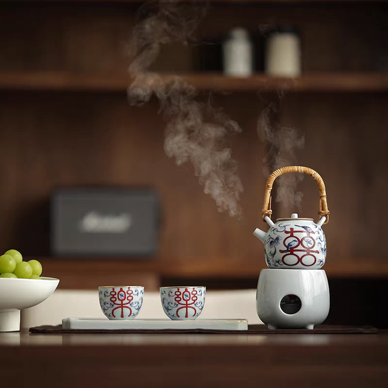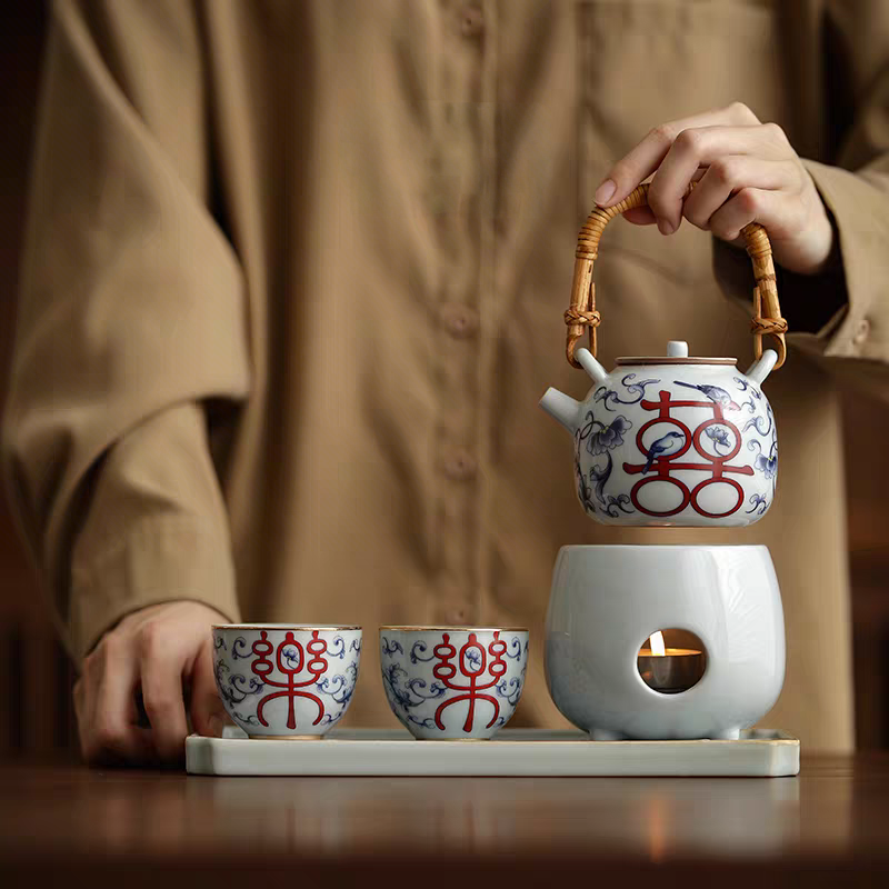 尾桥下窑复古烧青花喜乐陶瓷煮茶壶茶具套装婚庆婚庆节日礼品