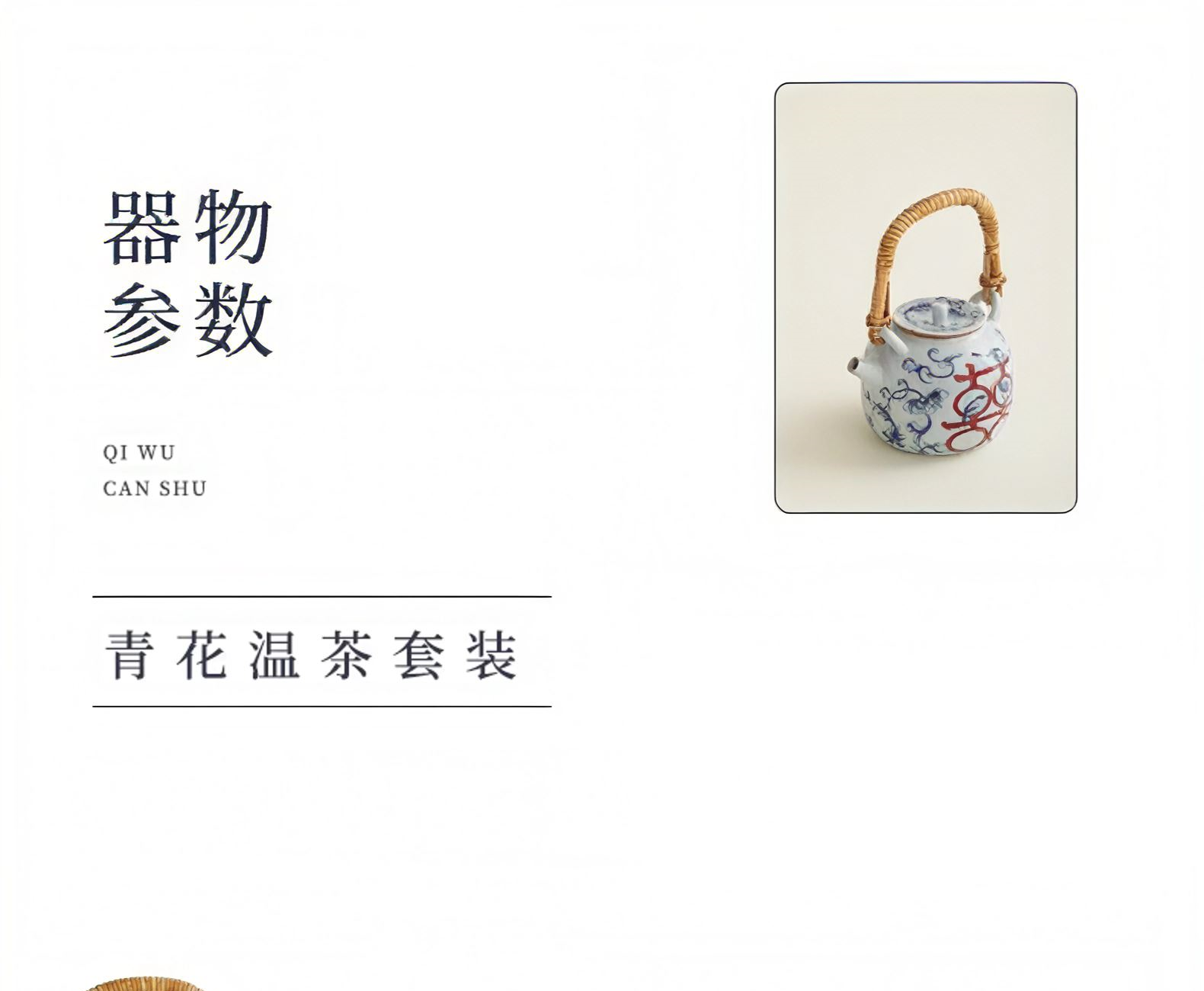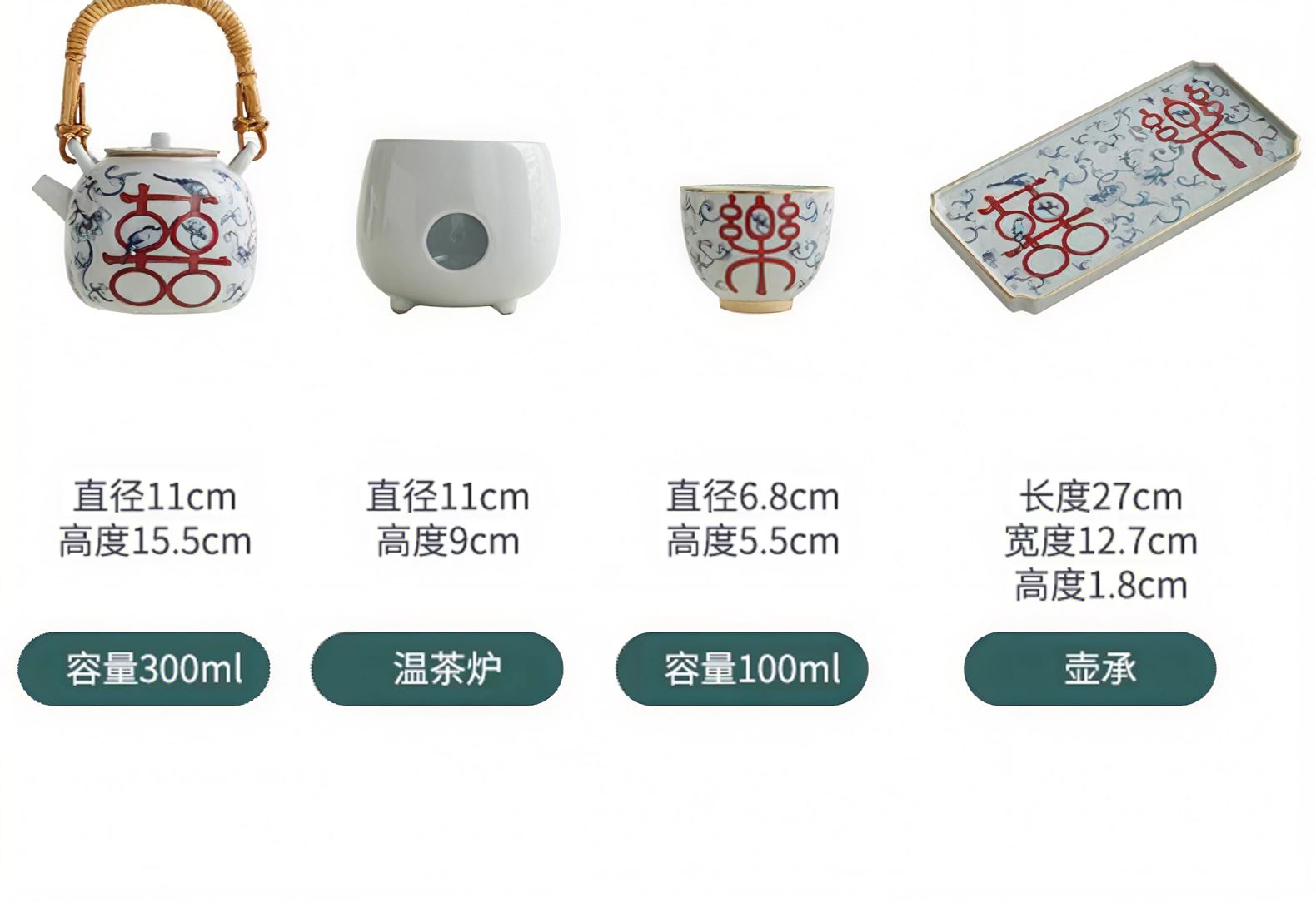 配置:提梁壶*1,温茶炉*1,茶杯*2,干泡盘*1,酒精灯罐子*1. 尺寸:提梁壶11*15.5cm 容量300ml, 温茶炉11*9cm, 茶杯6.8*5.5cm 容量100ml, 干泡盘27*12.7*1.8cm。