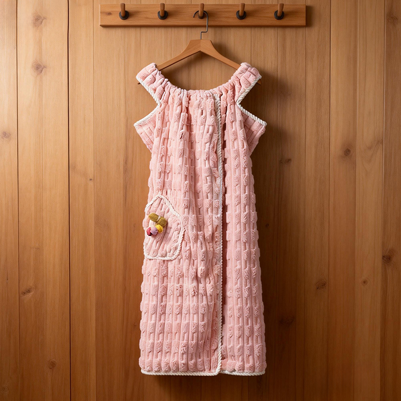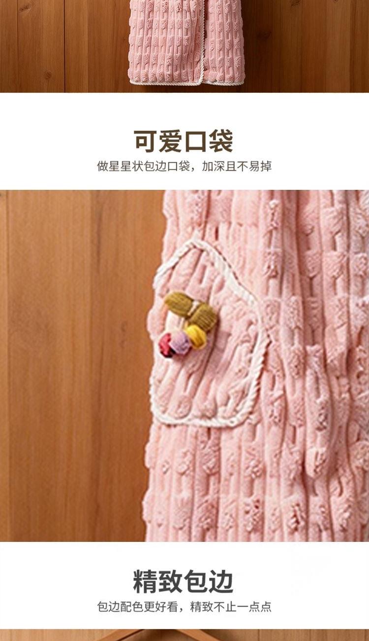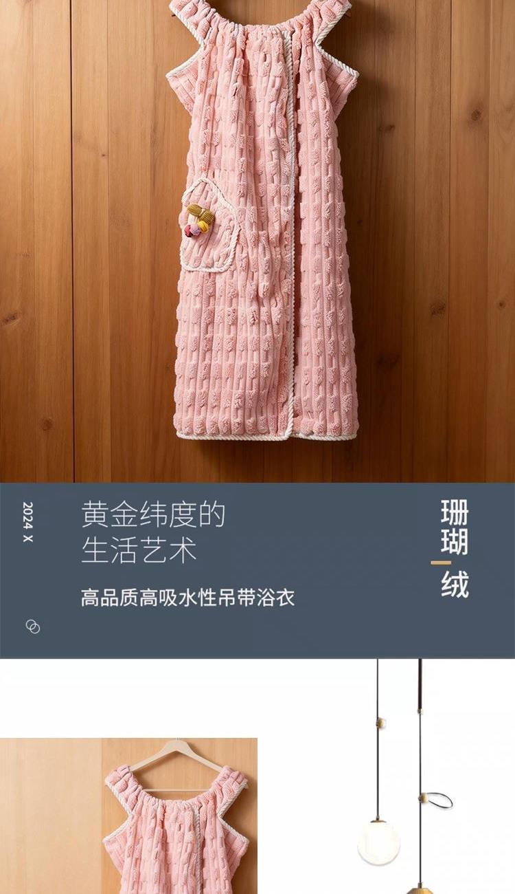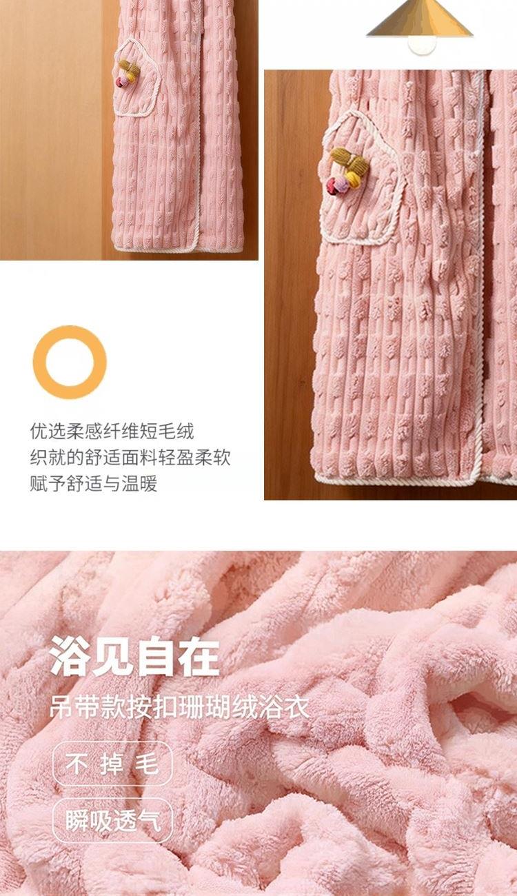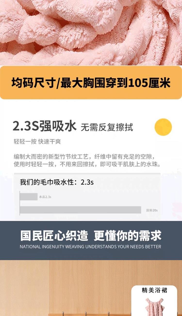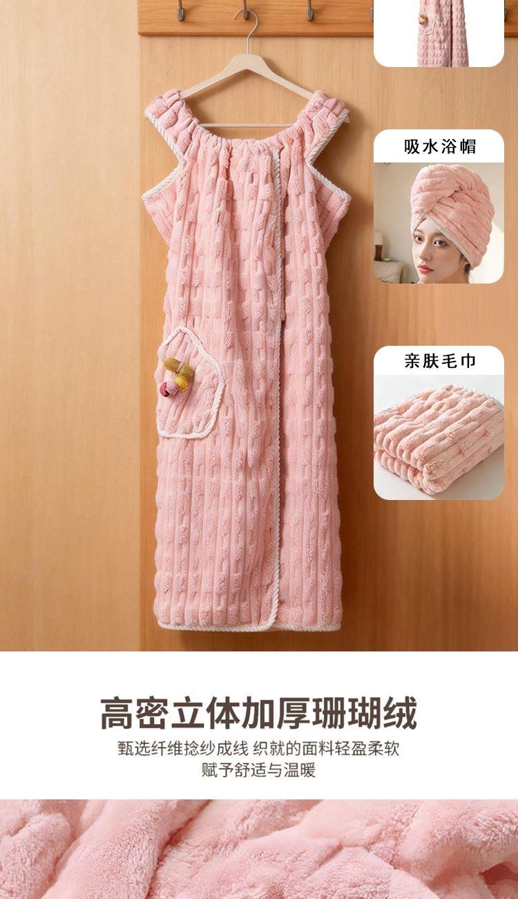 货号:ZMN-MJ023 规格:干发帽:25*65cm*1 浴裙:100*140cm*1、毛巾:35*75cm *1 面料:珊瑚绒(涤纶+锦纶) 卖的: 1、人性化设计,美观,舒适的基础上,也保存了功能性。 2、甄选原料,远离掉毛烦恼,高吸水性 3、撞色包边,时尚设计,不起毛边
