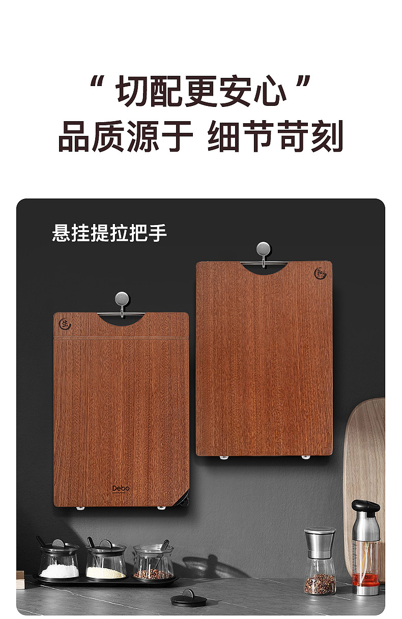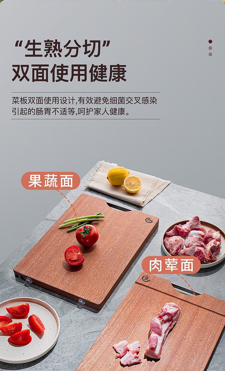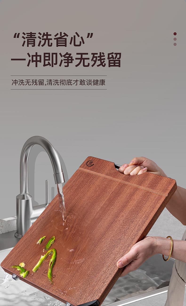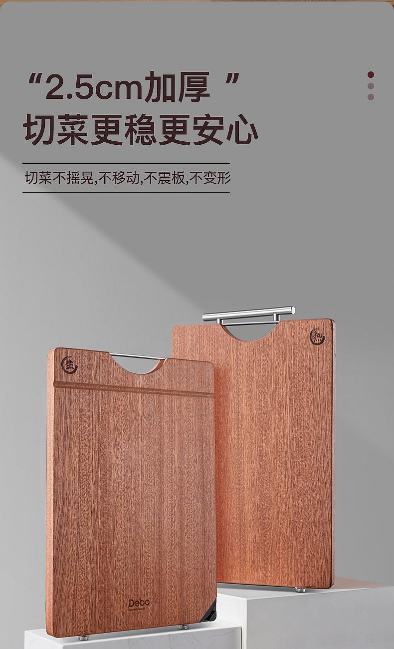尺寸:400x280mm(厚度25mm) 材质:乌檀木 包装尺寸:420*290*33mm 配置:菜板*1 1. 双面可用,生熟分切,避免交叉污染,干净卫生,健康不串味; 2. 甄选木材乌檀木,整木切割,久用不伤刀,不打滑; 3. 不锈钢提手,提取方便,可悬挂收纳,通风沥水。