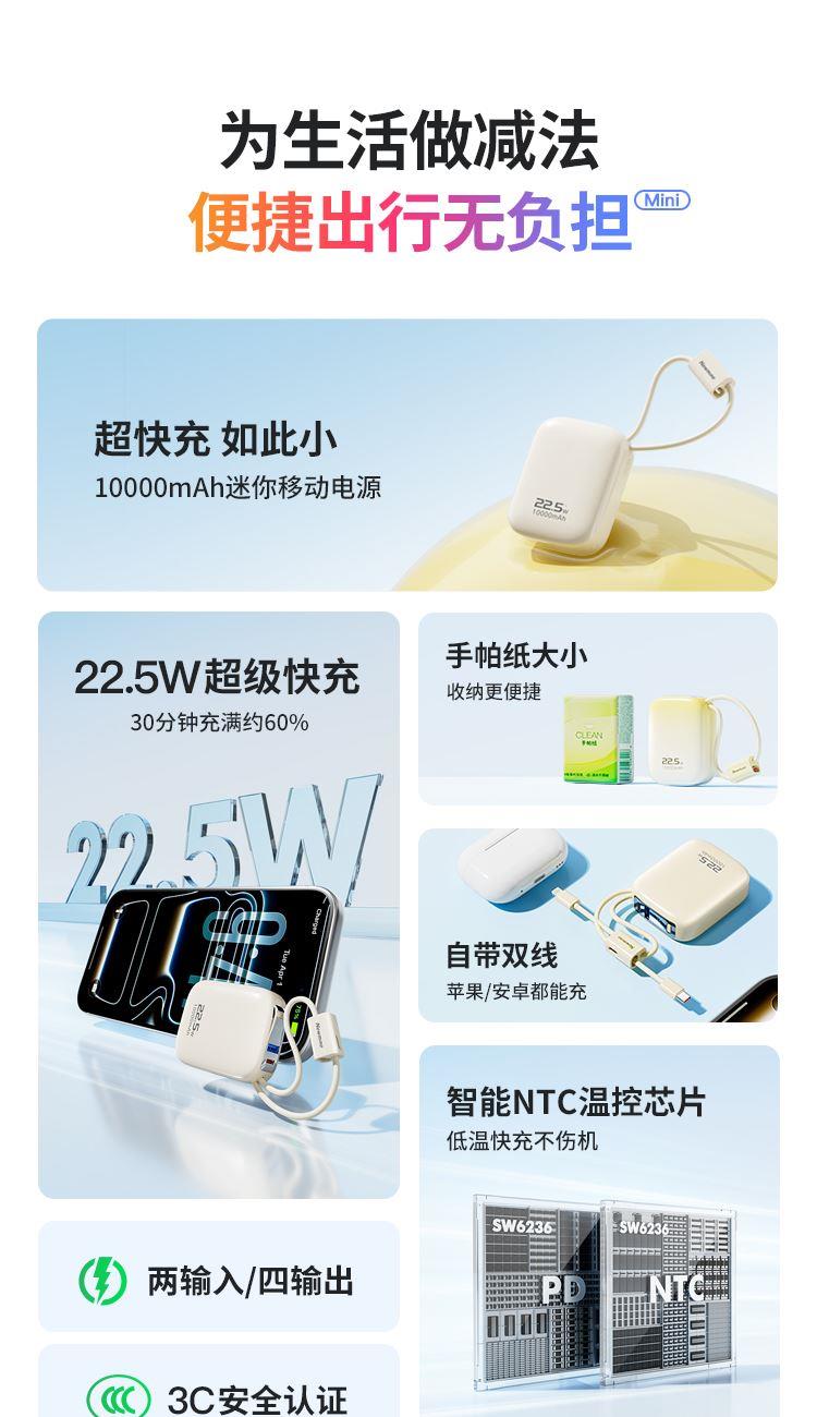 纽曼AL903快充1万毫安迷你自带双线充电宝可上飞机3C