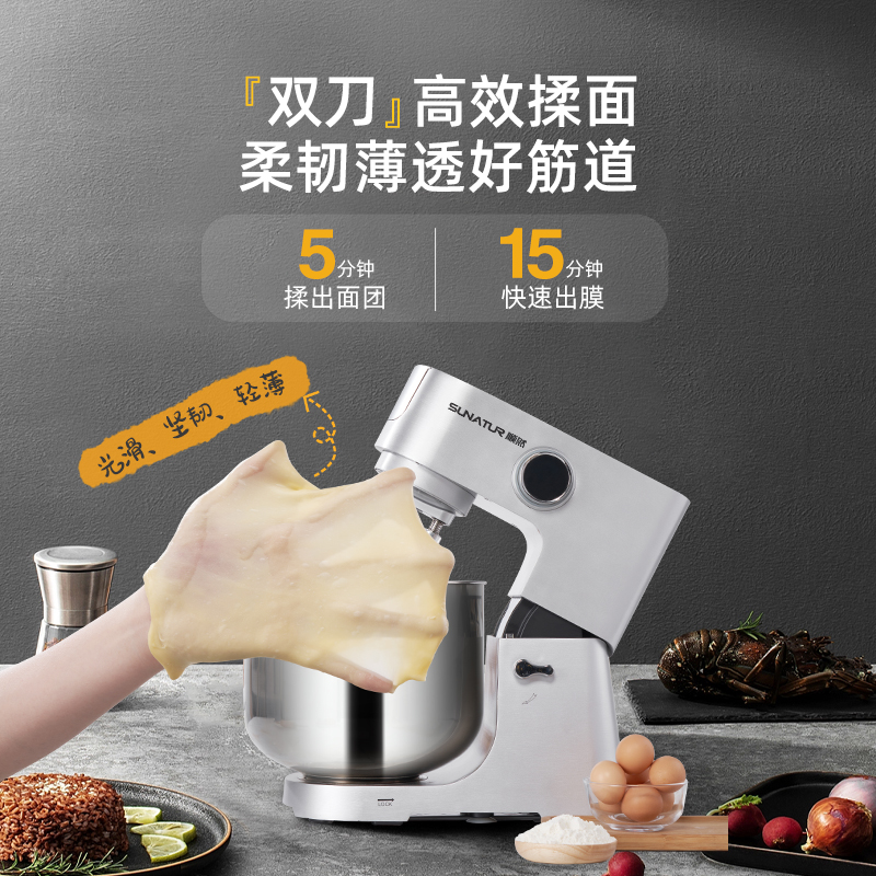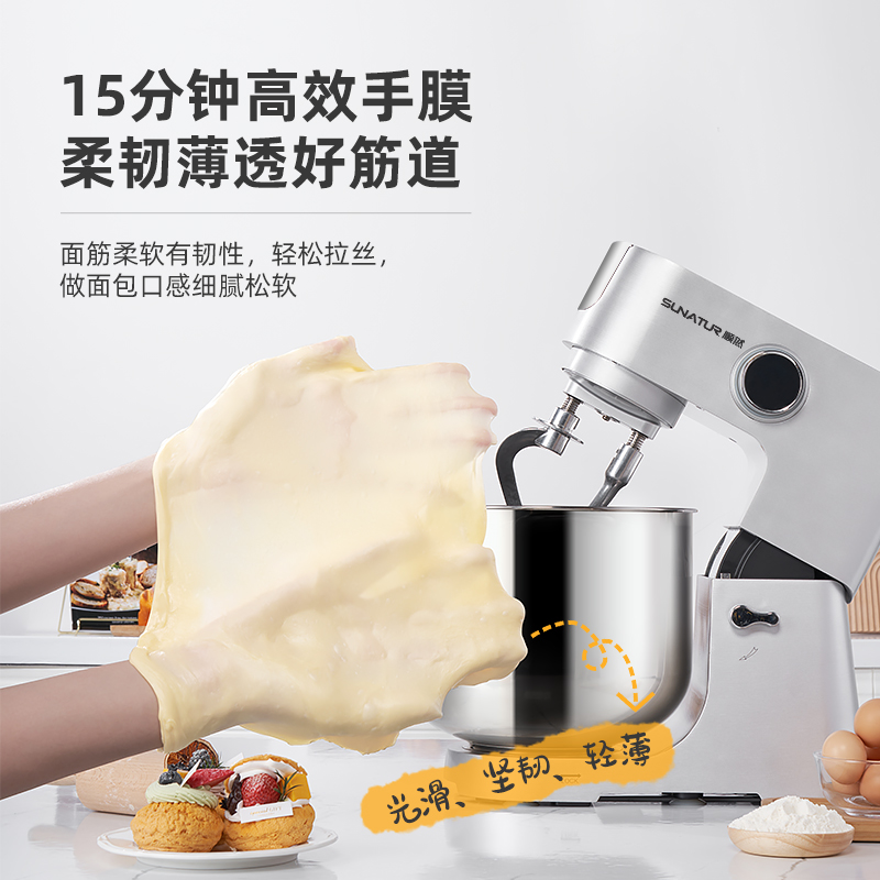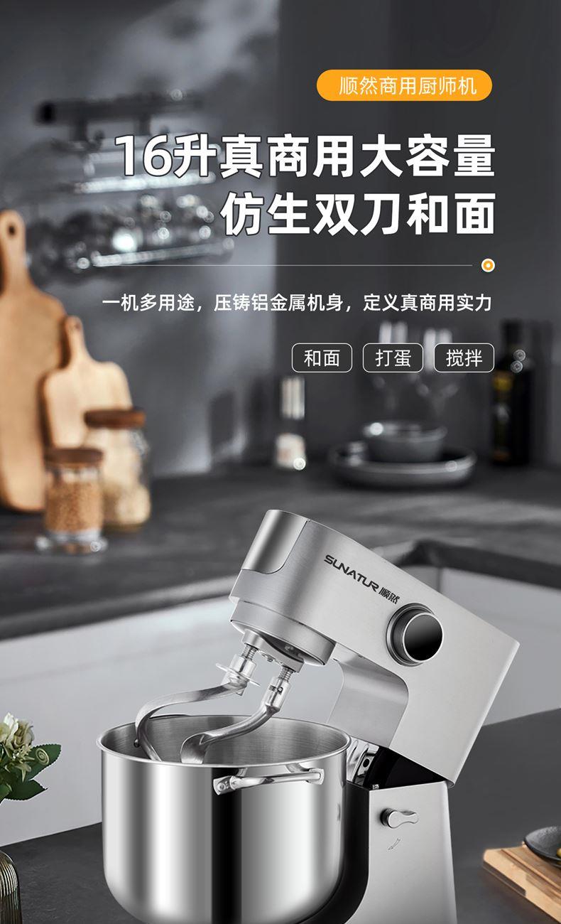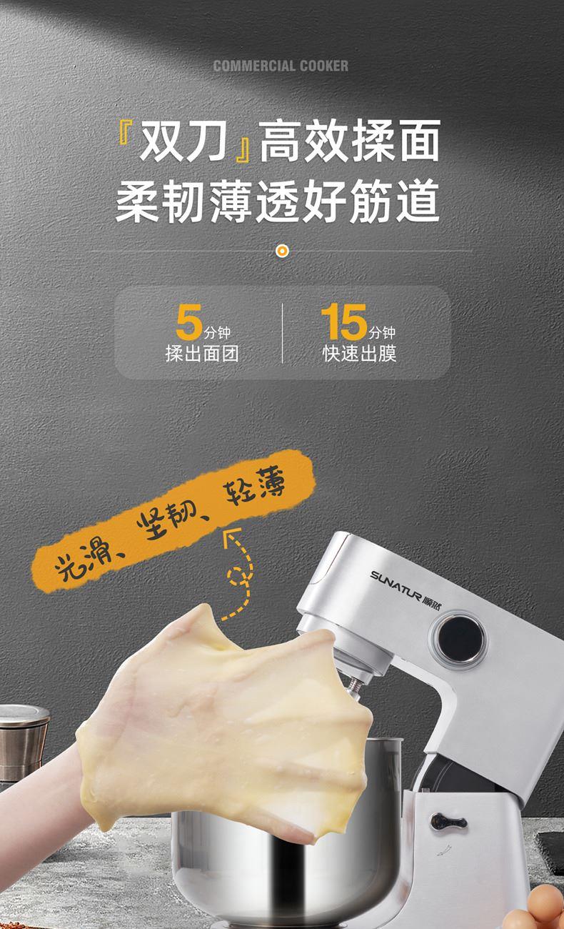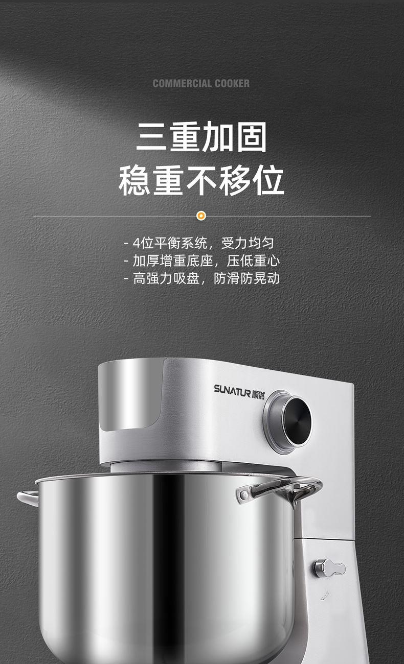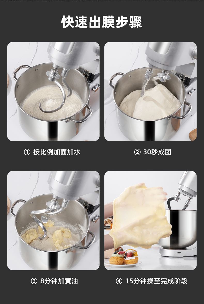 16L大容量,2200w商用大功率,大扭力强劲电机; 金属拉丝机身,不易刮花使用寿命长; IC芯片控制,保证揉面运行速度匀速稳定; 升级双刀和面钩,快速15分钟出膜,面团薄滑柔韧; 8档位无感调速,清晰数显大屏; 双重自冷散热装置保护电机寿命硅胶吸盘底座运行稳定不摇晃; 可选配拓展配件,新增更多玩法,一机多用;
