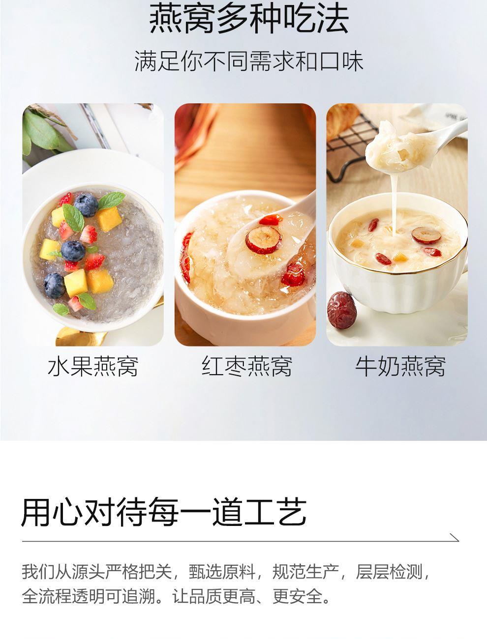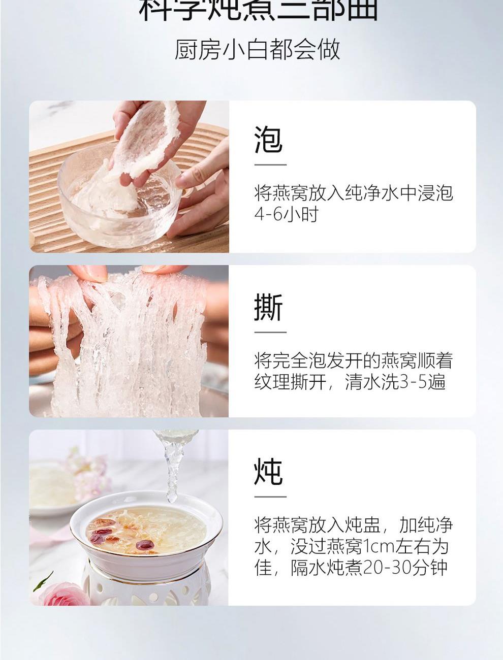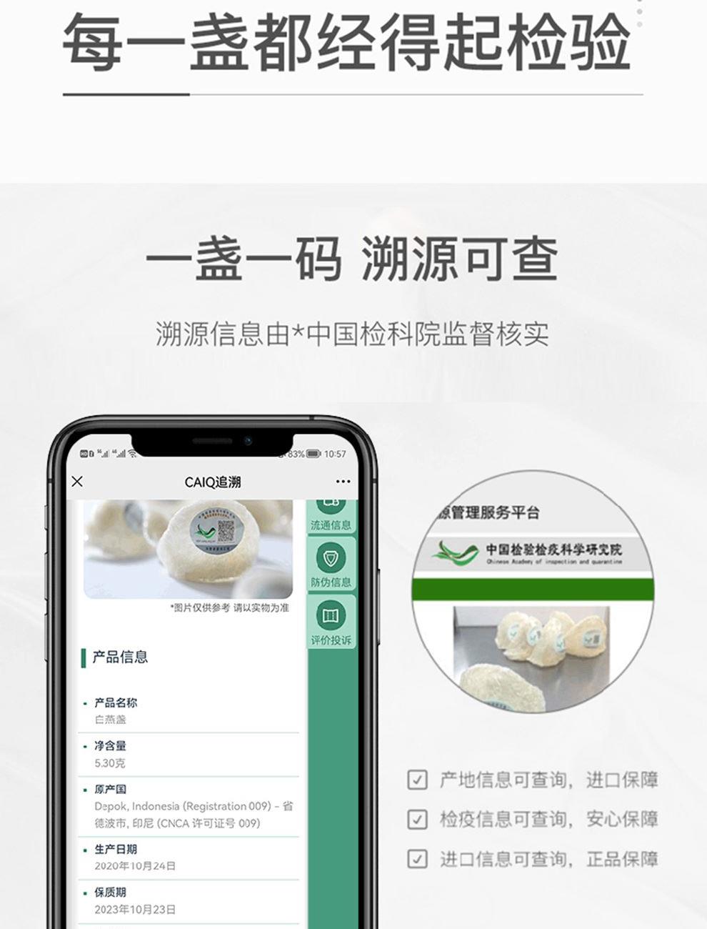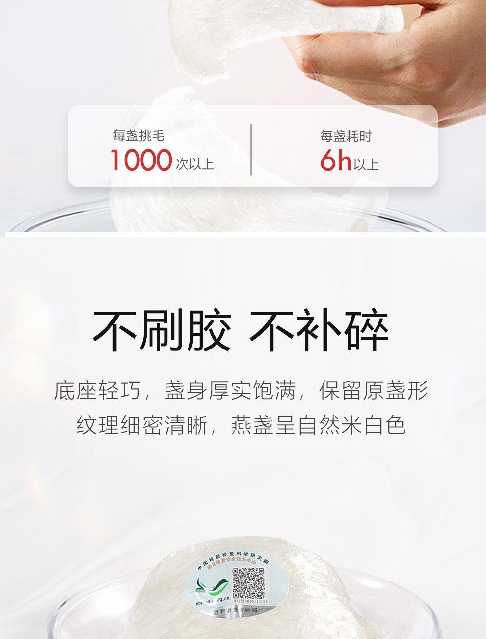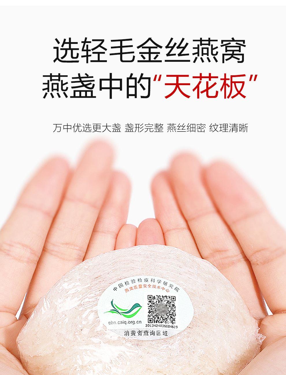 规格:溯源大盏100克 卖点: 1、一盏一码,溯源可查,品质有保障。 2、不刷胶,不补碎,泡发率高达8-10倍。 3、99.9%洁净度,足干足称,不为一滴水分买单。 4、节省时间、免泡发燕盏省去了泡发的时间,可以开始炖煮。 5、免泡发燕盏的加工过程更加标准化,品质更加稳定。