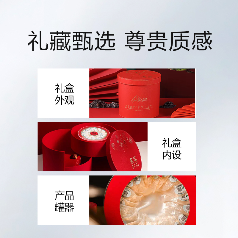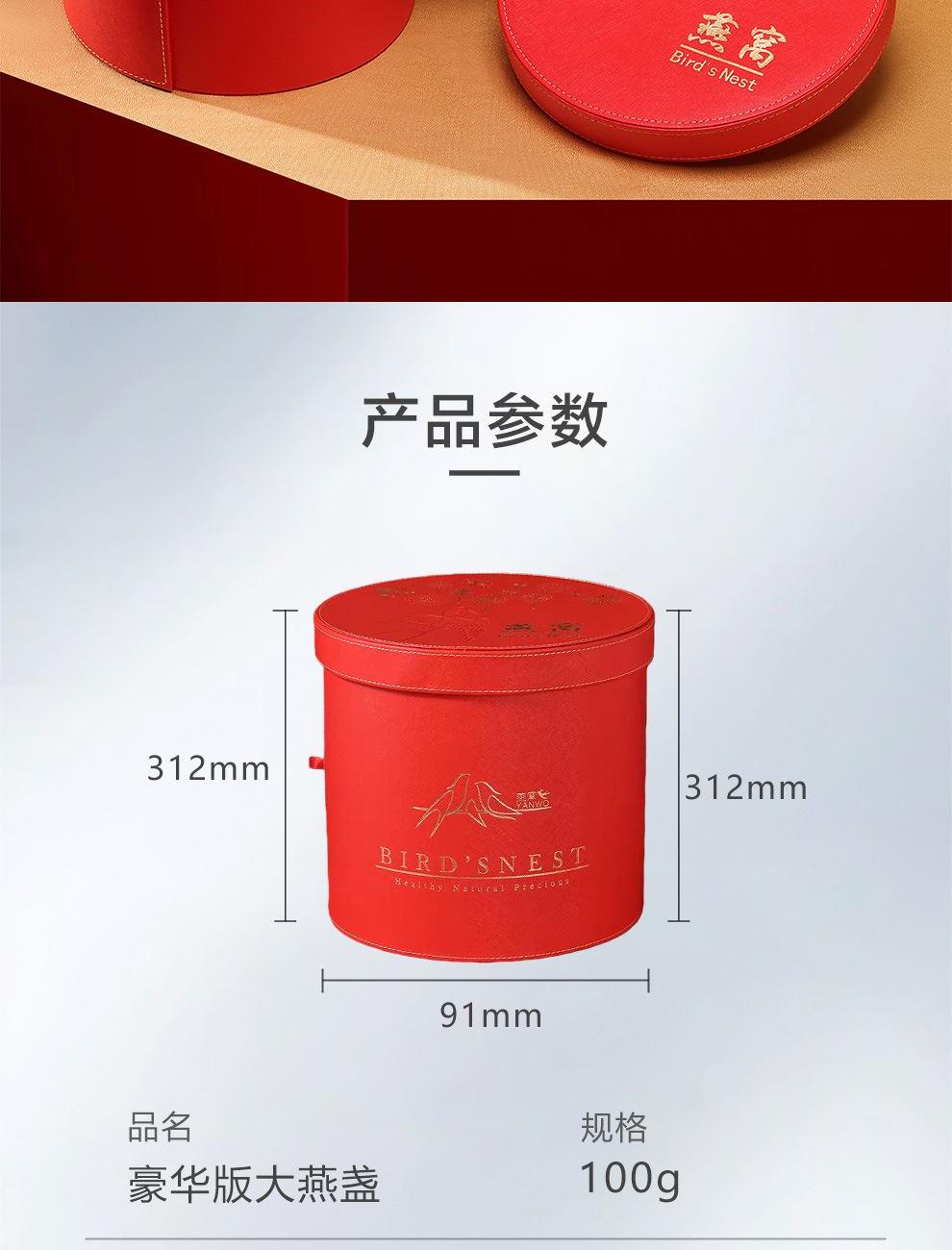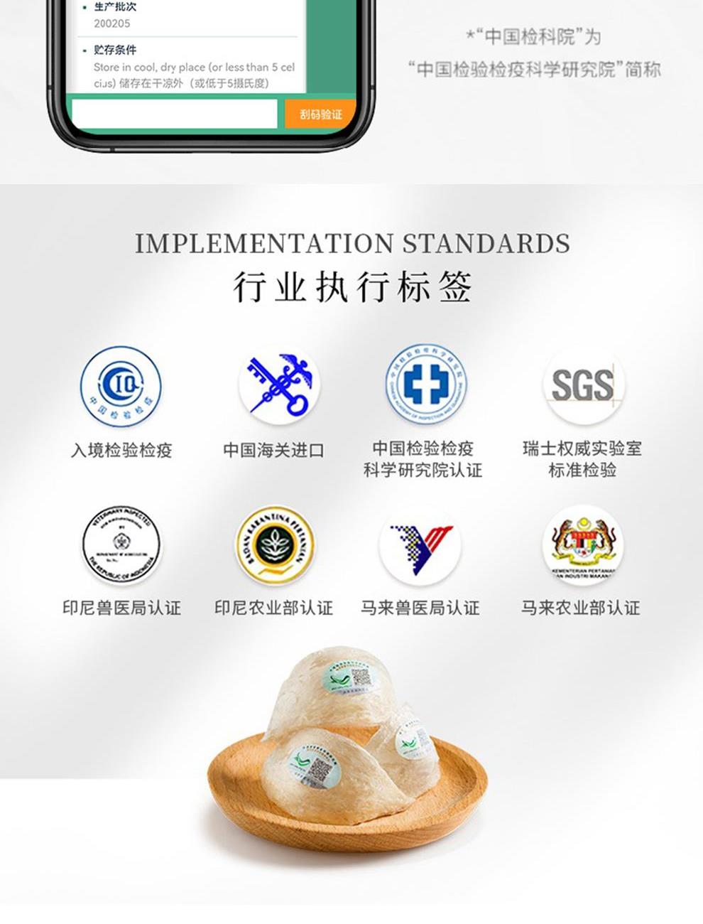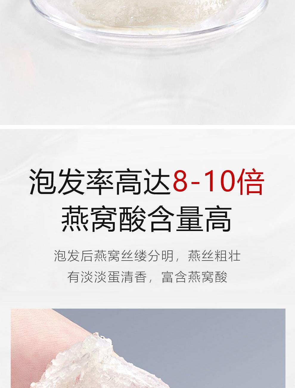 规格:溯源大盏100克 卖点: 1、一盏一码,溯源可查,品质有保障。 2、不刷胶,不补碎,泡发率高达8-10倍。 3、99.9%洁净度,足干足称,不为一滴水分买单。 4、节省时间、免泡发燕盏省去了泡发的时间,可以开始炖煮。 5、免泡发燕盏的加工过程更加标准化,品质更加稳定。