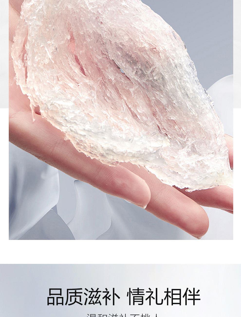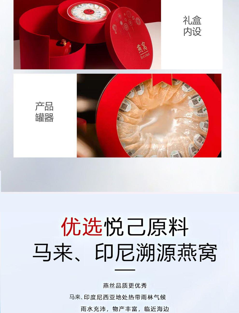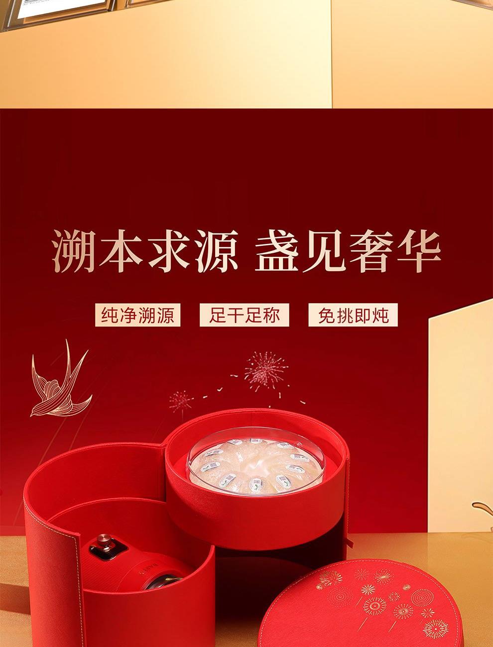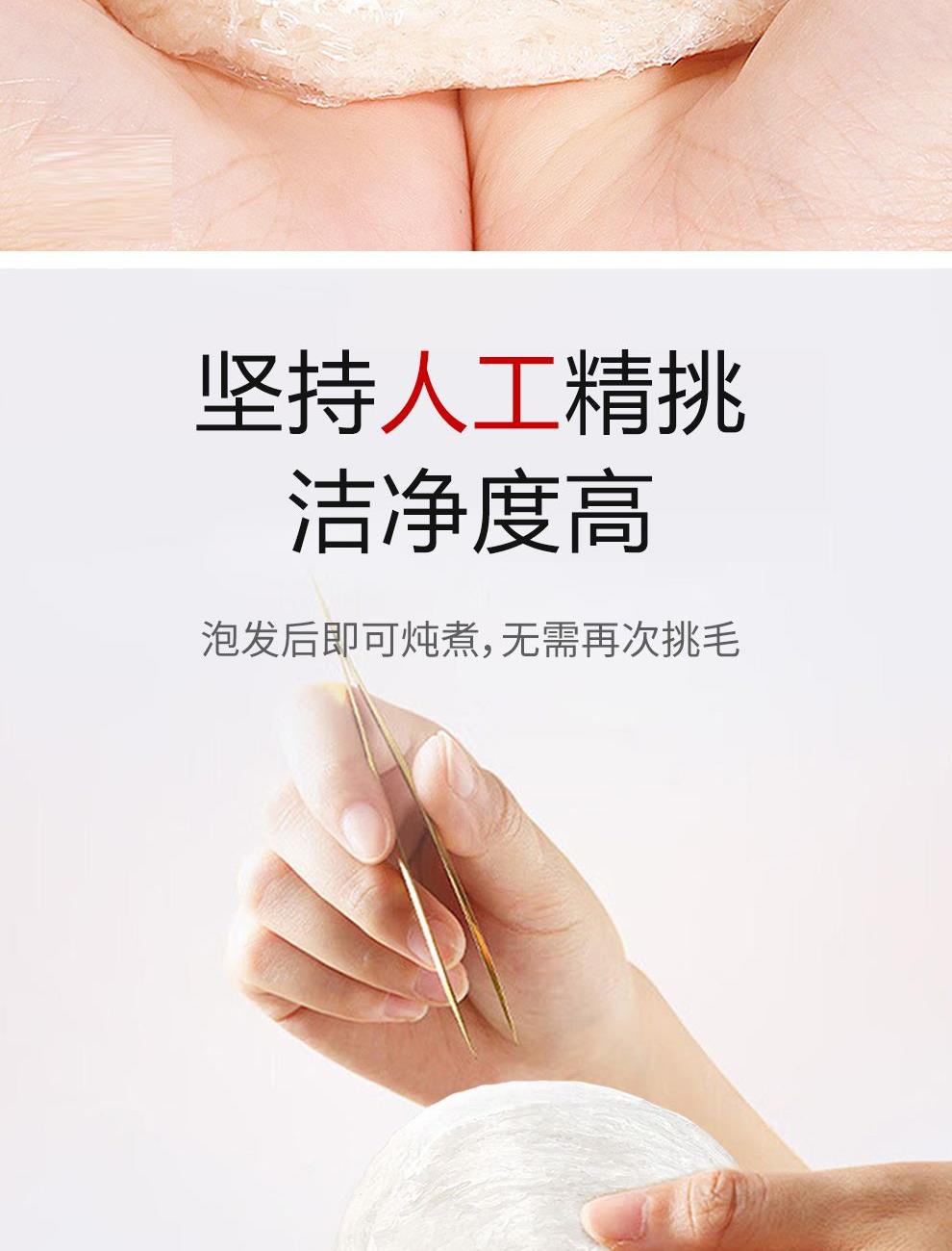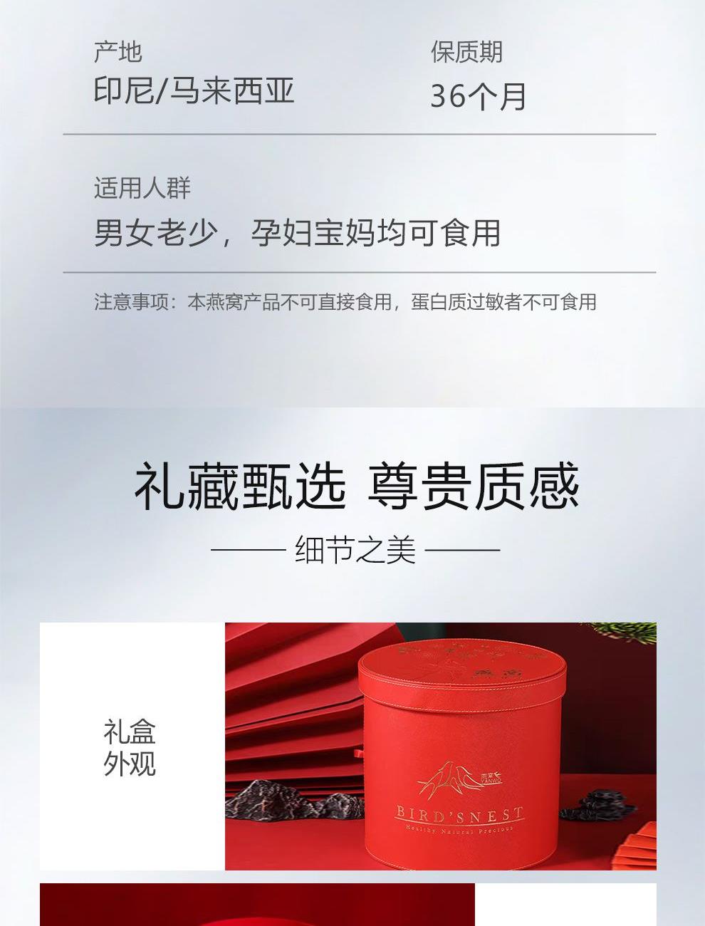 规格:溯源大盏100克 卖点: 1、一盏一码,溯源可查,品质有保障。 2、不刷胶,不补碎,泡发率高达8-10倍。 3、99.9%洁净度,足干足称,不为一滴水分买单。 4、节省时间、免泡发燕盏省去了泡发的时间,可以开始炖煮。 5、免泡发燕盏的加工过程更加标准化,品质更加稳定。