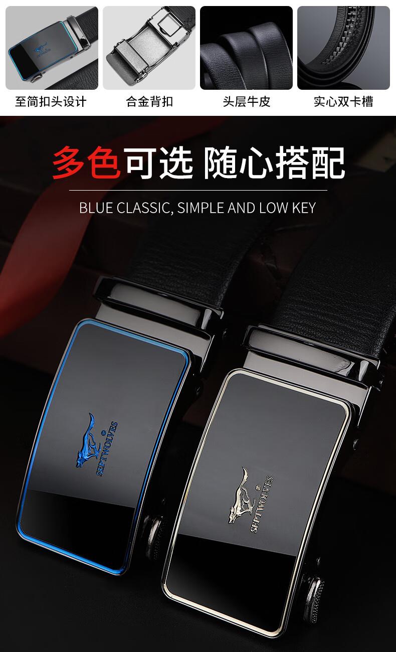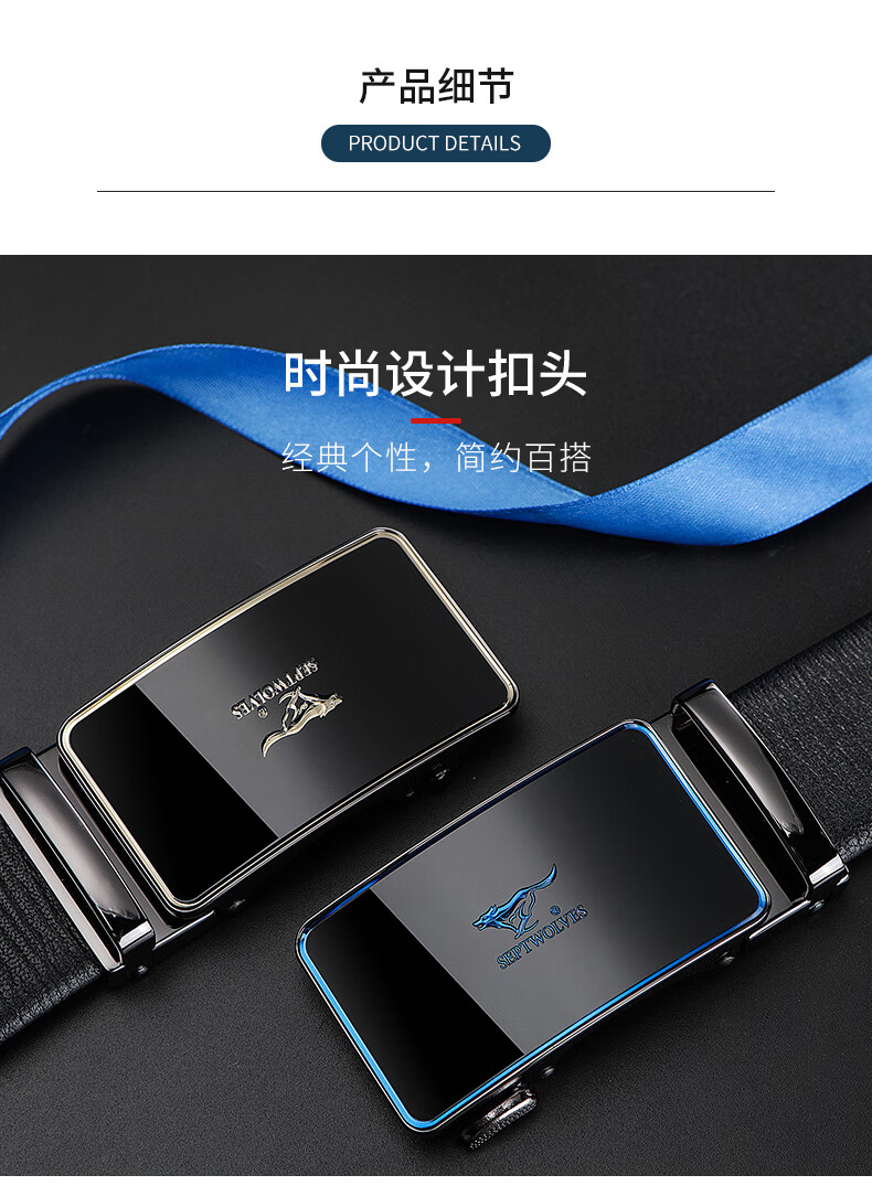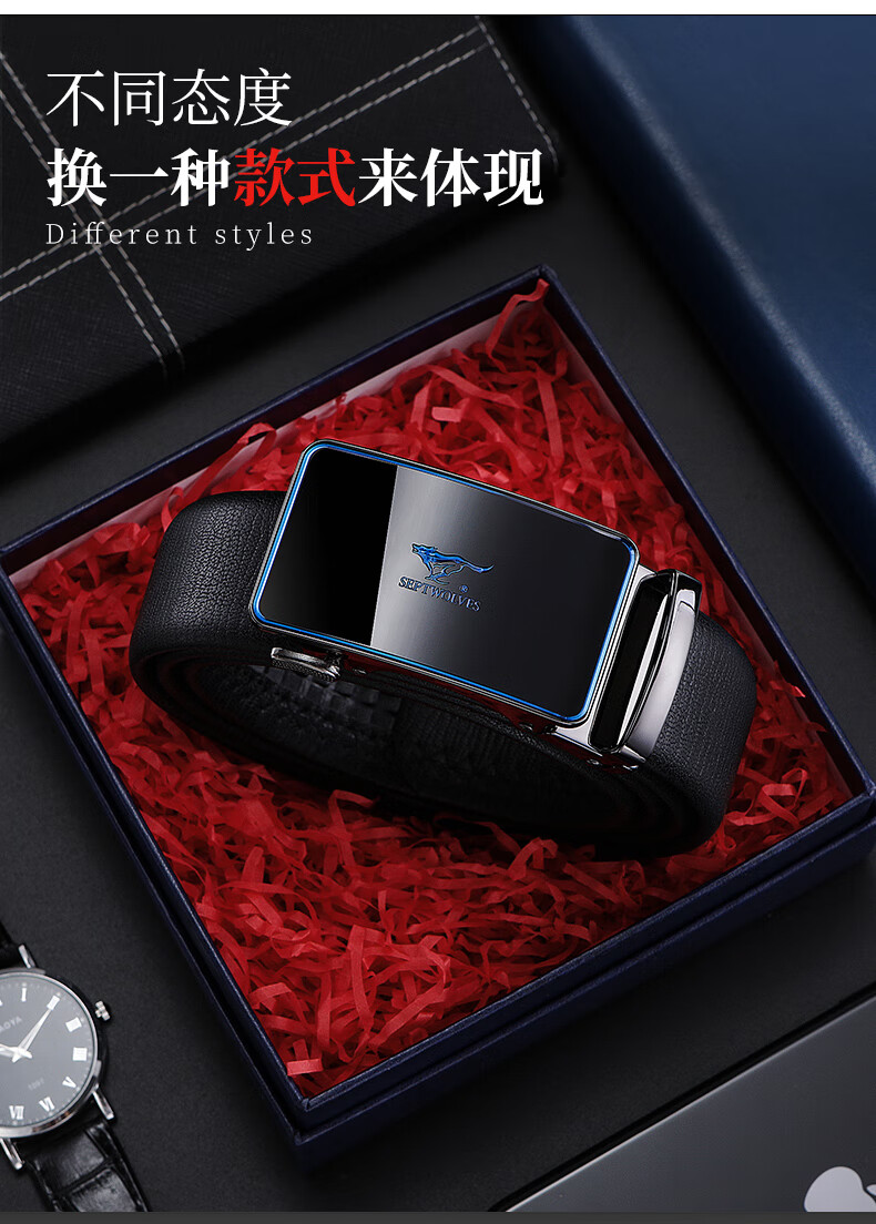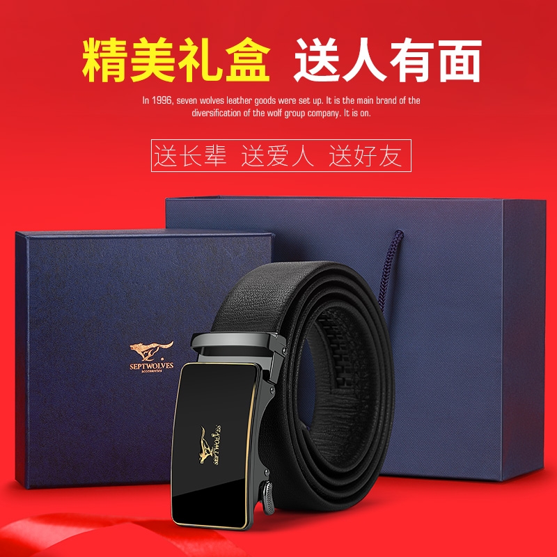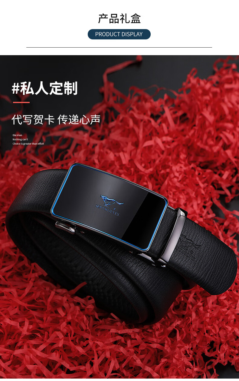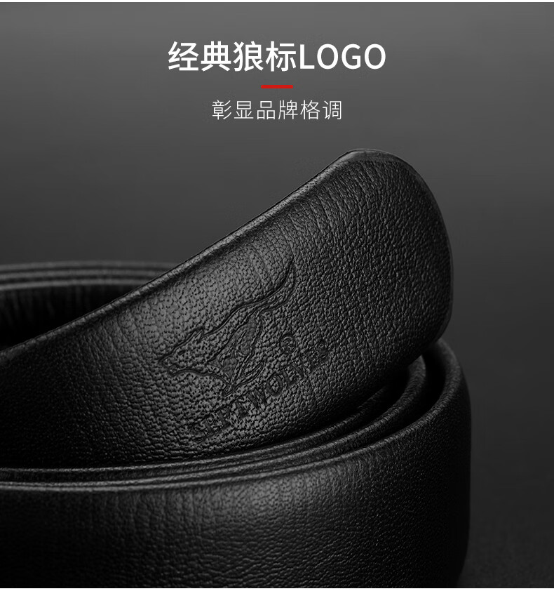 工艺:光面 带扣:自动扣 主体材质:头层牛皮 带扣材质:合金 风格:通勤风 商务风 宽度:3.5CM 送爱人,送长辈,送男士 时尚设计扣头,经典个性,简约百搭,磨砂背扣,材质柔软,手感舒适,经典狼标LOGO 代写贺卡,传递心声,精美礼盒,送礼佳品