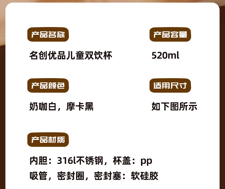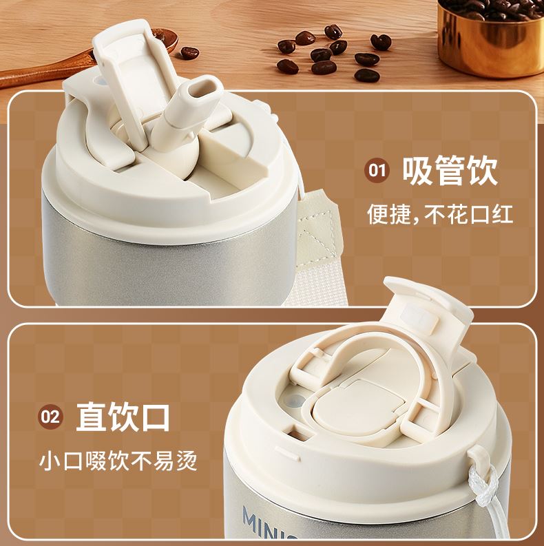 内胆:316l不锈钢, 杯盖:pp 吸管, 密封圈,密封塞:软硅胶 功能:双饮 颜色:黑色、白色 包装:彩盒 功能:一键速开,双饮 适用人群:男士,女士 适用场景:职场,家用,车用,通用