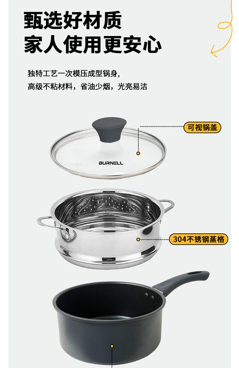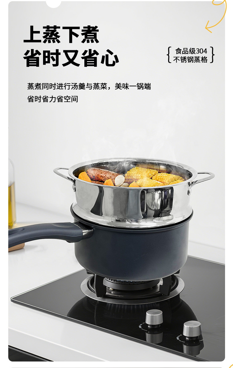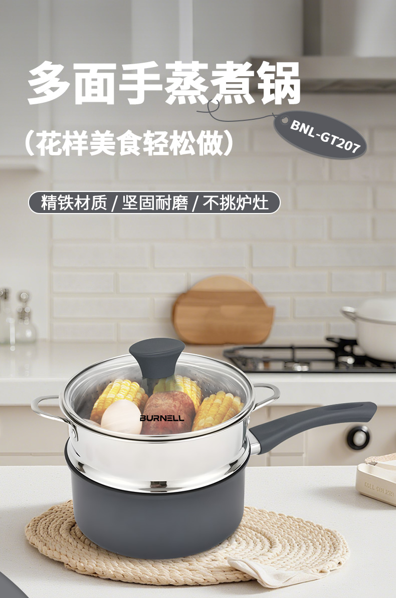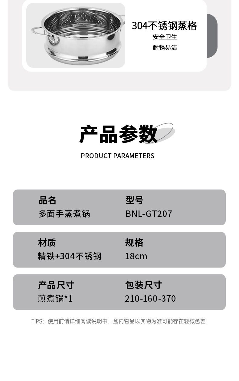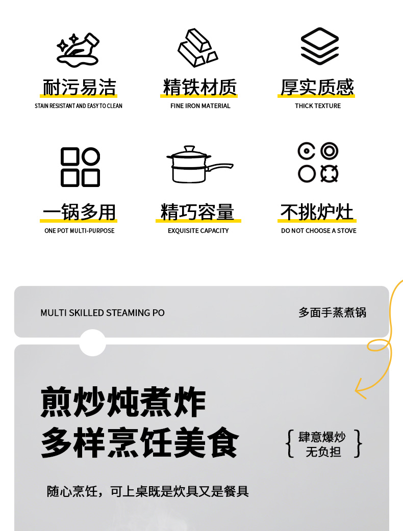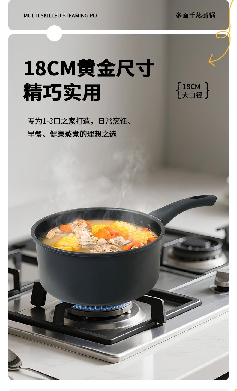 材 质:精铁+304不锈钢 规 格:18cm 配 置:锅*1;蒸笼*1 装 箱 数:10pcs/箱 包装尺寸:210*370*160mm 锅体采用精铁材质,独特工艺一次模压成型锅身。 省油少烟,光亮易洁。 食品级304不锈钢蒸格:安全卫生,耐锈易洁,蒸食无忧,持久如新。 一锅两用,效率翻倍:蒸煮同时进行汤羹与蒸菜, 美味一锅端,省时省力省空间。 18cm黄金尺寸 精巧实用:专为1-3口之家打造, 日常烹饪、快手早餐、健康蒸煮的理想之选。