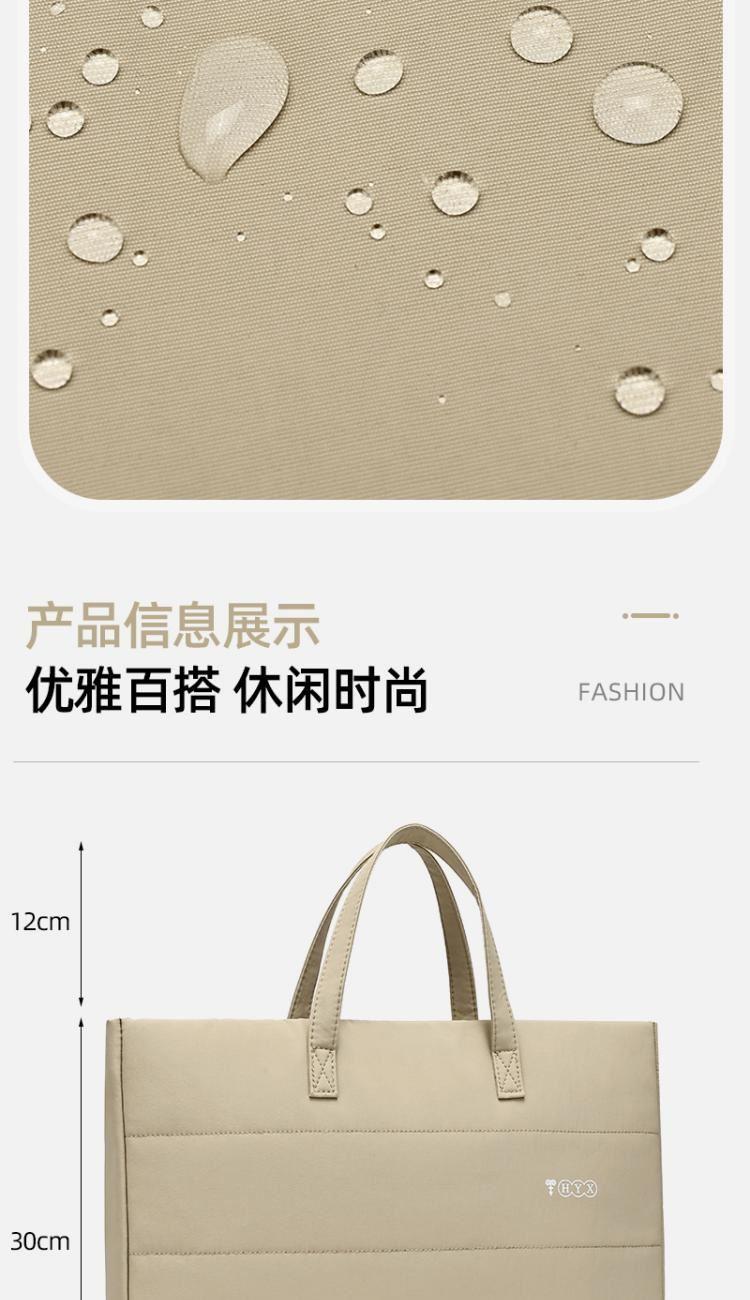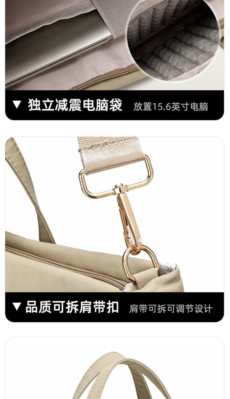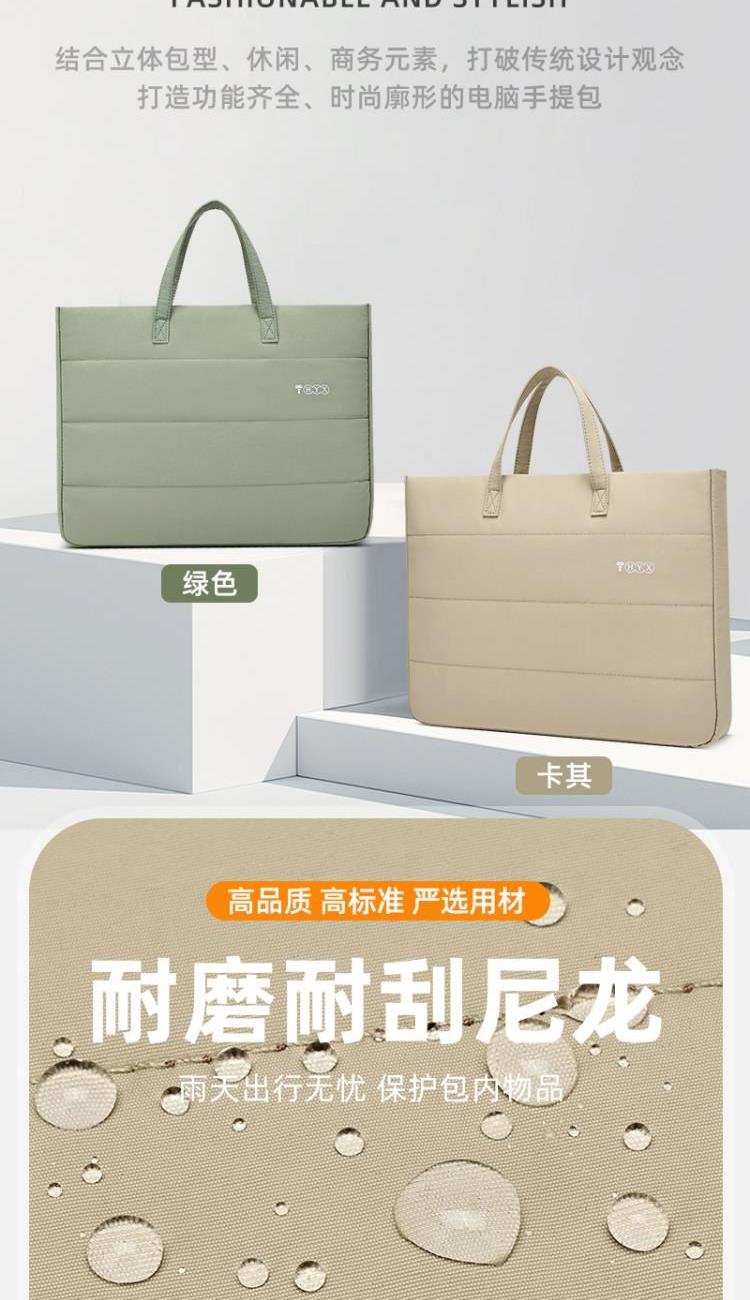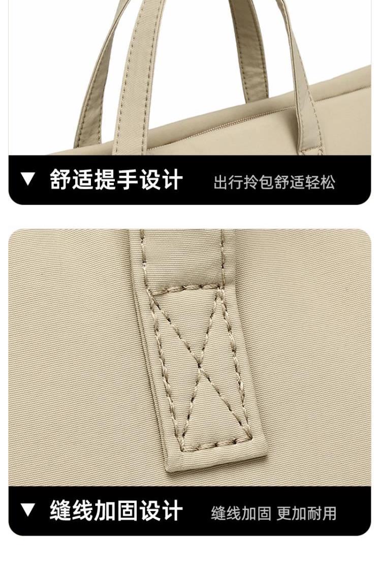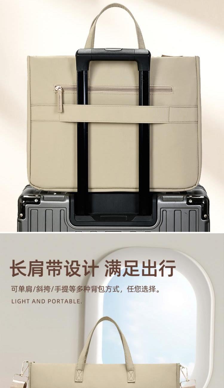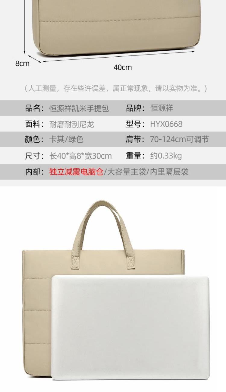 产品型号:HYX0668 产品重量:0.33kg 产品规格:40*8*30cm 产品颜色:卡其、浅绿 产品卖点:优选欧美出口畅销防水尼龙材质,时尚、结实; 大容量手提包,兼顾商务,设有独立防震抗摔14英寸电脑仓; 人性化拉杆织带设计,插在拉杆箱上,旅行更方便。 可拆卸单肩背背带,可提可背,双重场景切换。