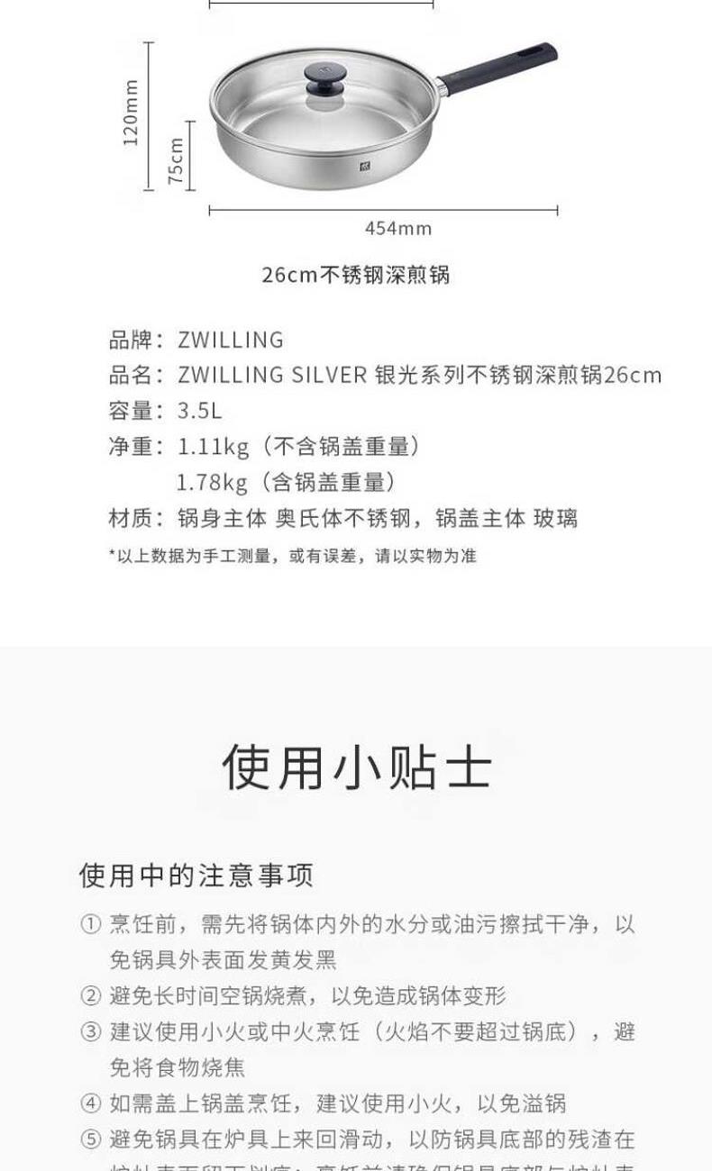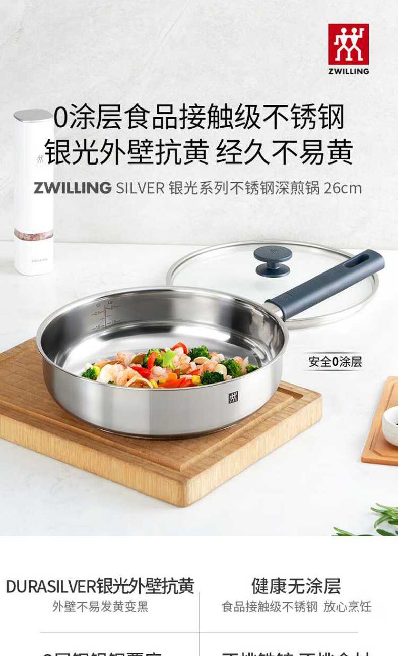 双立人SILVER银光系列26cm不锈钢0涂层深煎锅