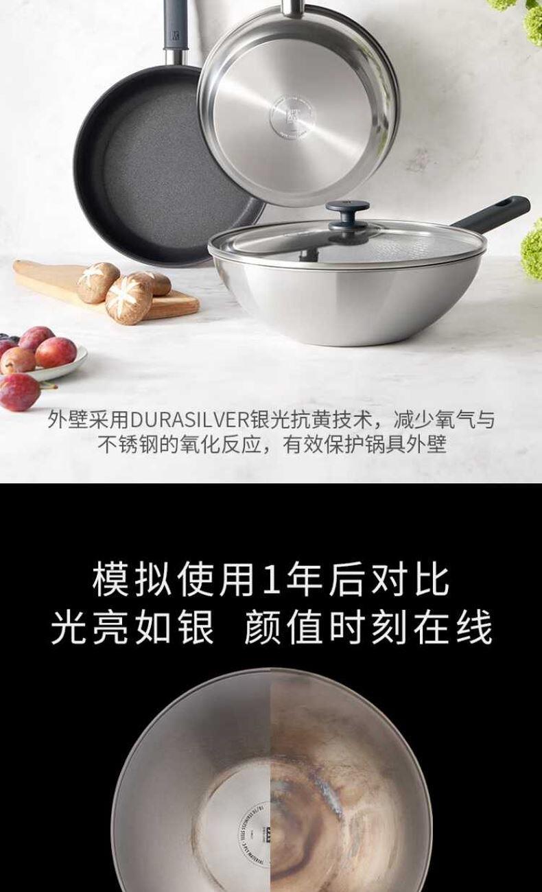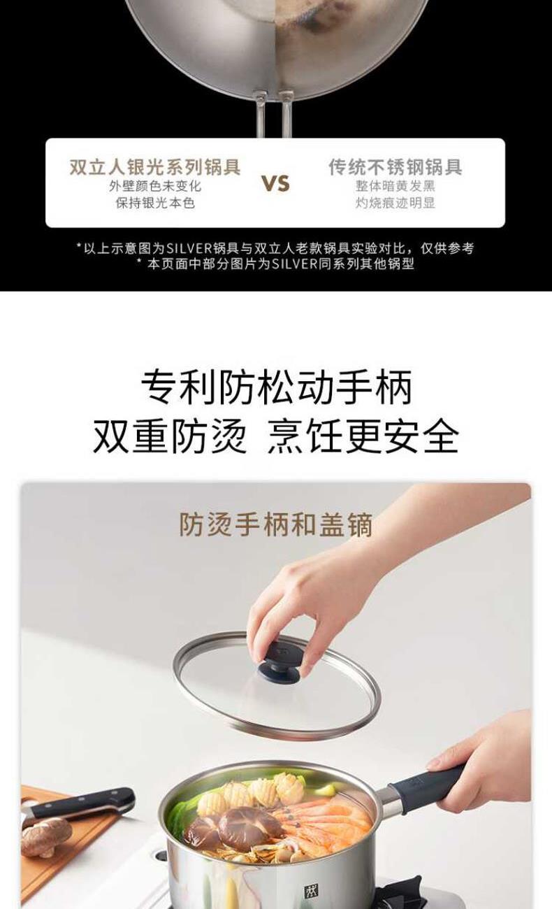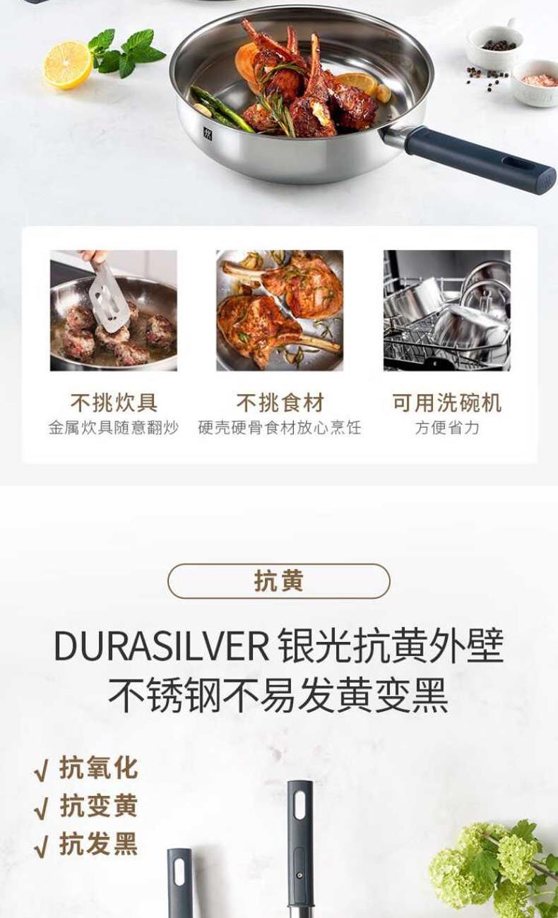 外壁:采用双立人DURASILVER银光抗黄技术,减少氧气与不锈钢的氧化反应,有效保护锅具外壁;常规家庭正常使用下外壁可保持约1-2年*不易发黄变黑。