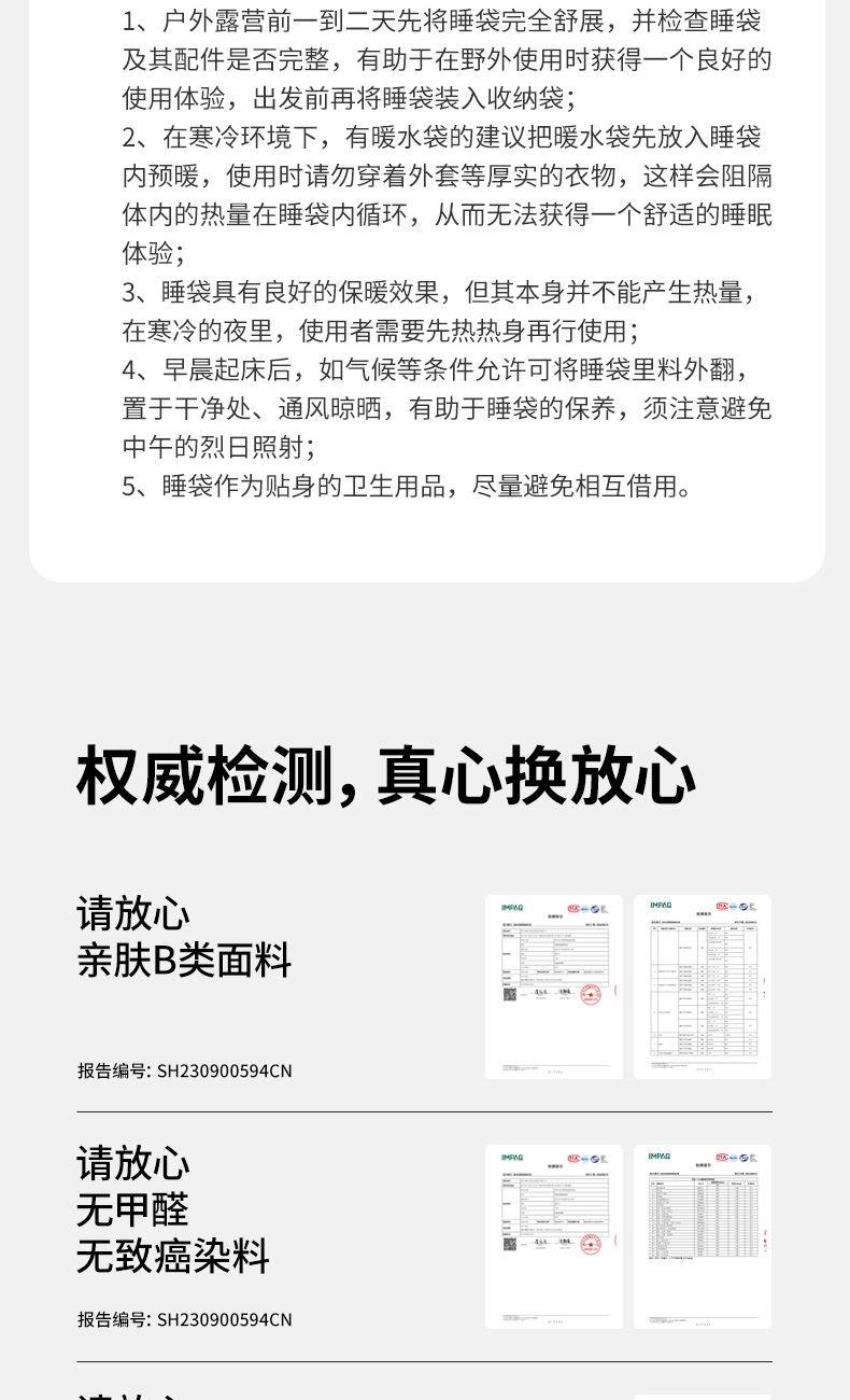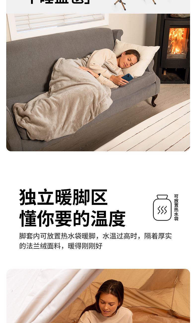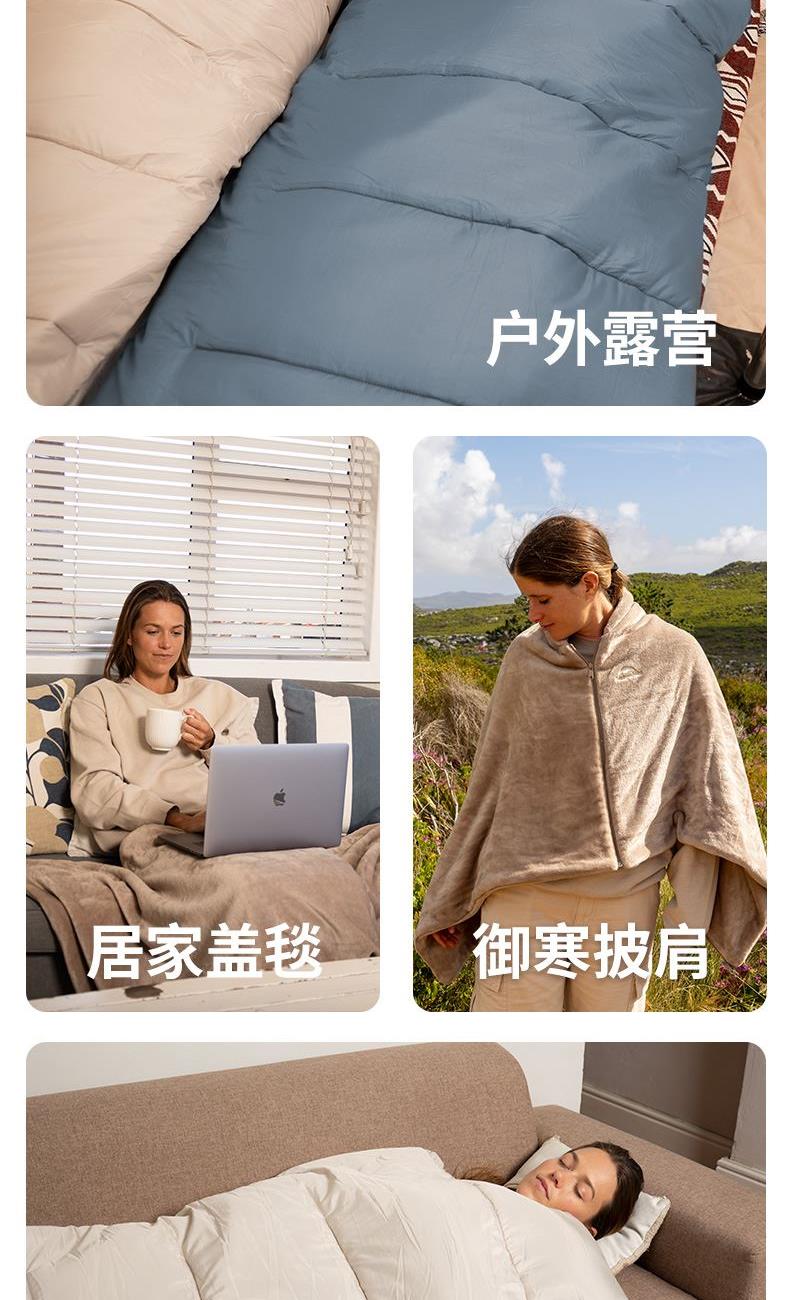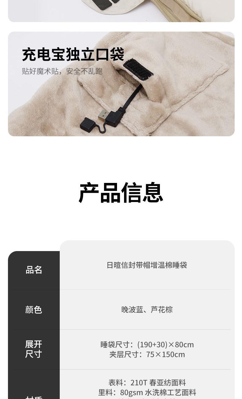 颜色:晚波蓝、芦花棕 展开尺寸:睡袋尺寸:(190+30)x80cm夹层尺寸:75x150cm 材质:表料:210T春亚纺面料里料:80gsm 水洗棉工艺面料填充:定型中空棉夹层:法兰绒面料 *以上所述材质均为聚酯纤维成分