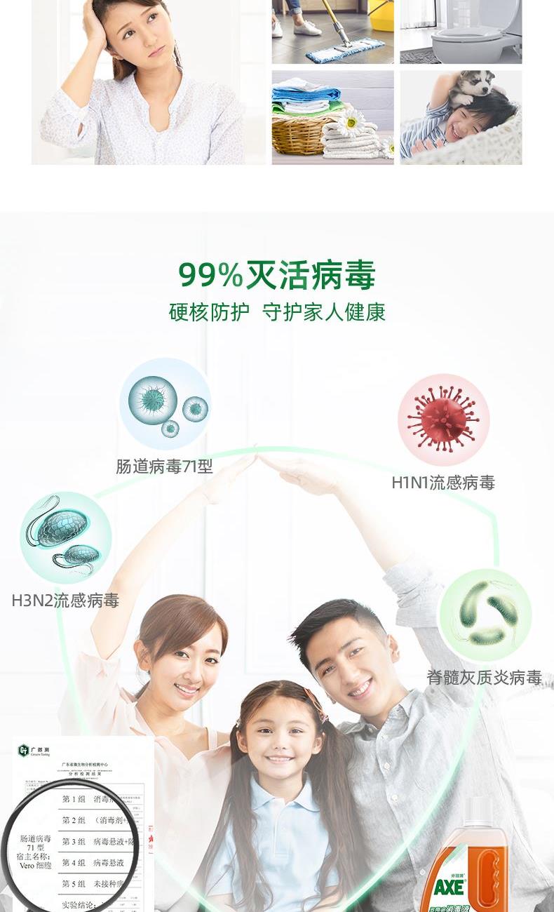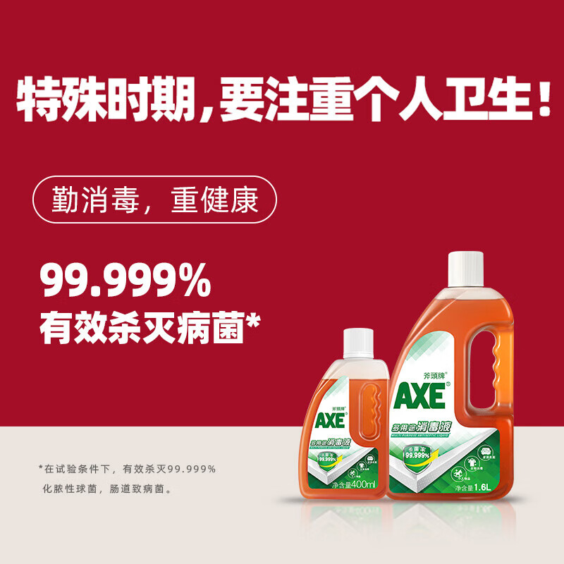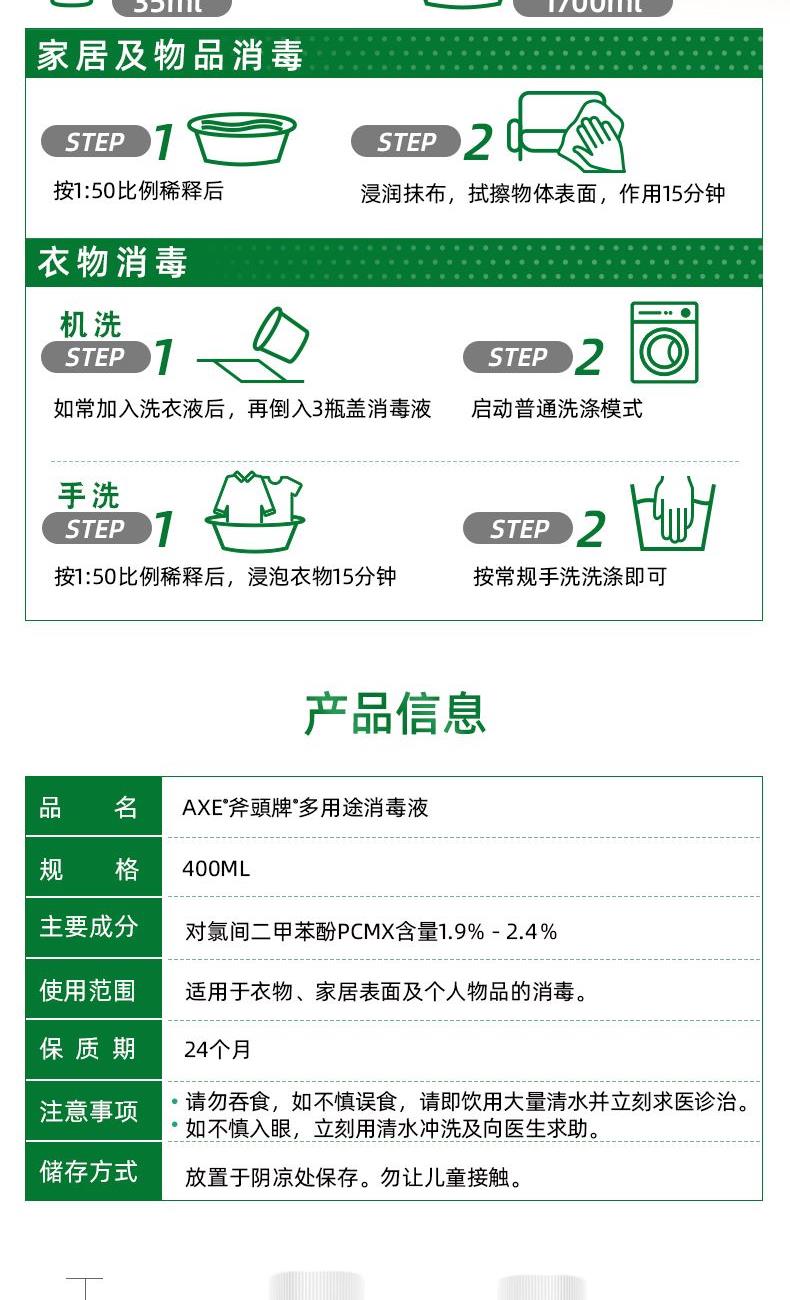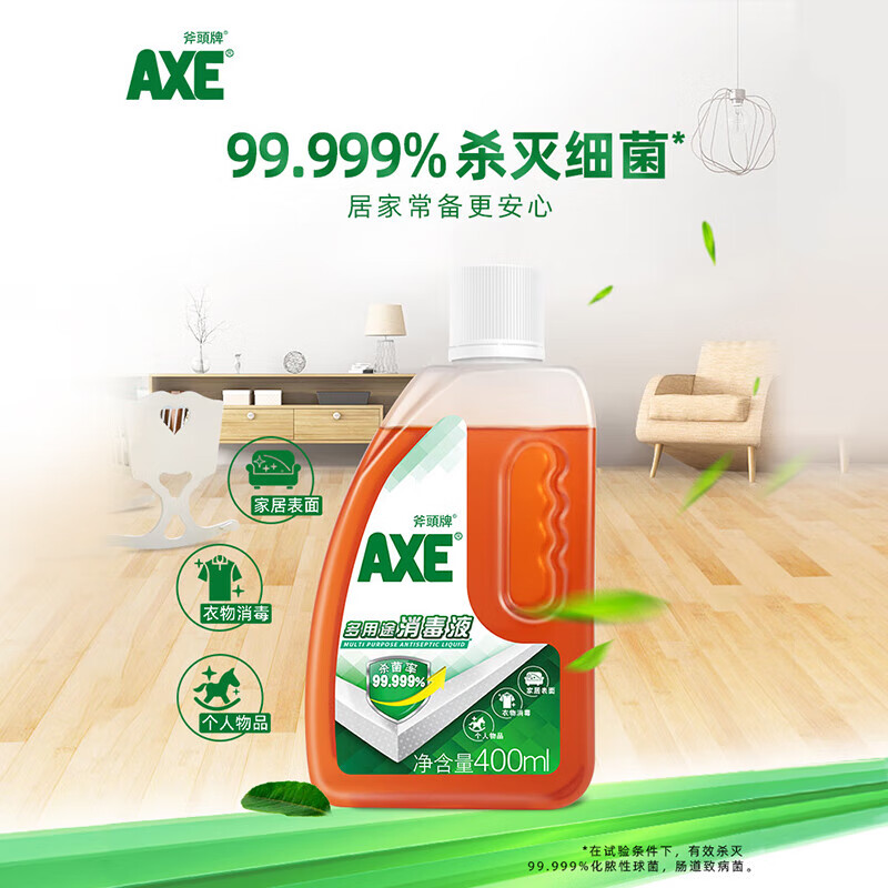 AXE多用途消毒液400ml 使用范围: 适用于衣物、家居表面及个人物品的消毒。 保质期: 24个月 注意事项 请勿吞食,如不慎误食,请即饮用大量清水并立刻求医诊治。 如不慎入眼,立刻用清水冲洗及向医生求助。 储存方式 放置于阴凉处保存。勿让儿童接触。