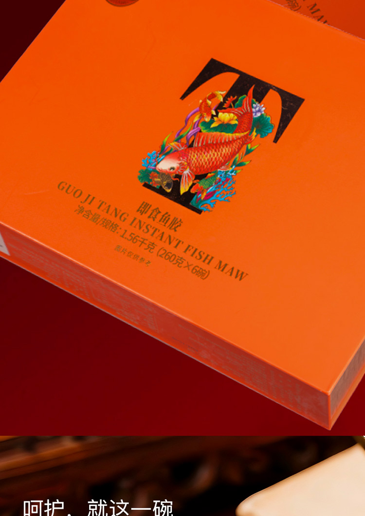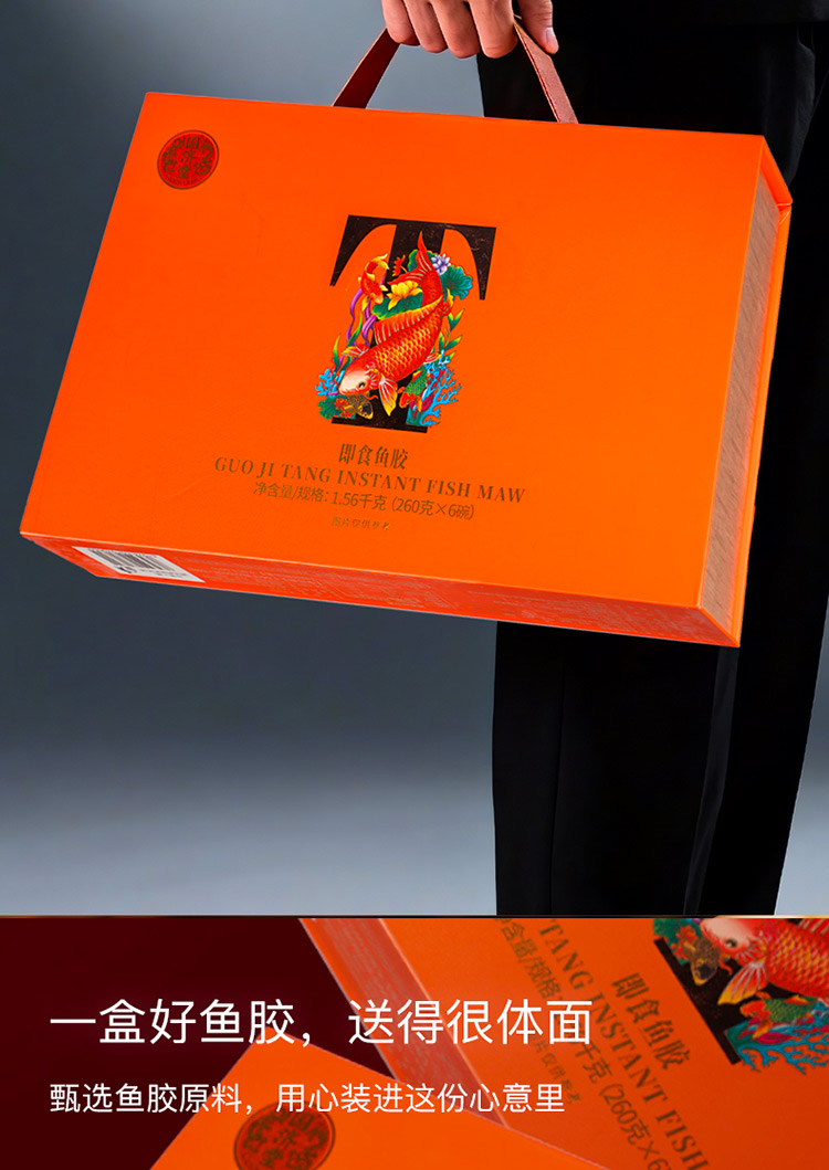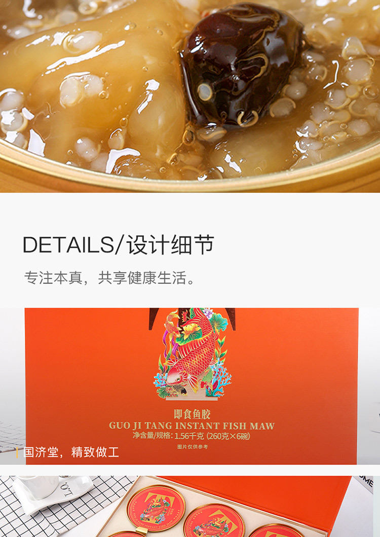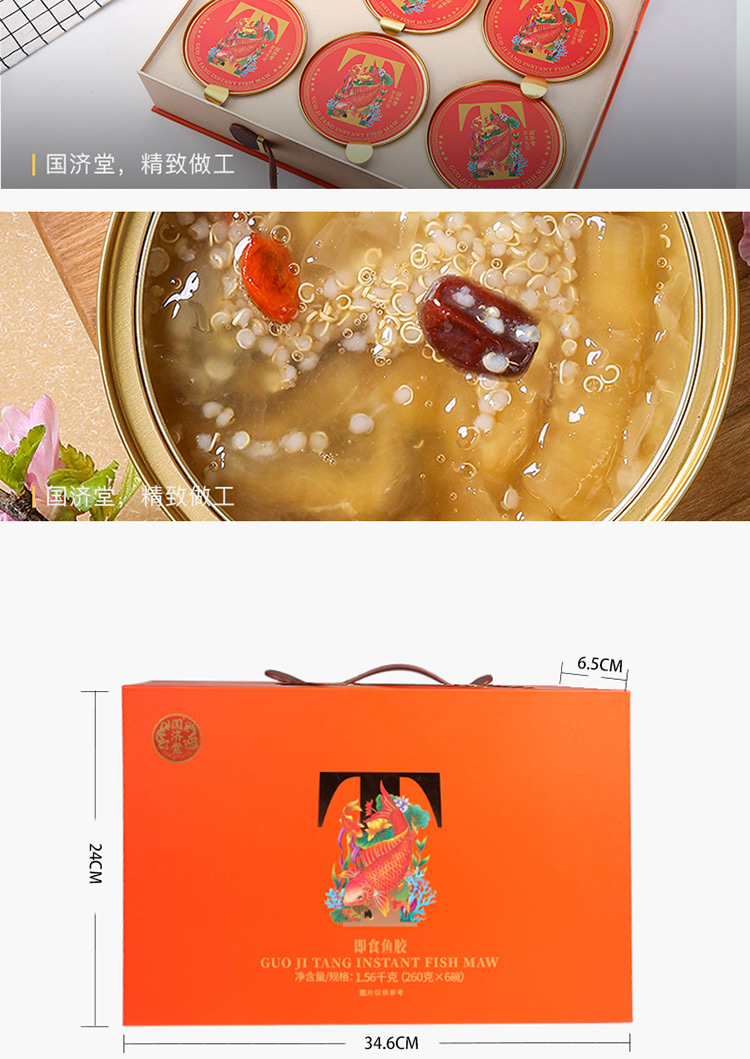 配置:6碗/盒固形物含量≥60% 净含量:260克*6碗 配料:饮用水、藜麦、鱼胶、红枣、枸杞、银耳。 食用方法:开盖即食/加热食用,存放于阴凉干燥处。 产品特点: 国济堂-“T(堂)”系列全新包装设计,采用辨识度极高的亮橙色; 突破传统,开盖即食,滋补养颜;多吃花胶,素颜的你依然很美, 适用于公司福利、银行保险行业中低价段礼品系列,自用送礼俱佳。