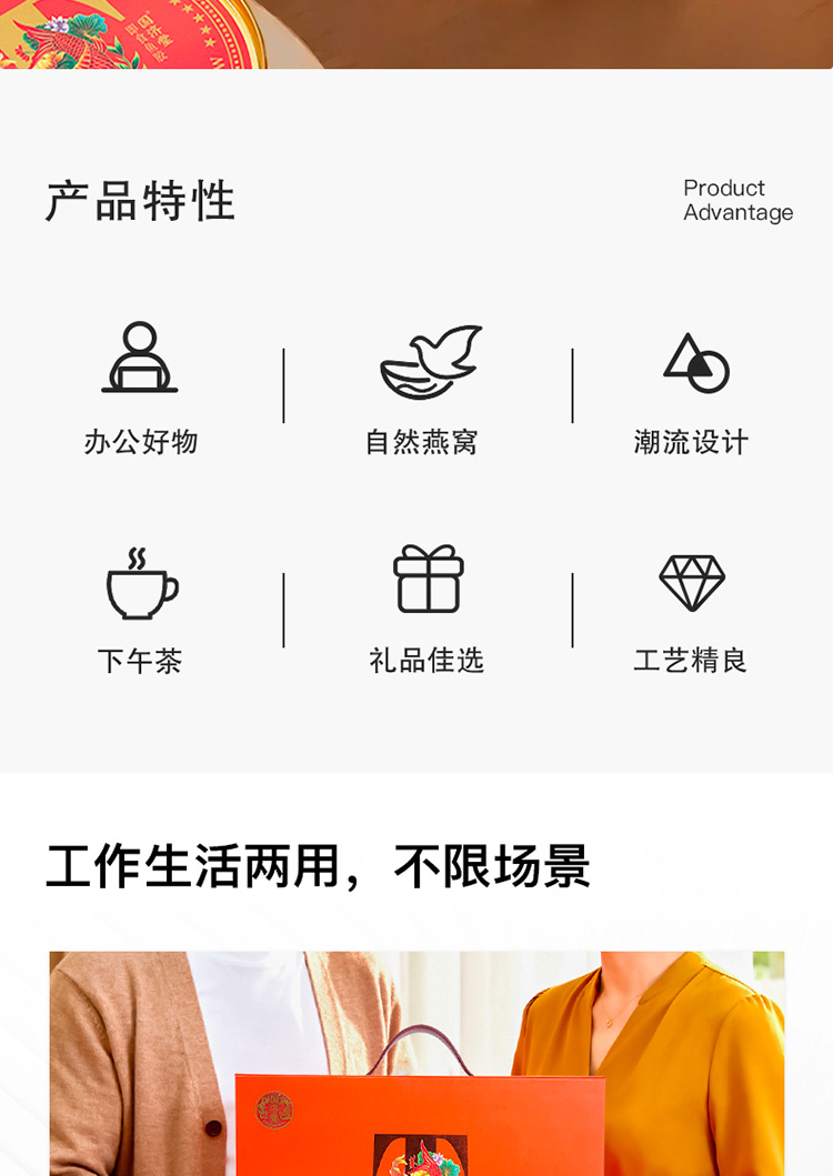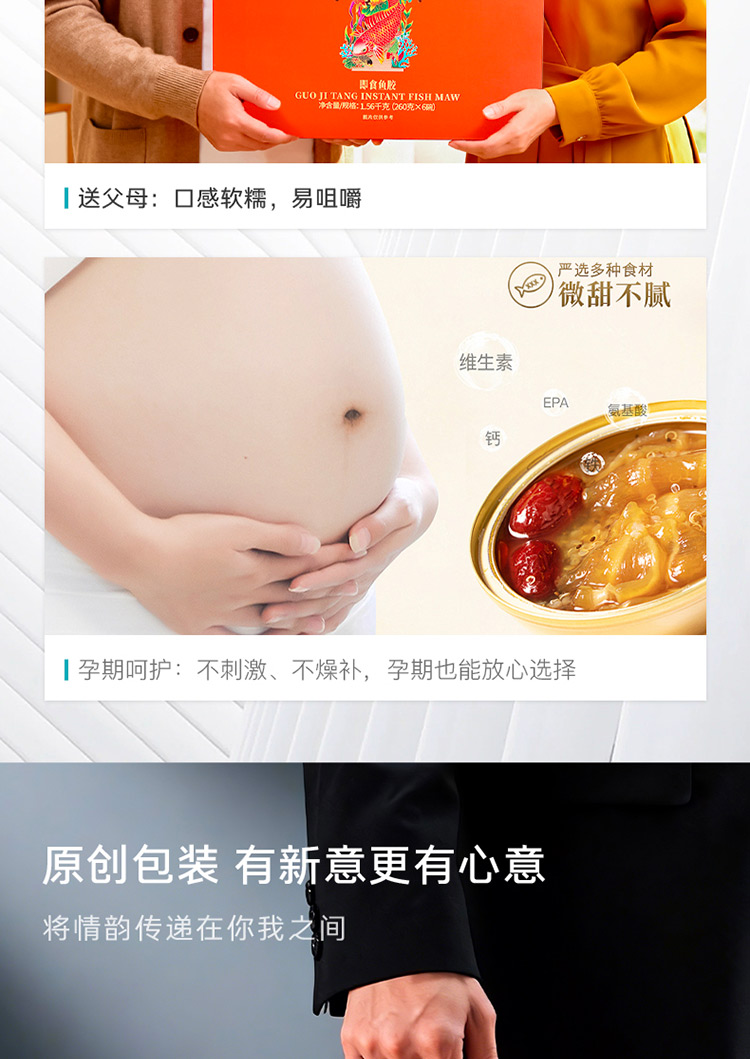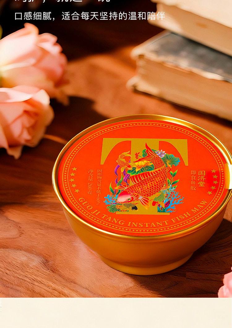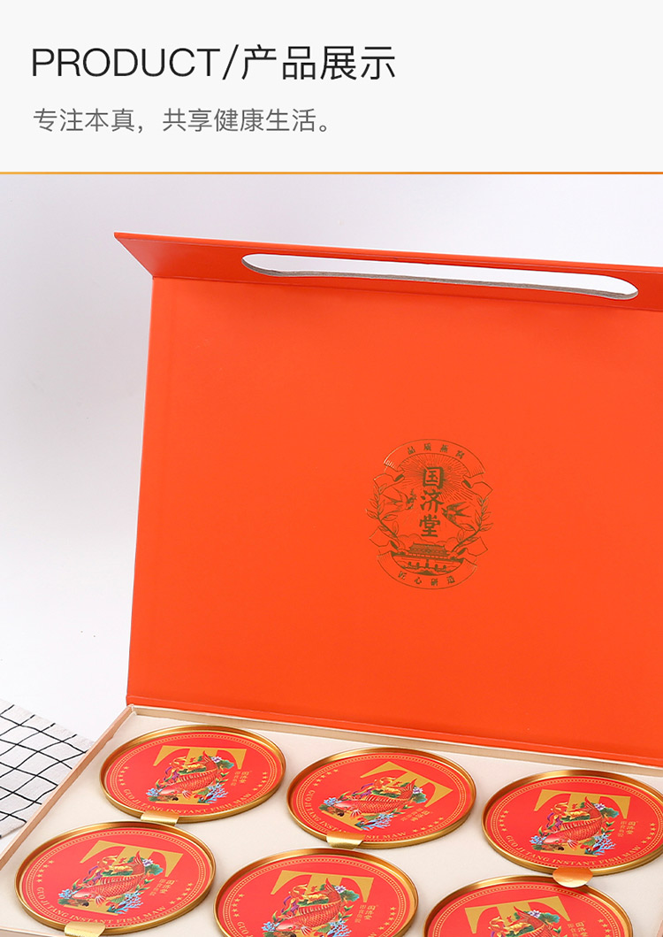 配置:6碗/盒固形物含量≥60% 净含量:260克*6碗 配料:饮用水、藜麦、鱼胶、红枣、枸杞、银耳。 食用方法:开盖即食/加热食用,存放于阴凉干燥处。 产品特点: 国济堂-“T(堂)”系列全新包装设计,采用辨识度极高的亮橙色; 突破传统,开盖即食,滋补养颜;多吃花胶,素颜的你依然很美, 适用于公司福利、银行保险行业中低价段礼品系列,自用送礼俱佳。