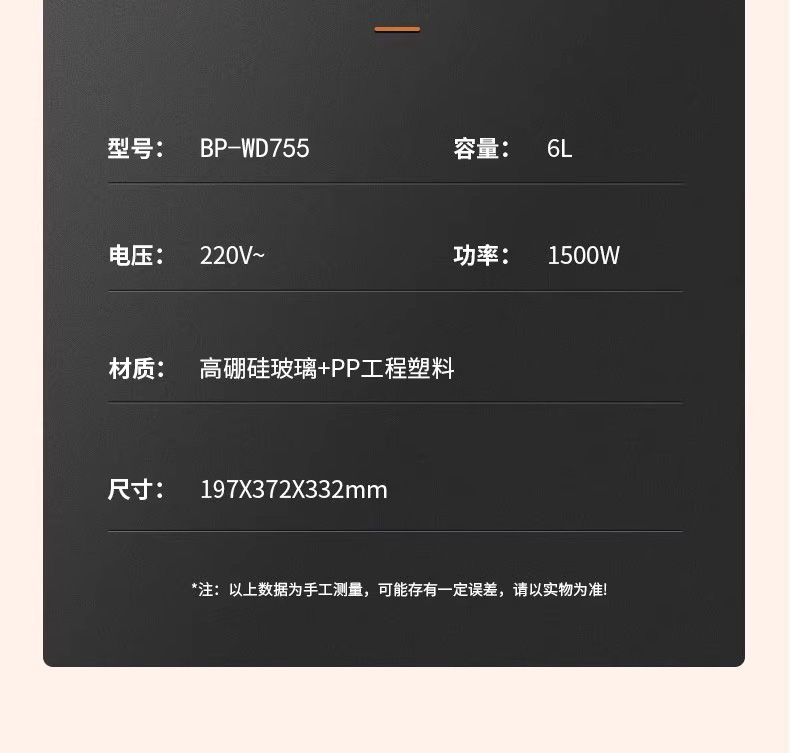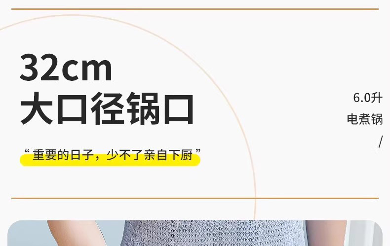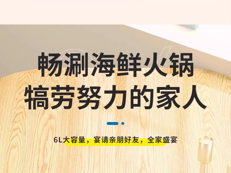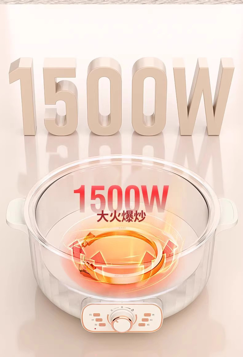 采用食品级不粘涂层,耐磨不粘锅 玻璃盖,烹饪过程一目了然 6L大容量,适合多种需求 防烫手柄设计 旋钮火力控制,使用简单 1500W大功率,快速加热食材 产品材质:不锈钢+ABS+玻璃 额定电压/频率:220V~50Hz 额定功率:1500W 额定容量:6.0L 产品尺寸:385*340*235mm 控制方式:机械控制 彩盒尺寸:350*220*385mm 外箱尺寸:715*395*680mm