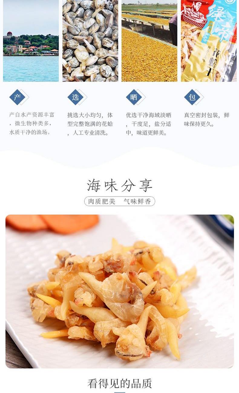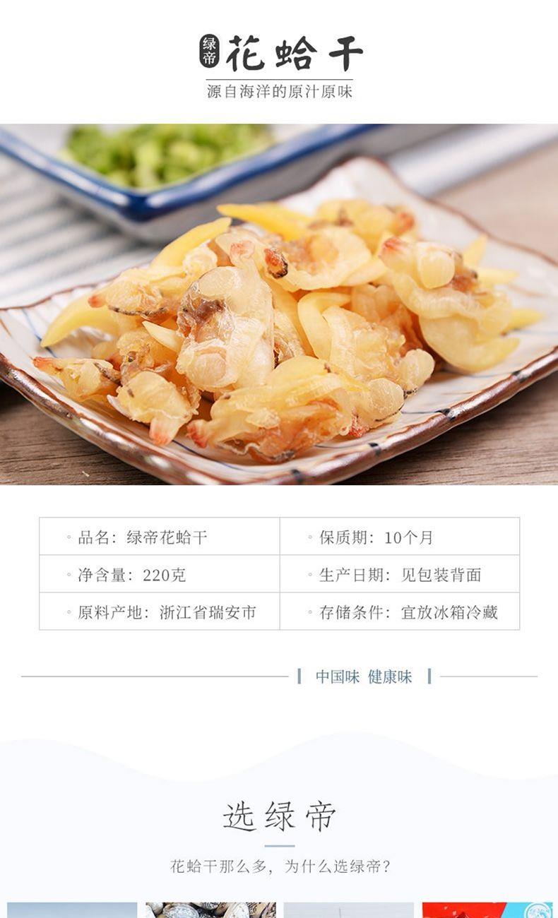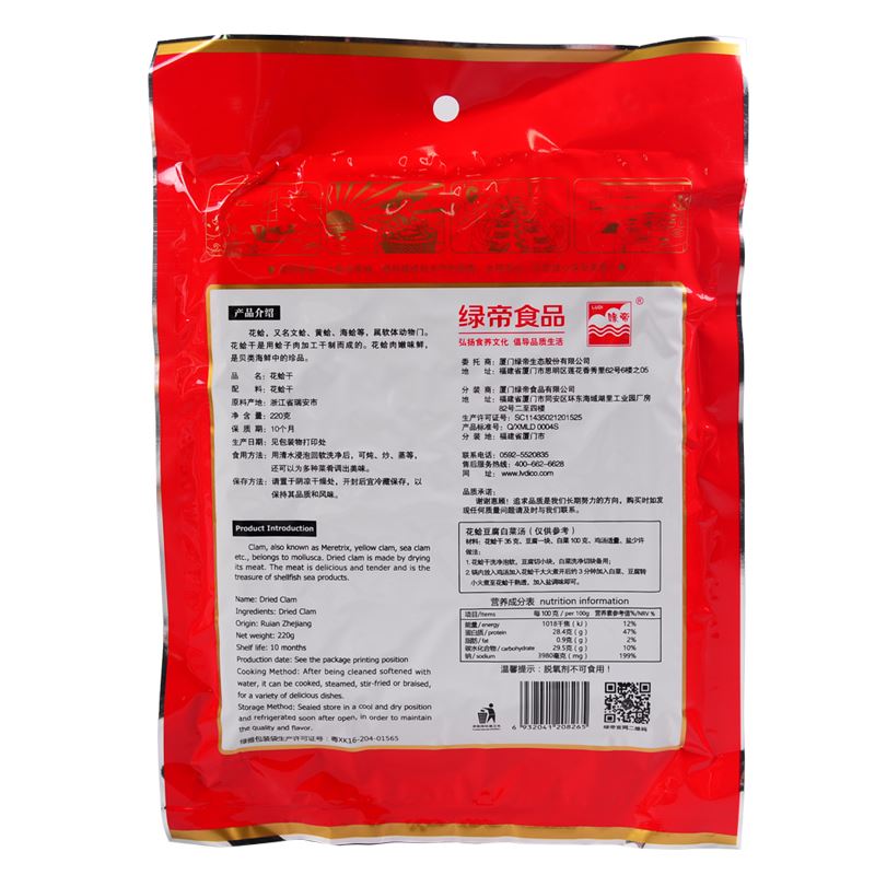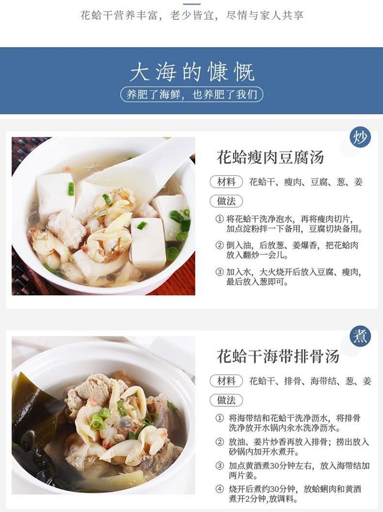 配料:花蛤干 原料产地:浙江省瑞安市 净含量:220克 保质期:10个月 生产日期:见包装物打印处 食用方法:用清水浸泡回软洗净后,可炖、炒、蒸等,还可为多种菜肴调出美味。 花蛤,又名文蛤、黄蛤、海蛤等,属软体动物们。花蛤干是用蛤子肉加工干制而成的。花蛤肉嫩味鲜,是贝类海鲜中的珍品。