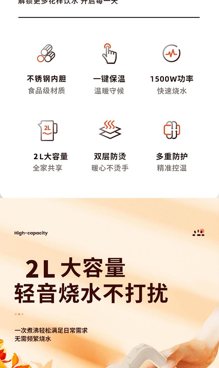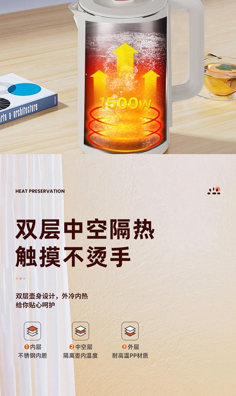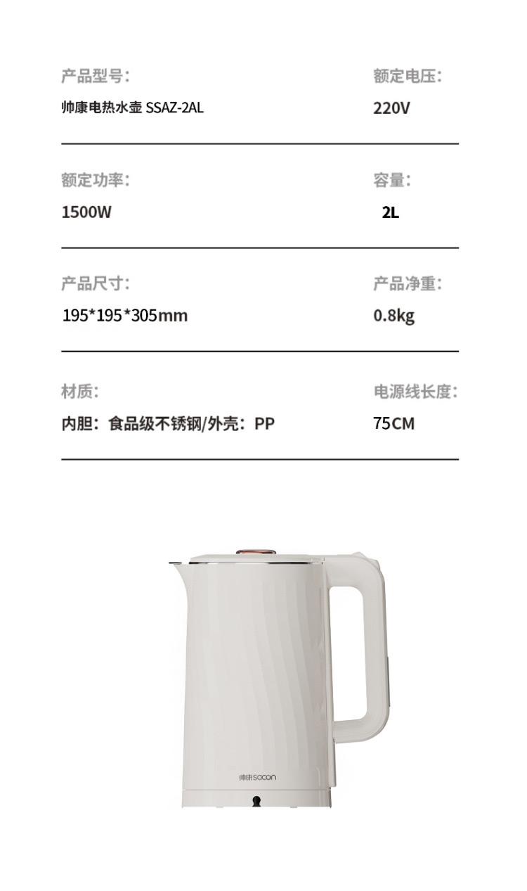 容量:2L 认证型号:SSAZ-2AL 颜色:白色系 适用场景:家用 额定电压:220V 额定功率:1500W 类型:电热水壶 特征特质:双层防烫 功能:自动断电防干烧 开盖方式:弹盖