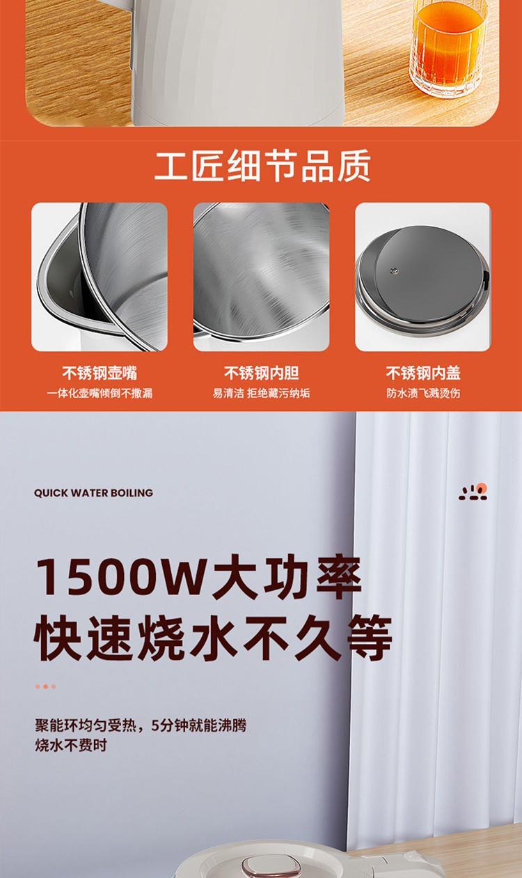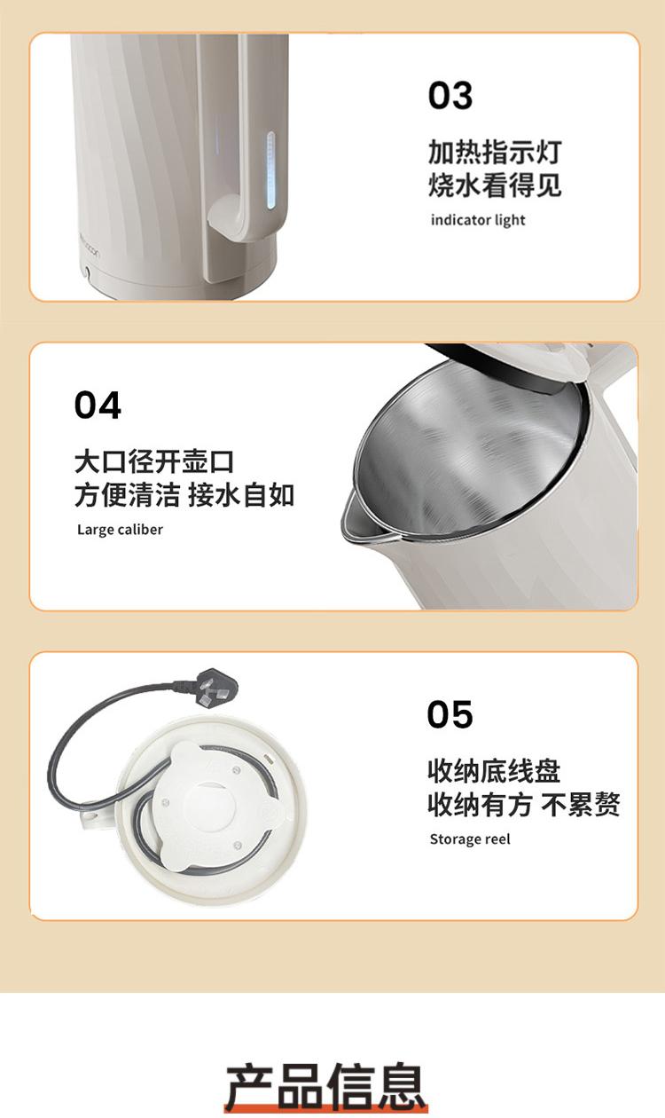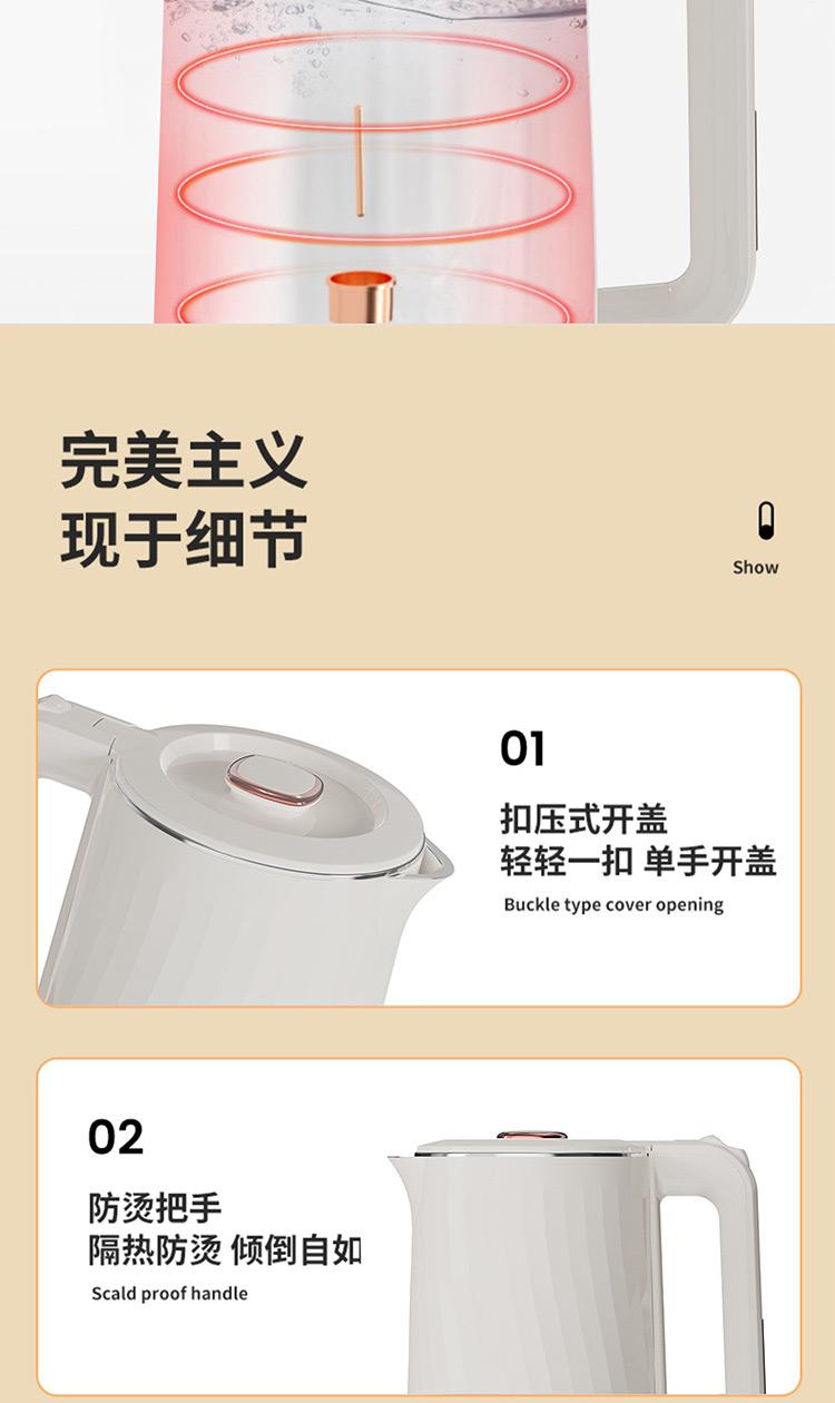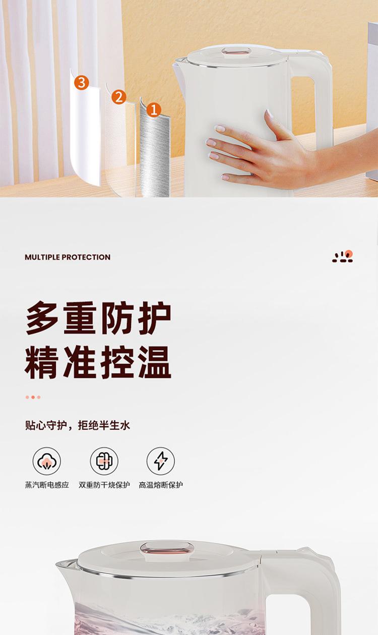 容量:2L 认证型号:SSAZ-2AL 颜色:白色系 适用场景:家用 额定电压:220V 额定功率:1500W 类型:电热水壶 特征特质:双层防烫 功能:自动断电防干烧 开盖方式:弹盖
