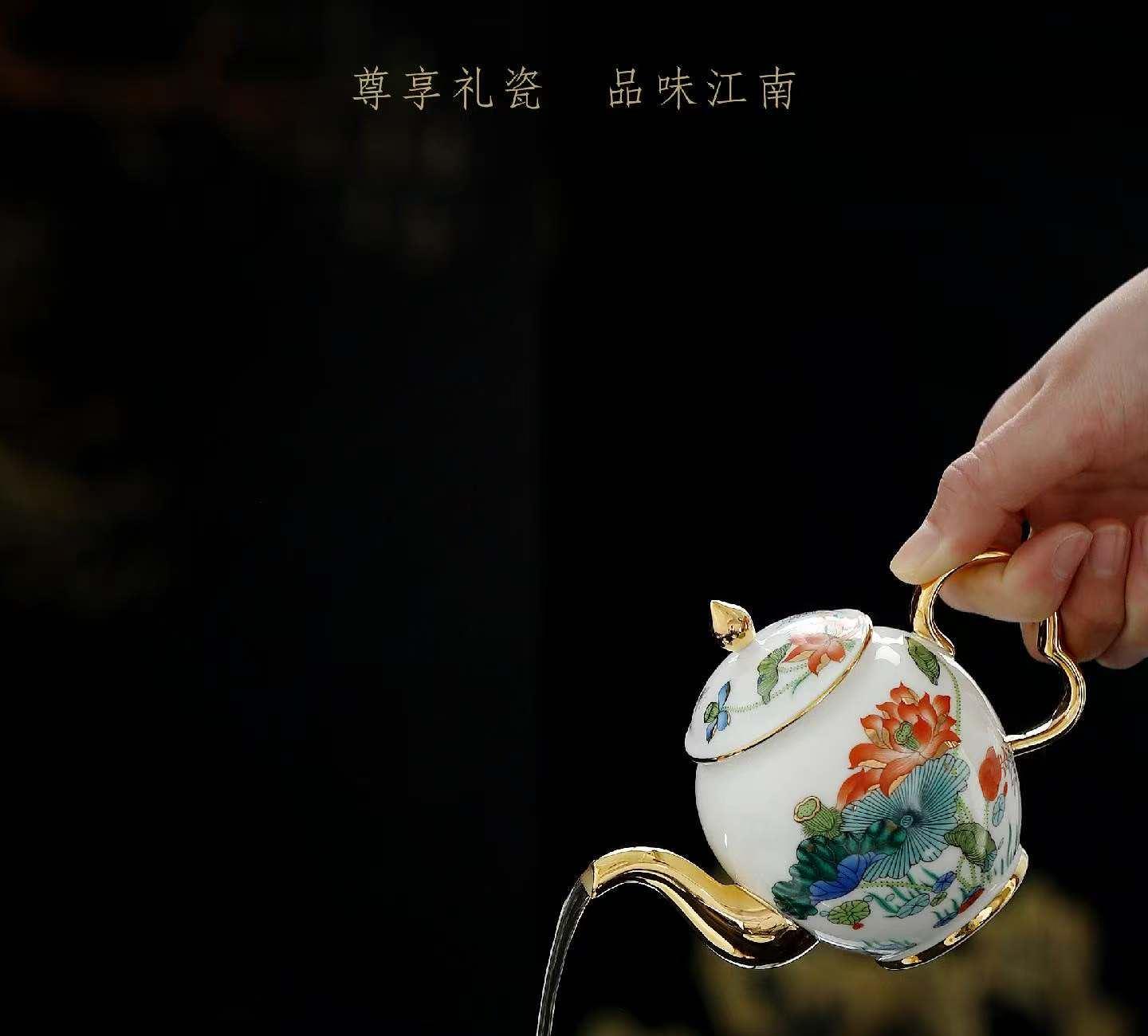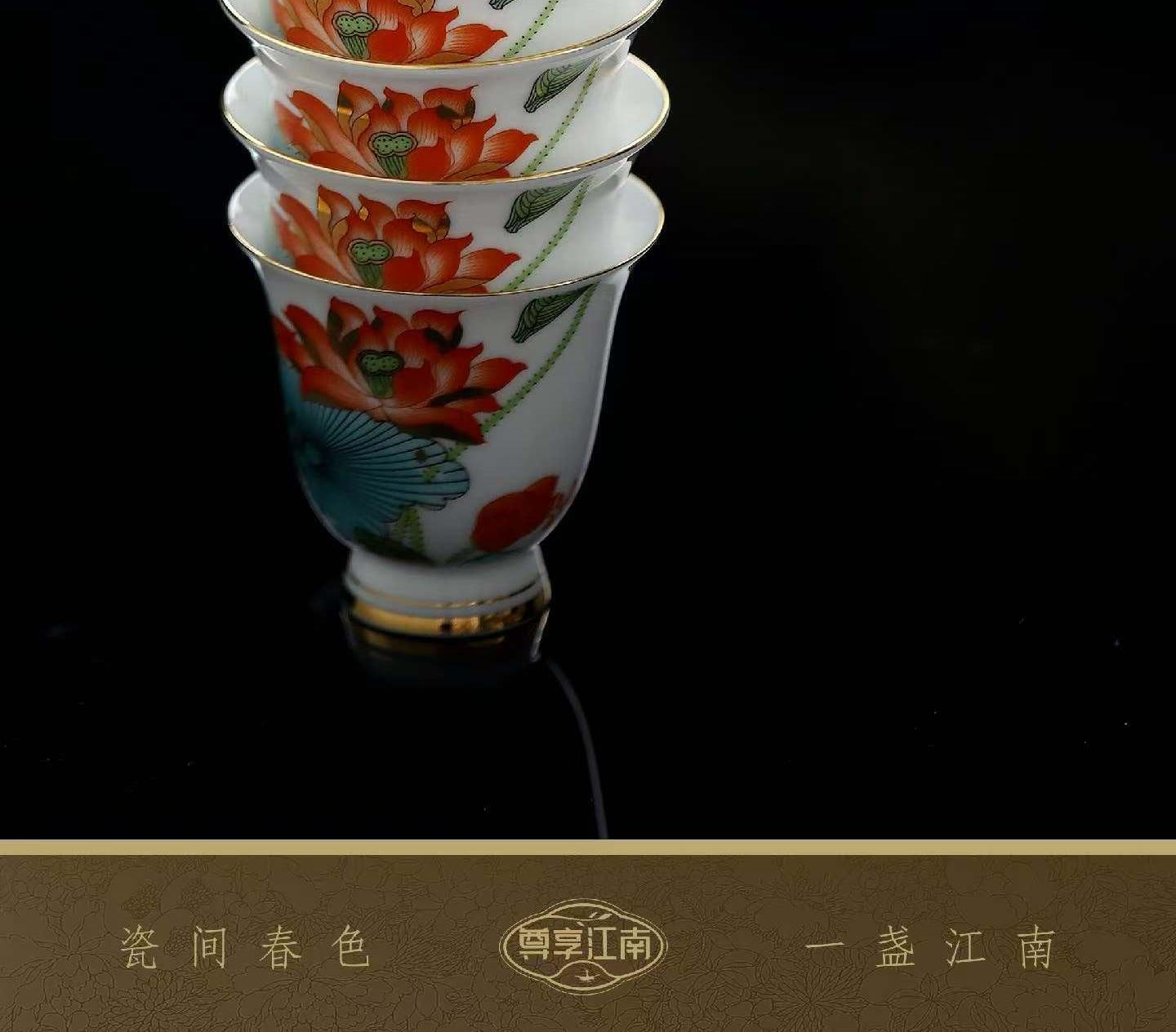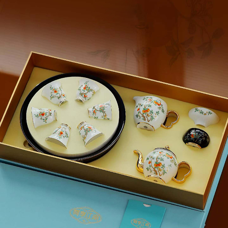尺寸:茶壶长15cm高10cm 容量230ml, 茶杯长5.7cm高5.5cm容量45ml, 公道长12cm高8cm容量215ml, 茶漏长7.8cm高6.3cm, 茶盘长25cm 高6.3cm。 礼盒:长52cm宽13cm高28cm, 礼袋:长53cm宽13.5cm高30cm。 款式:锦绣芳华/柿柿如意/步步生莲。