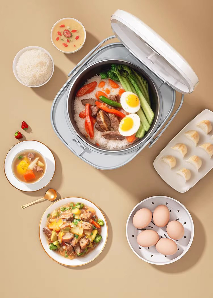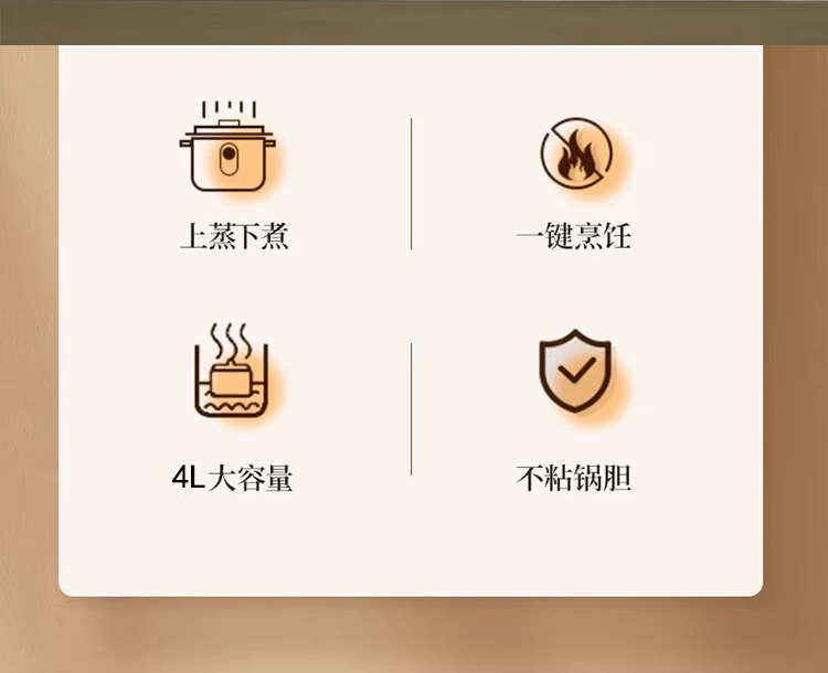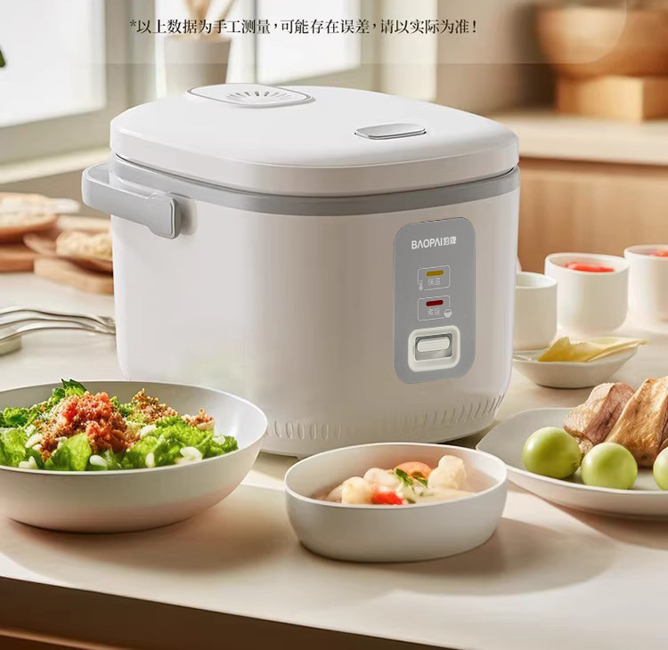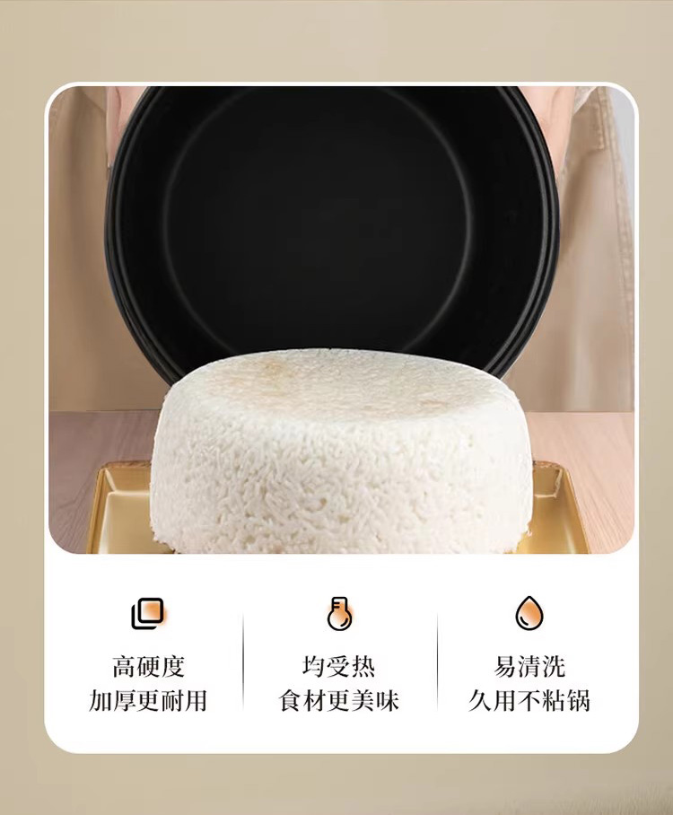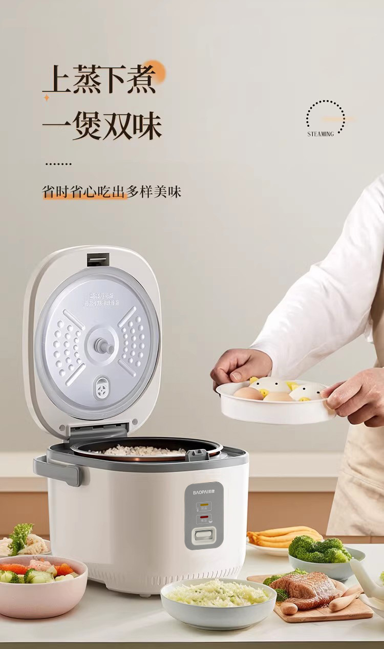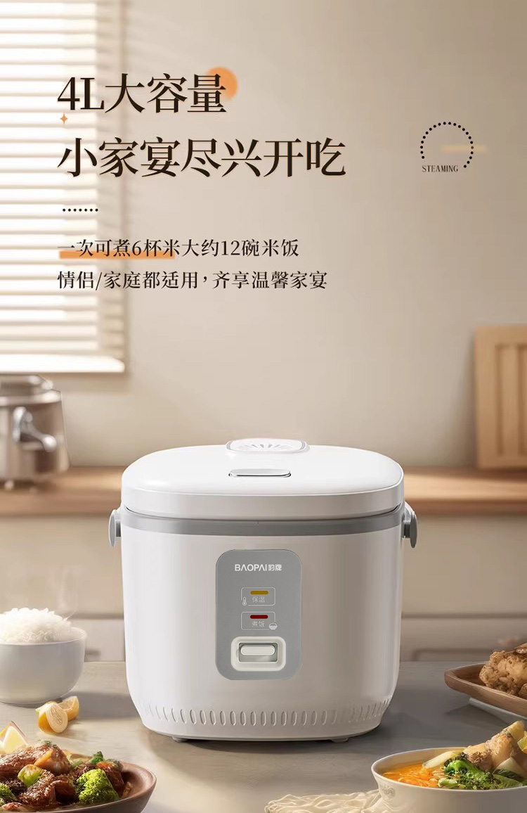 自带提手,方便省力 聚能不粘内胆,激发米饭醇香 4L大容量,适合多种需求 按压弹跳简单操作,使用方便 700W火力,受热均匀 产品材质:不锈钢+铝合金+PP 额定功率:700W 额定电压: 220V~ 额定频率: 50Hz 额定容量:4L 产品毛重:2.85Kg 产品尺寸:313*263*247mm 包装尺寸:328*279*255mm 外箱尺寸:858*345*538mm