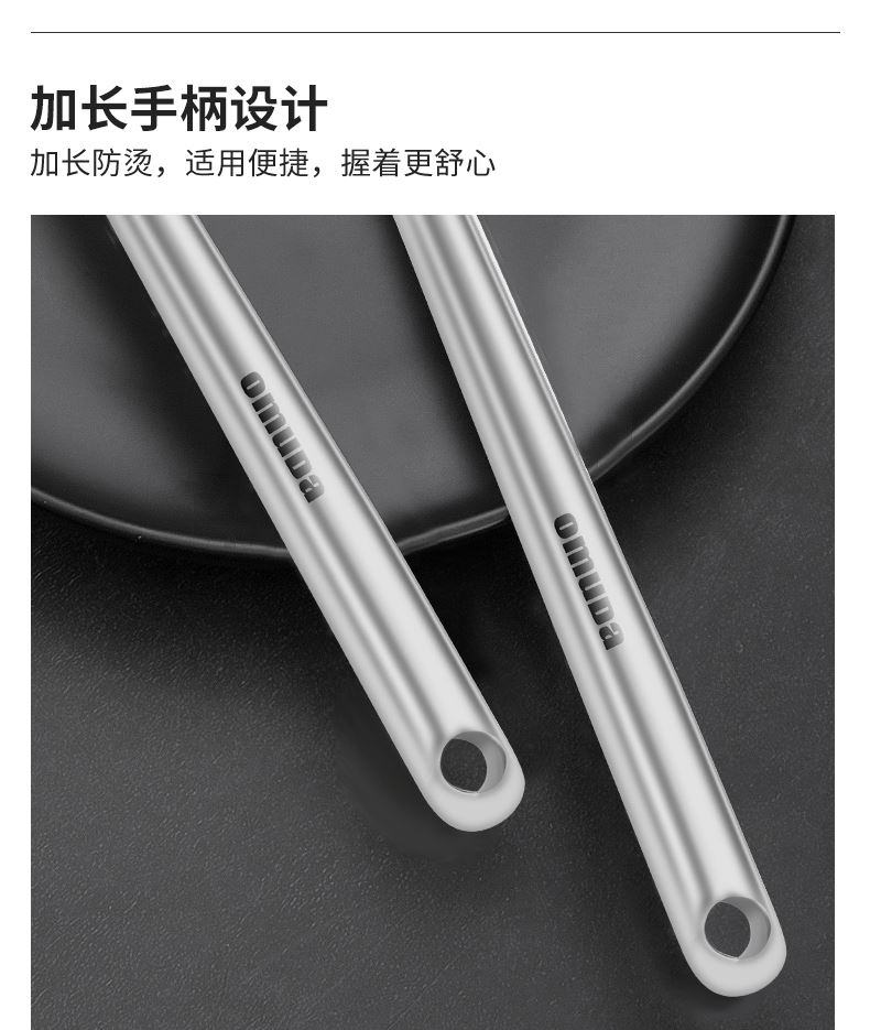 尺寸:33.5cm 净重:0.12kg 材质:304不锈钢 ①采用优质304不锈钢材质,坚固耐用,人体工程学手柄设计,防热隔烫,手感更舒适 ②选砂光工艺处理,不易产生刮痕,圆筒状手柄便于抓握,带给您便捷的烹饪体验 ③整体不锈钢材质,易清洁,无卫生死角,耐腐蚀、安全卫生