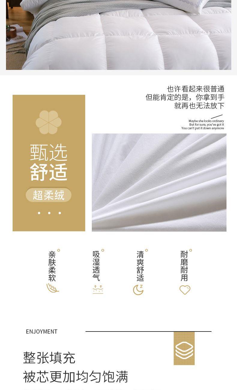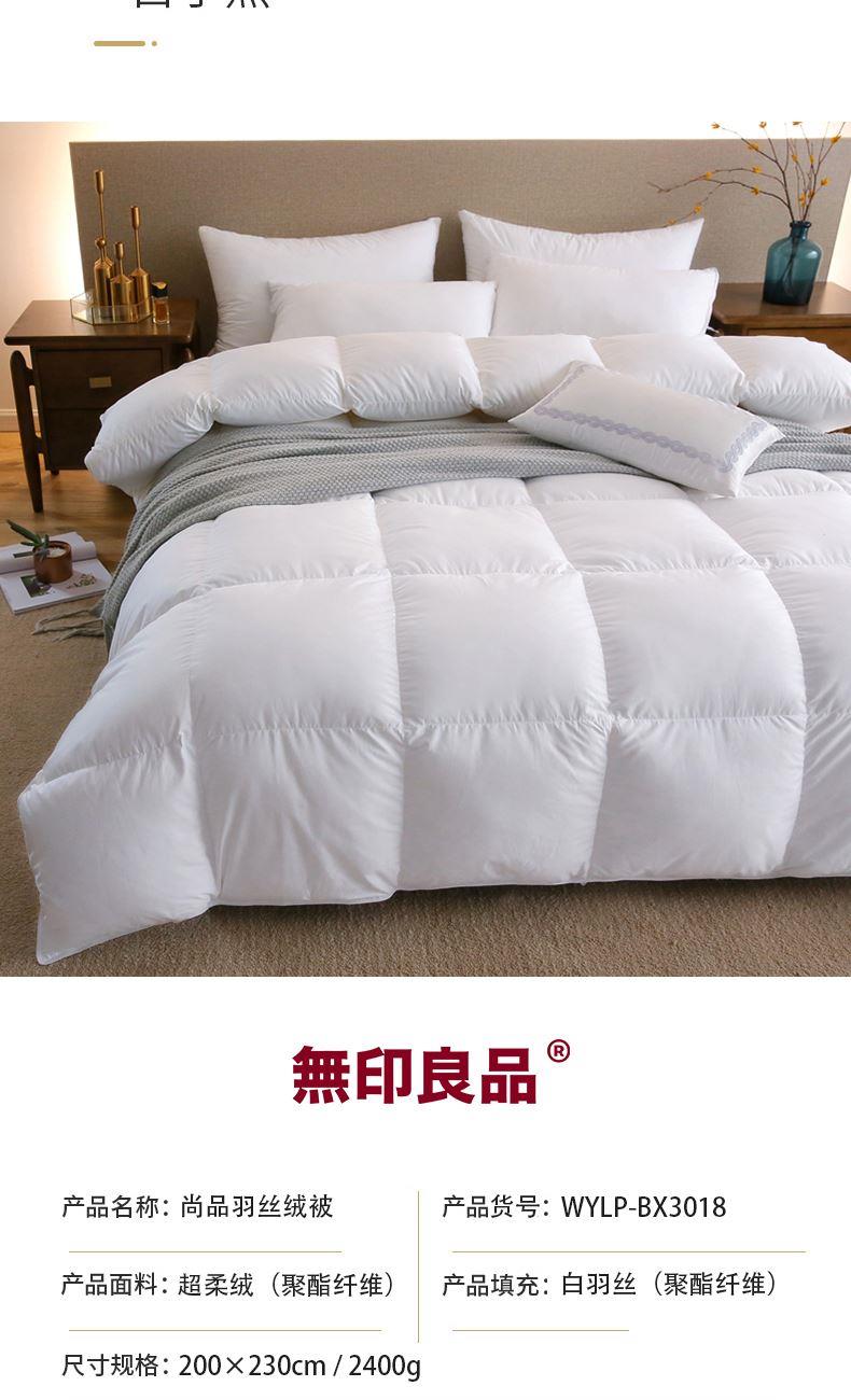 规 格:200×230cm 克重:2400g 面 料:超柔绒(聚酯纤维) 填 充:白羽丝(聚酯纤维) “無印良品”大染无印,优良品质的产品是年轻人喜欢的,“無印”设计, 优雅 , 质朴 , 自然 , 是無印良品的初心与追求。让体验更舒适。享受简约健康生活,走进無印,上善若水,大爱无疆,创新让生活更精彩。